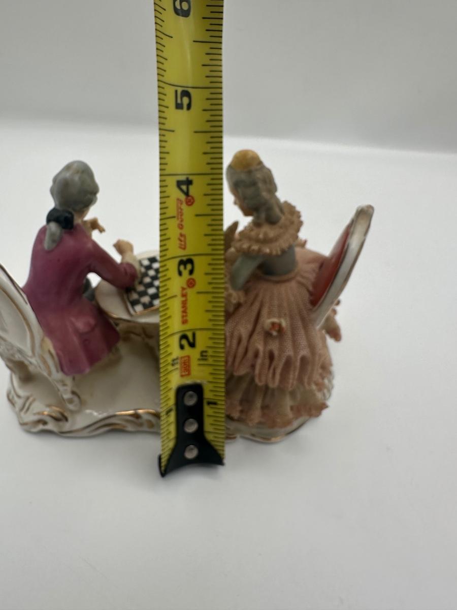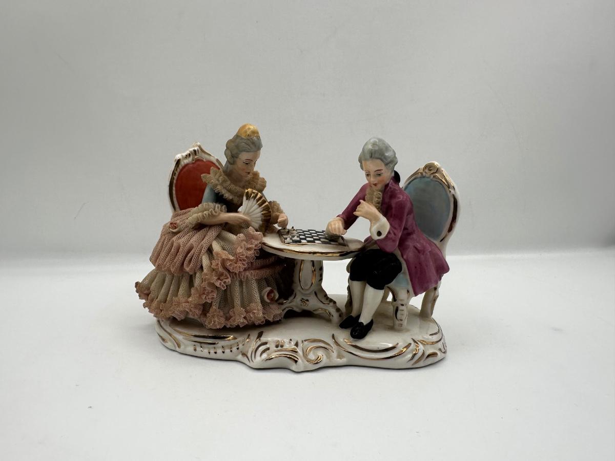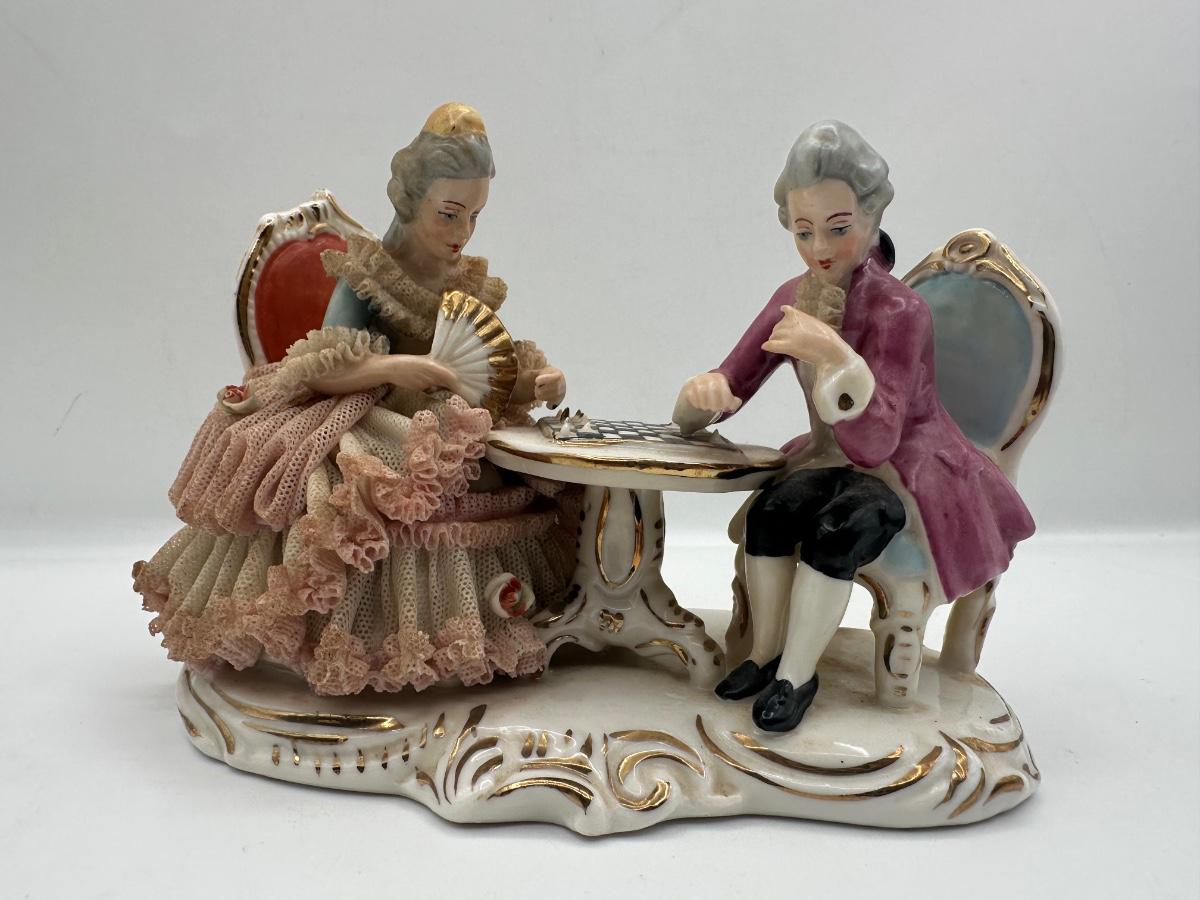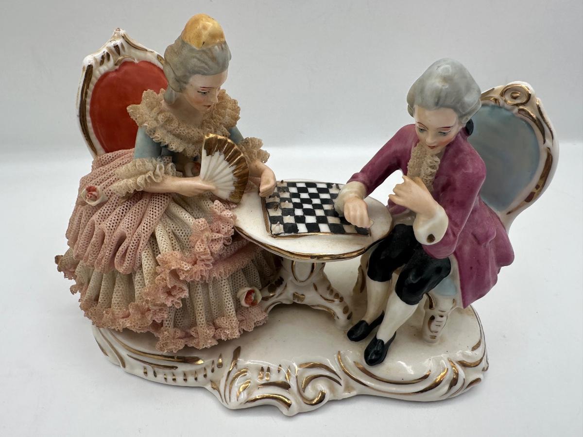 Dresden Porcelain Lace Figurine: Victorian Chess Couple