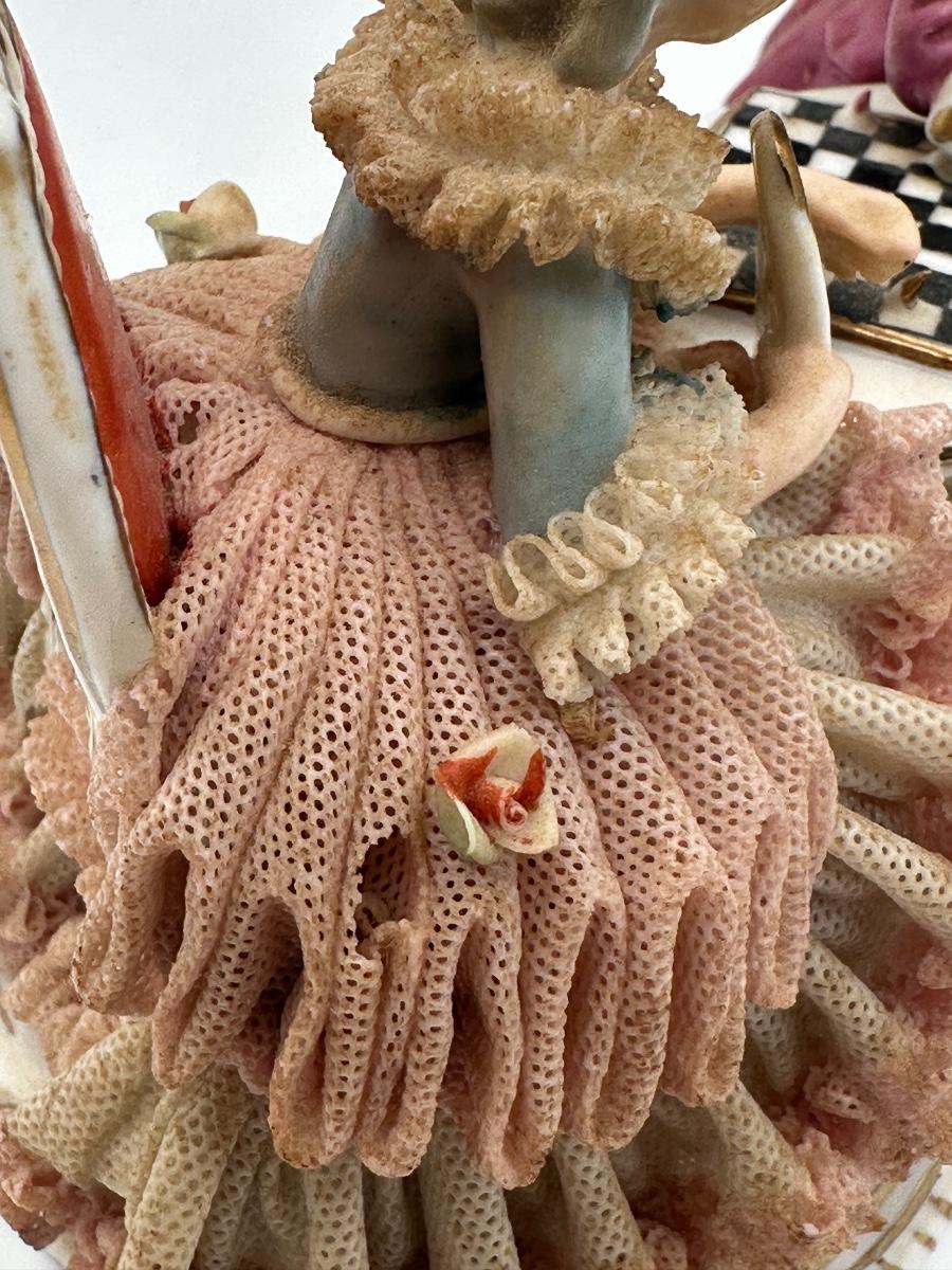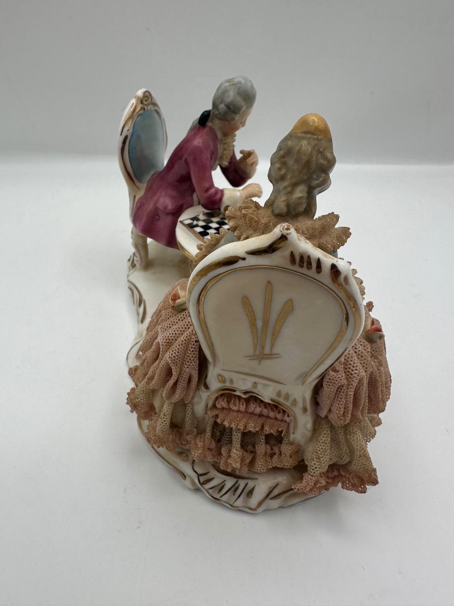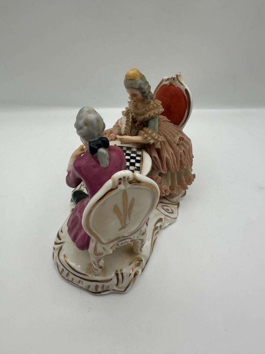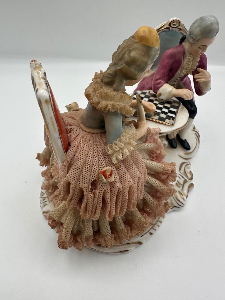 Dresden Porcelain Lace Figurine: Victorian Chess Couple