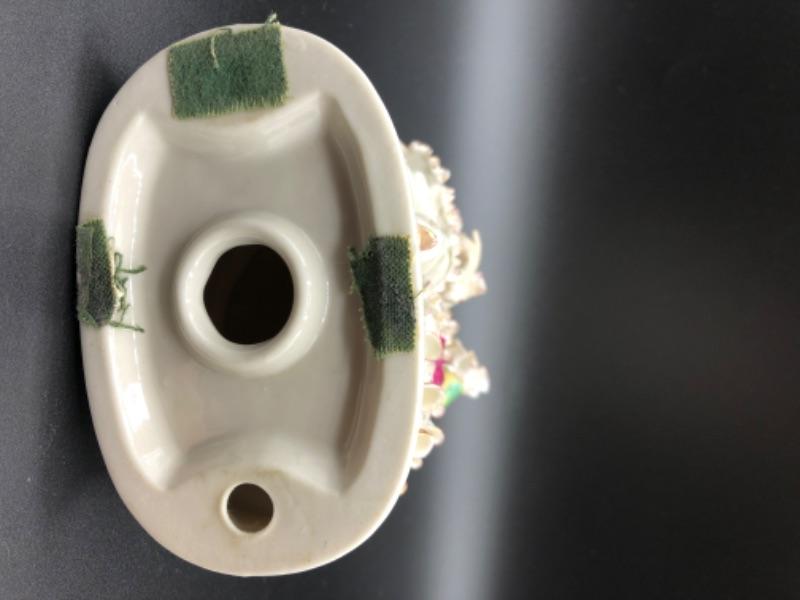 In very good condition don’t see any cracks or chips. 7 inches tall. Can’t tell if there’s a label or mark because there’s felt on the bottom.