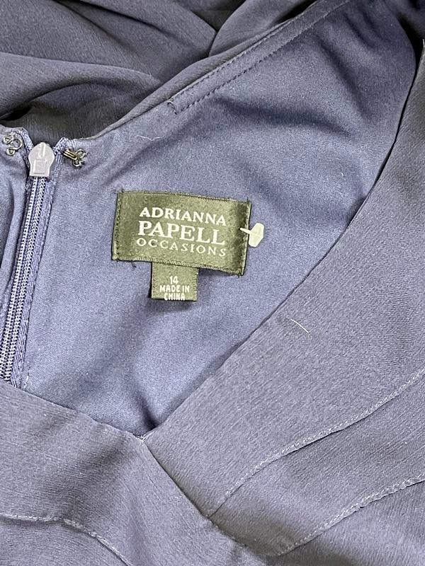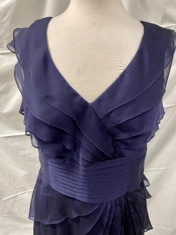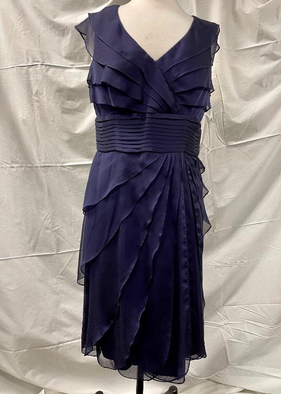 Navy blue sleeveless dress by Adrianna Papell Occasions. Sheer navy blue layers give a flattering look to any shape. Size medium. Below the knee length.