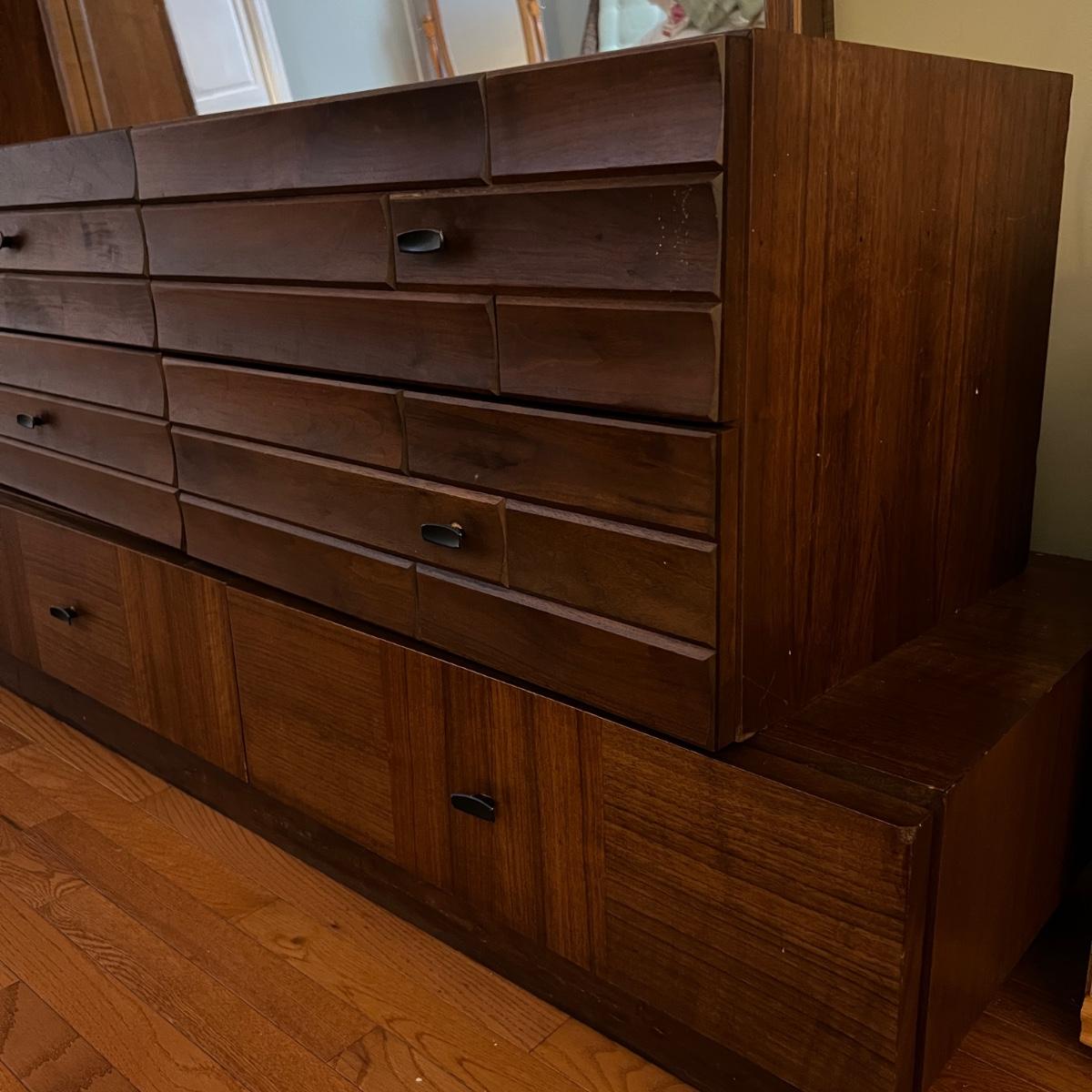 This has 2 pieces with separate top and bottom. We have a full bedroom set including a tall dresser, 2 nightstands, and headboard. See lots 14, 15, 24. Mid Century Modern design, made in Canada 1972.