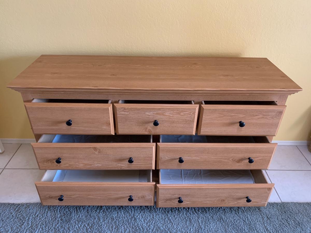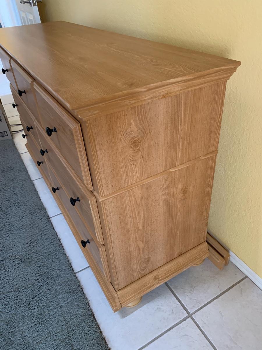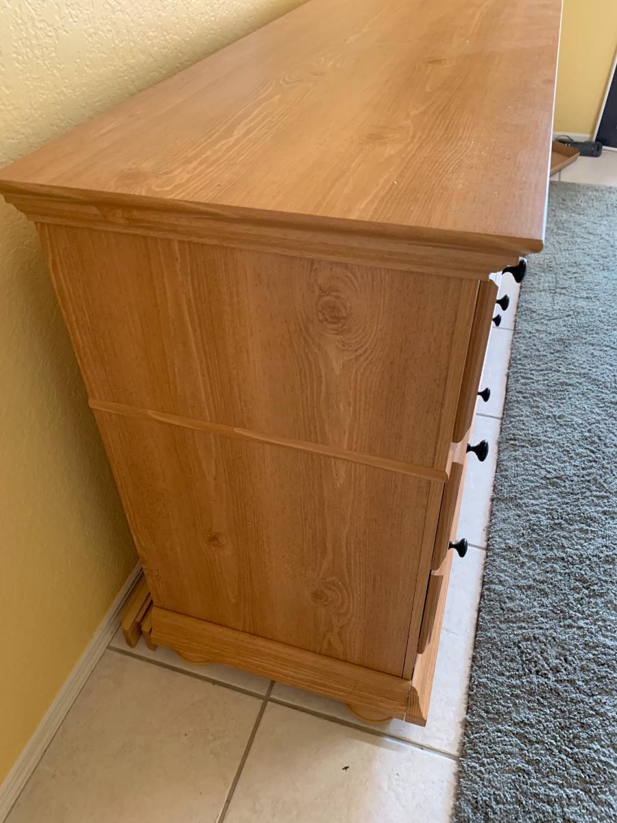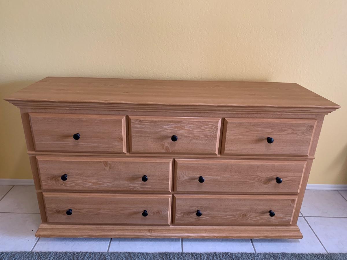 Dresser by Perdue. Laminate over wood, slight reddish hue like a cherry wood color. 7 drawers. Great Condition! 58.5” wide x 18” deep x 33” tall