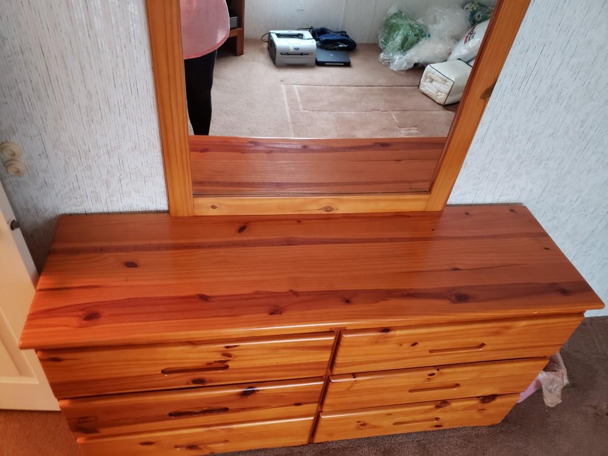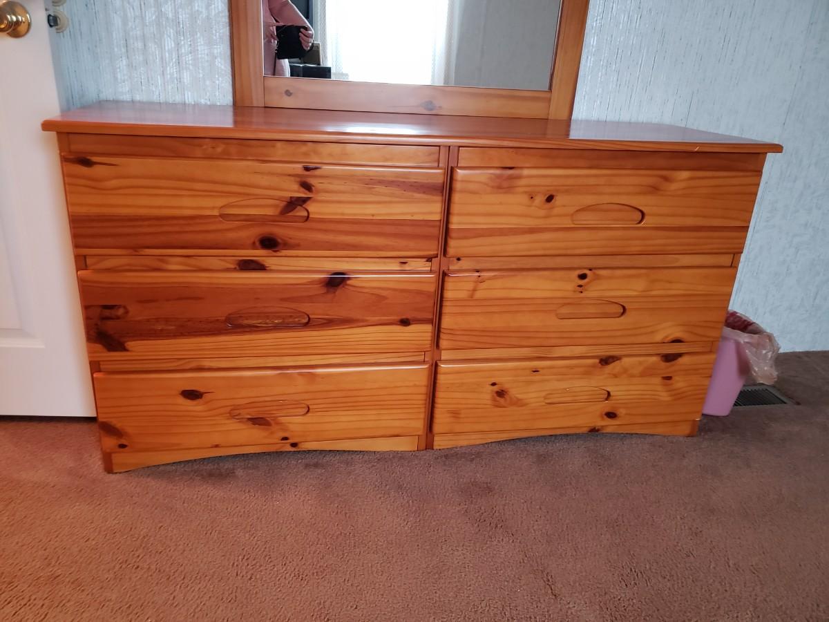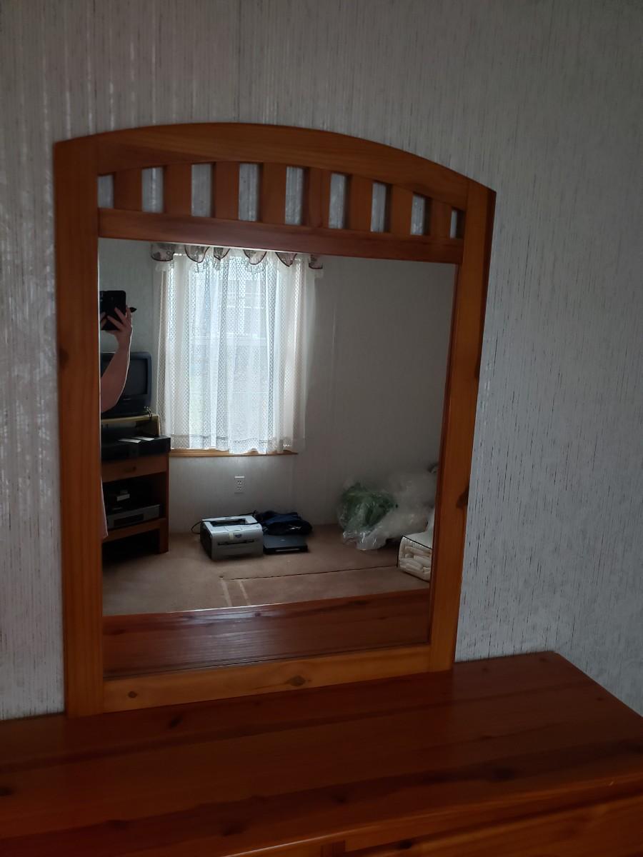 6 drawer dresser measures 58x17x29. Mirror measures 34x46.
