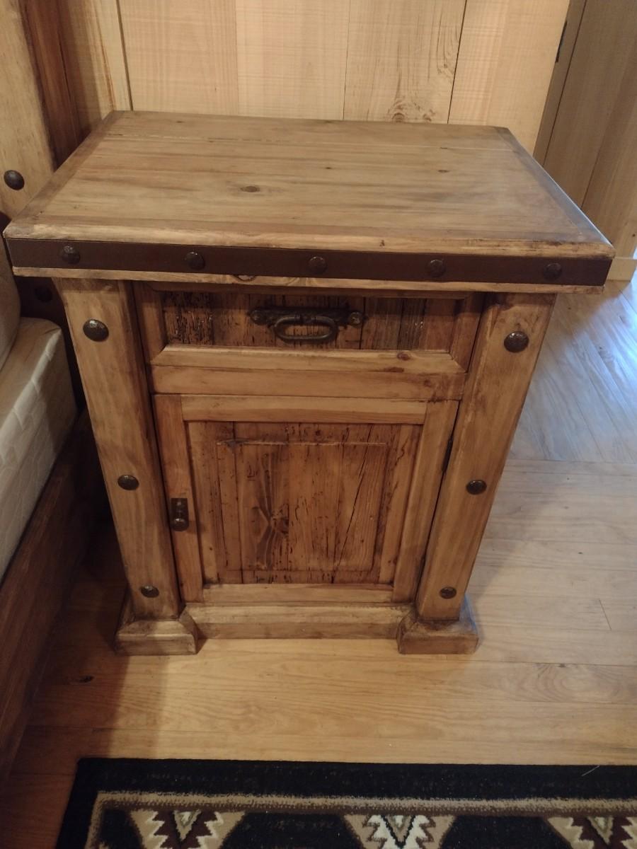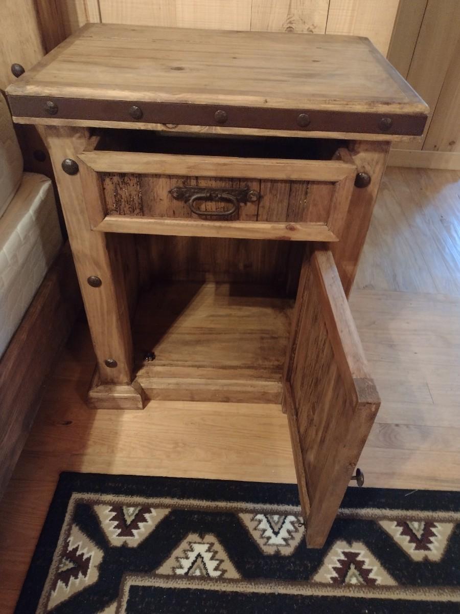 Custom Solid Natural Wood Cabin Furniture Bedside Table with Storage Choice A PLEASE NOTE:. Due to no internet connection or wireless service, all invoices must be prepaid via PayPal, Stripe, or Zelle prior to arrival at pick up. Exact change cash onsite is acceptable but absolutely no debit or credit cards at time of pick up.