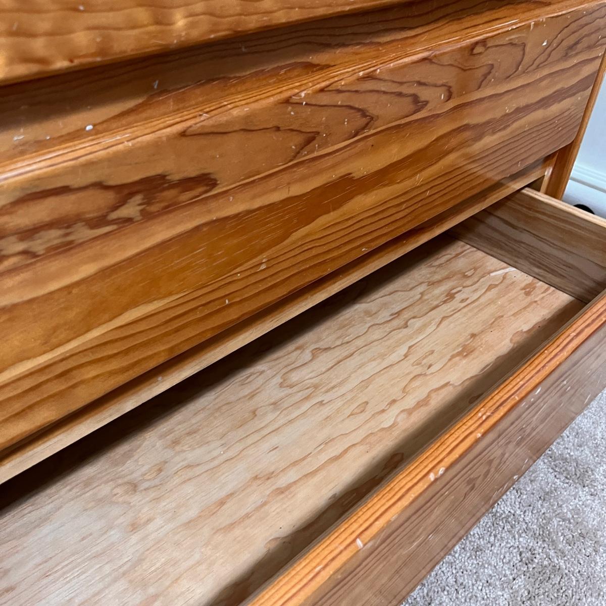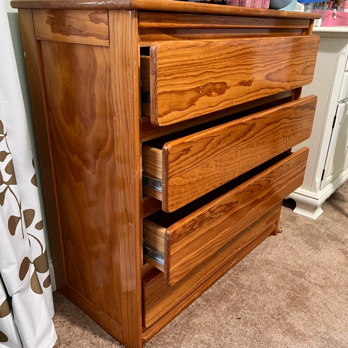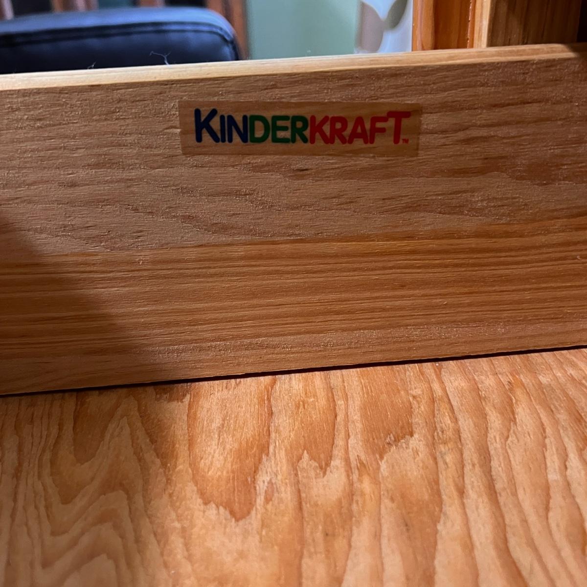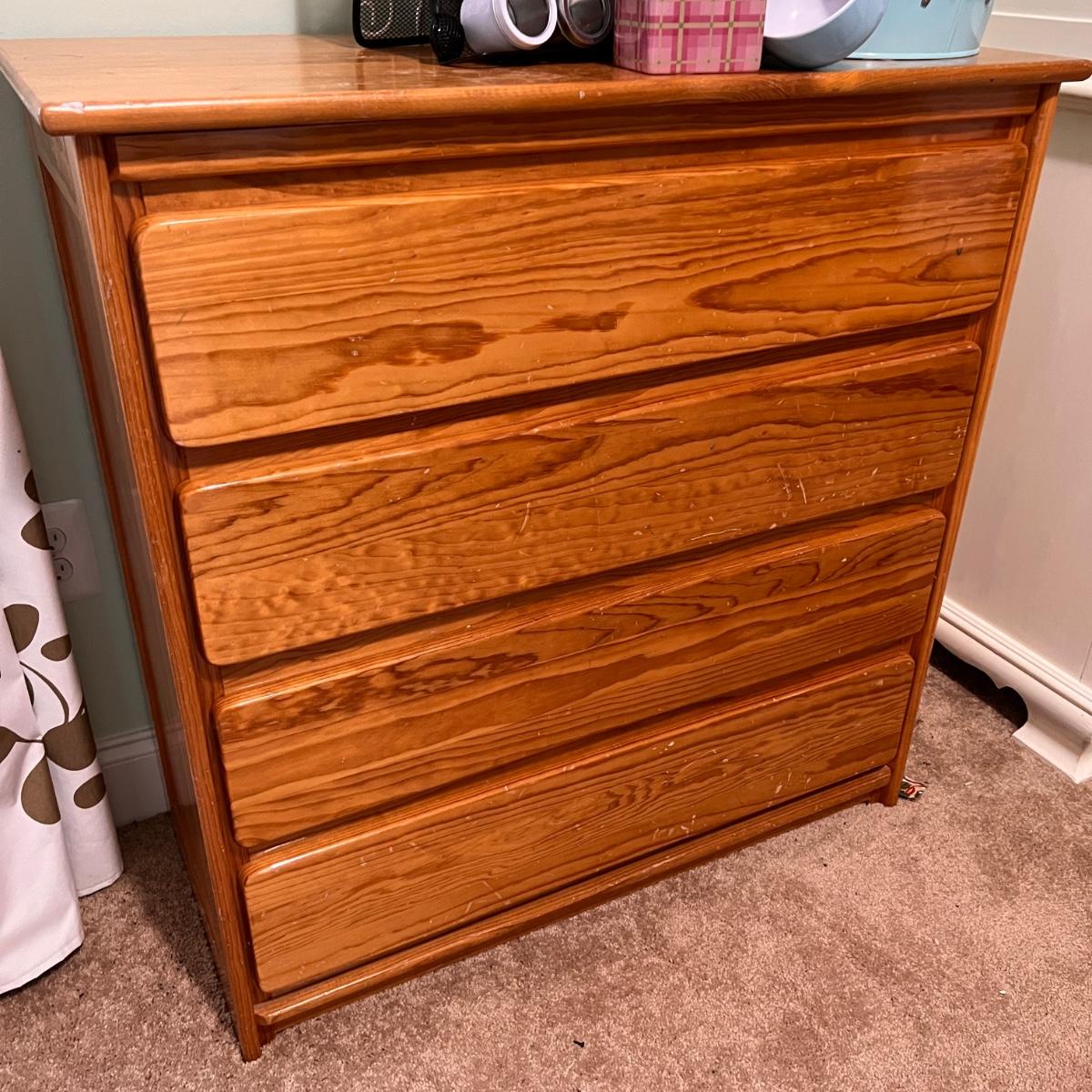 4 drawer solid wood dresser by KinderKraft. See pics for measurements. There are quite a few nicks and scratches, could use a refinishing. But a good piece of furniture, draws are all on tracks.