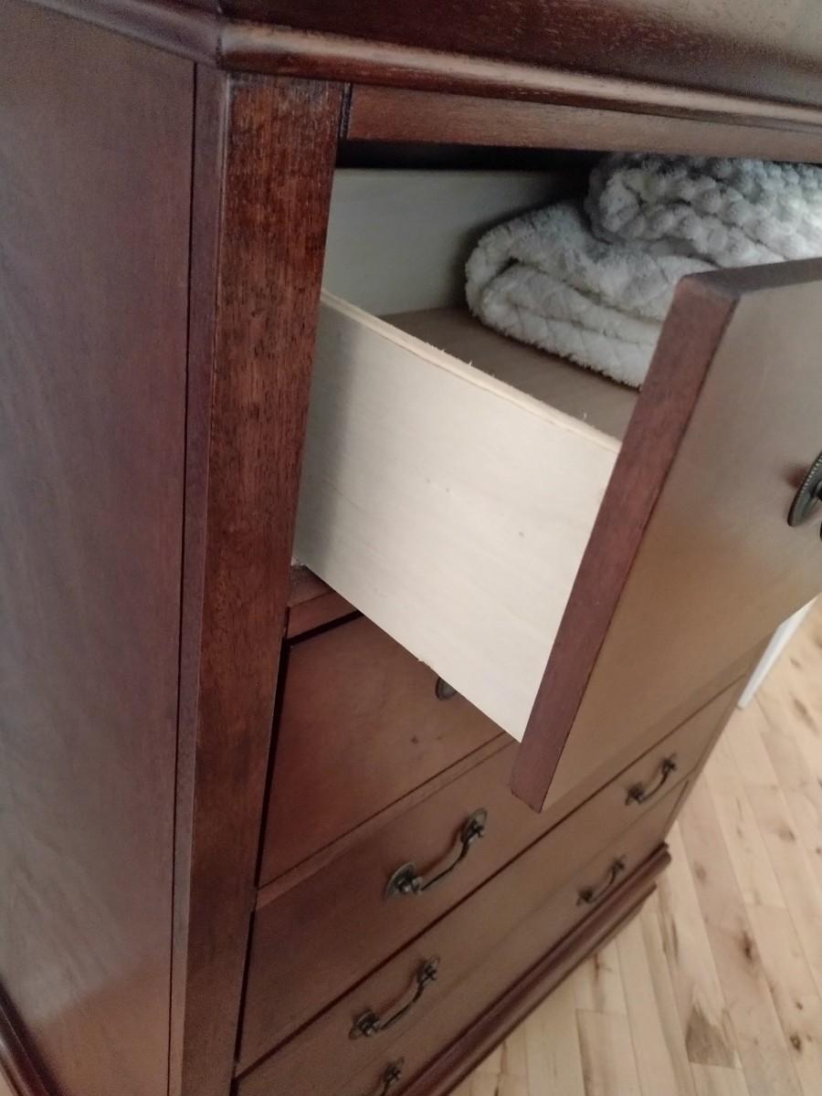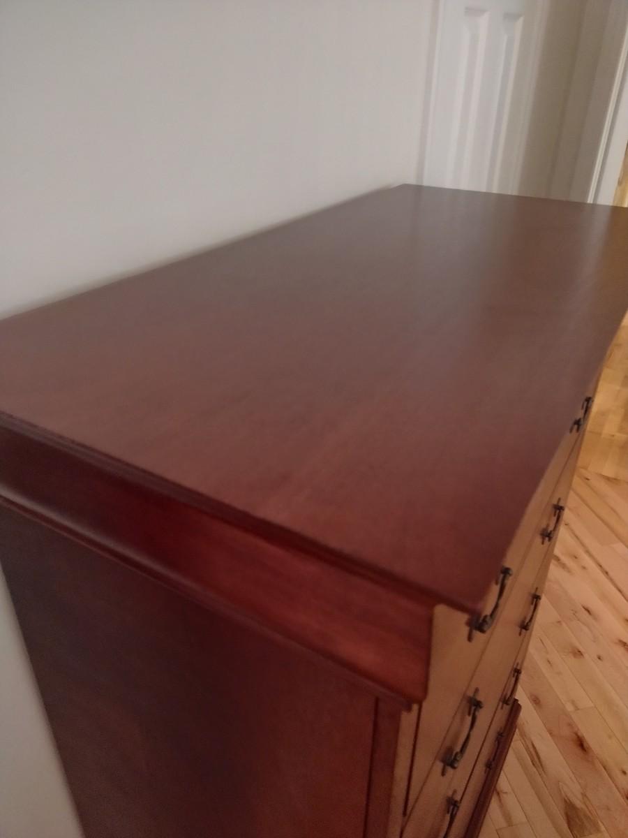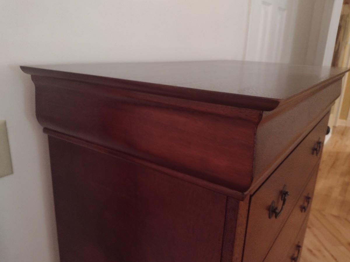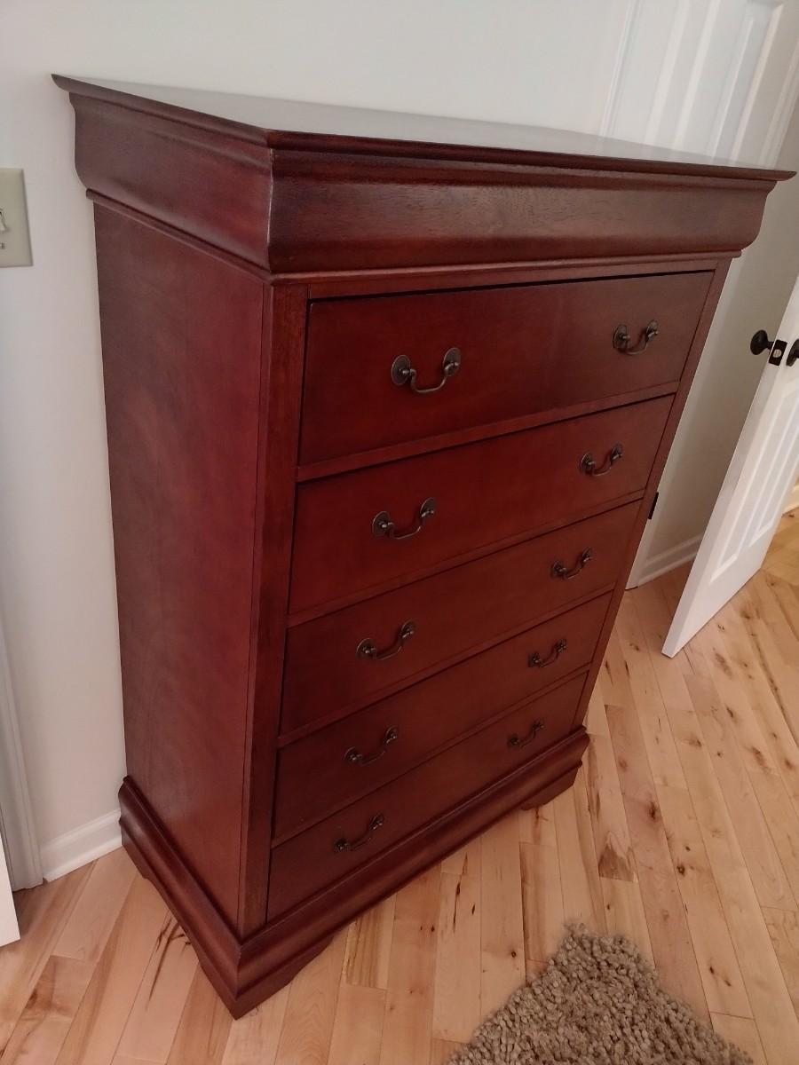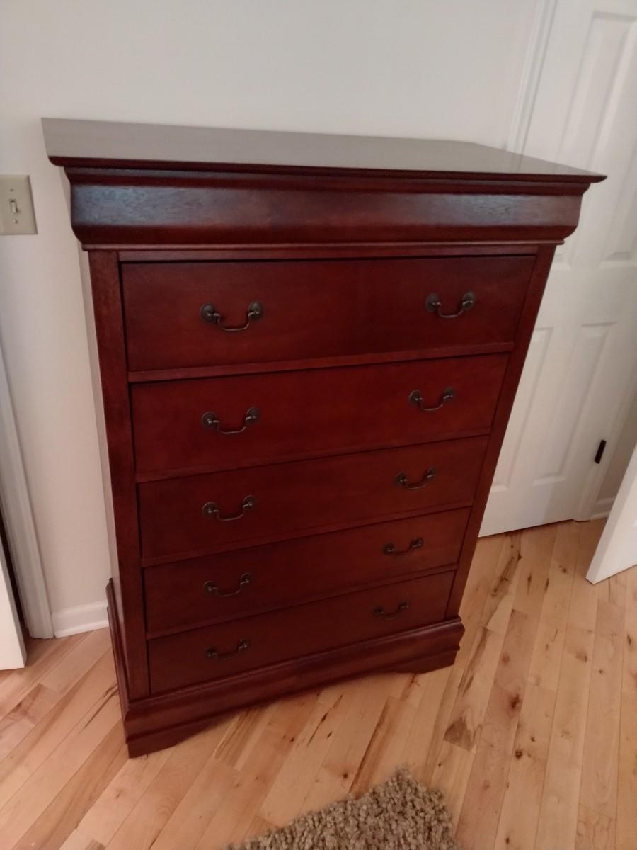 Five Drawer Tall Dresser. Item is upstairs. Please bring assistance, if needed, for safe removal.