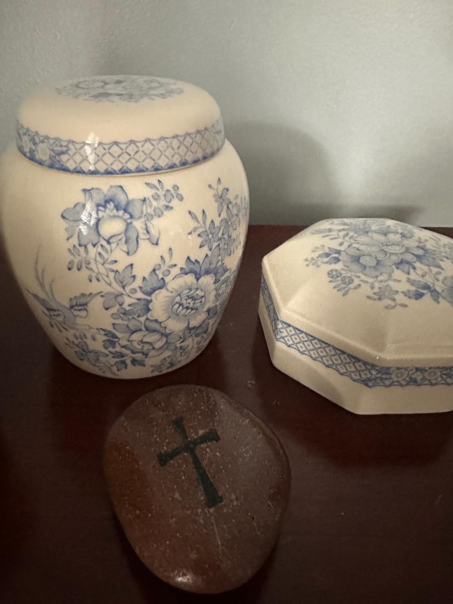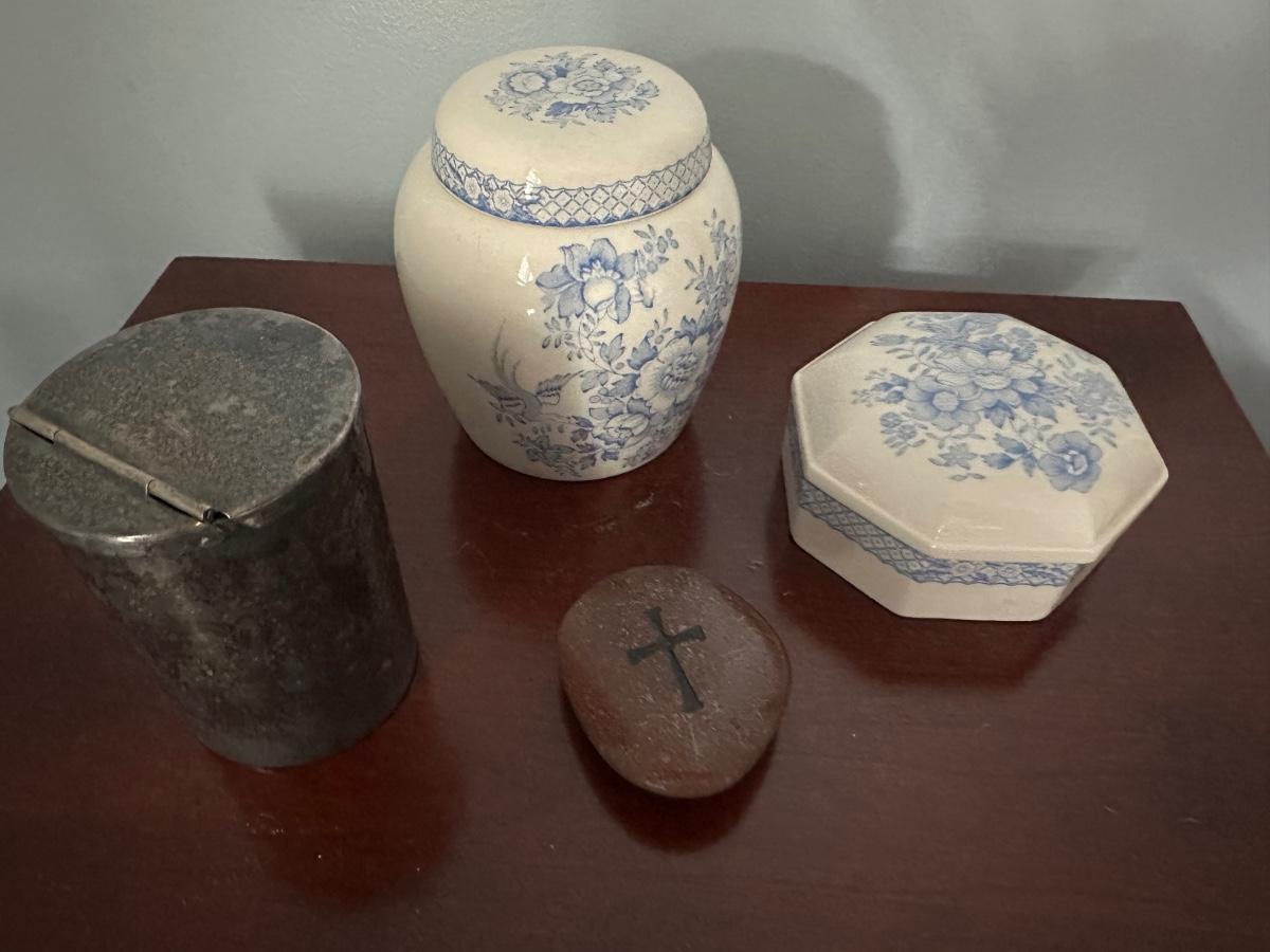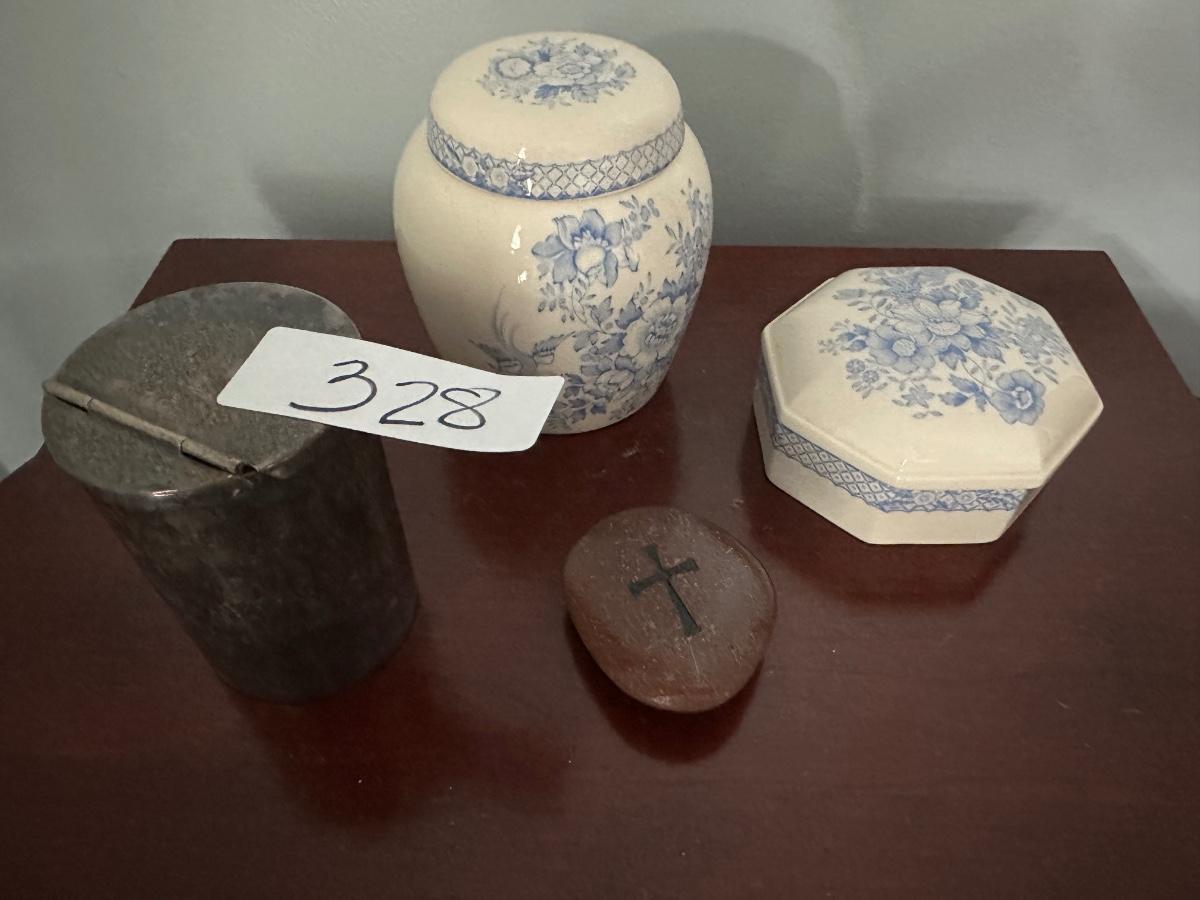 2 DRESSER DISHES, ROCK, LIDDED CONTAINER