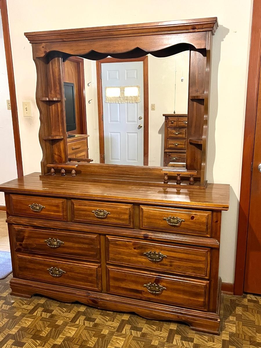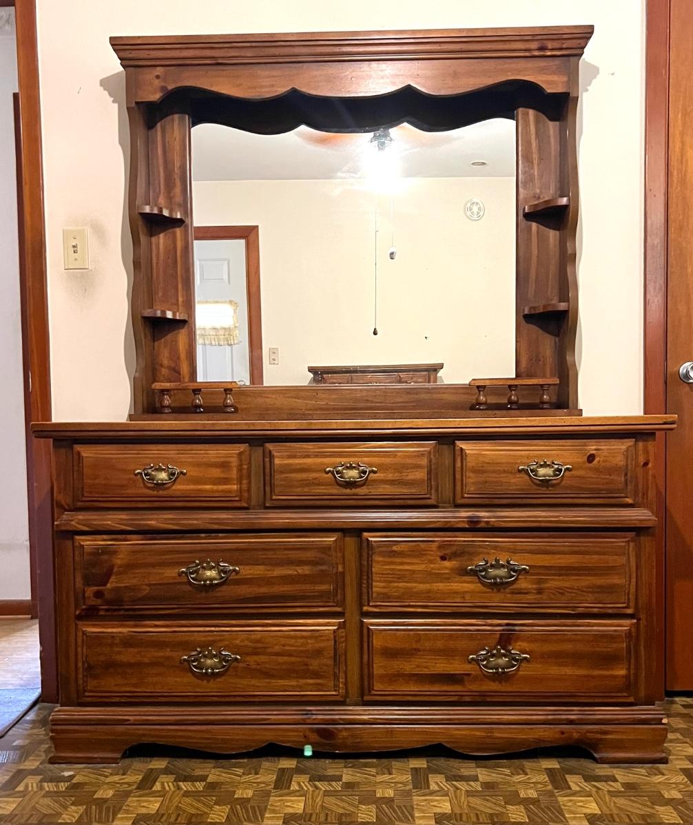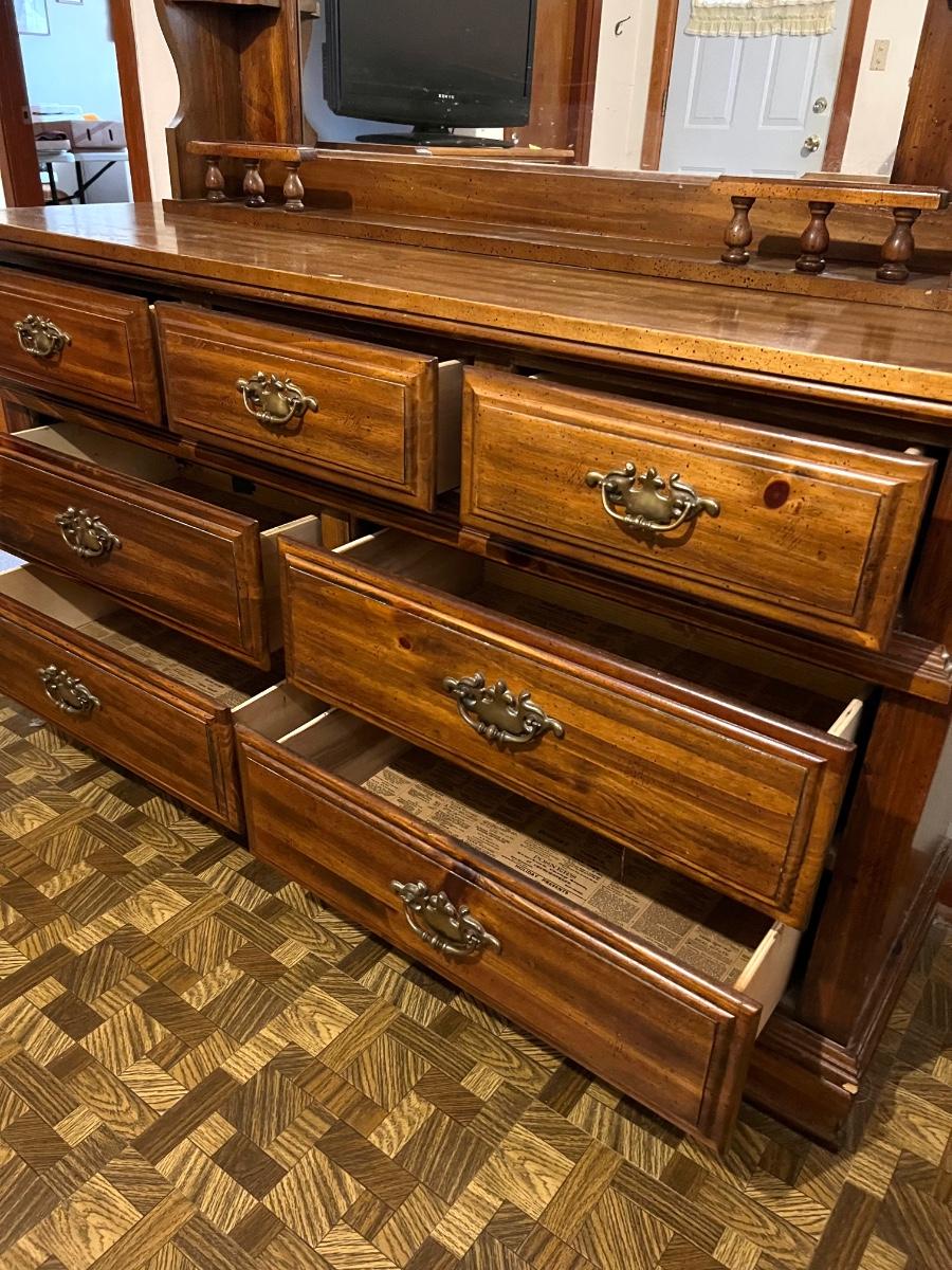 7 drawer dresser with mirror Measures 71 inches tall, 58 inches long and 18 inches deep. Drawers work as they should. Some signs of use, see pictures