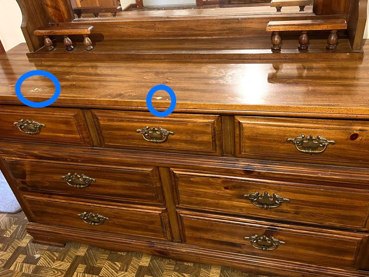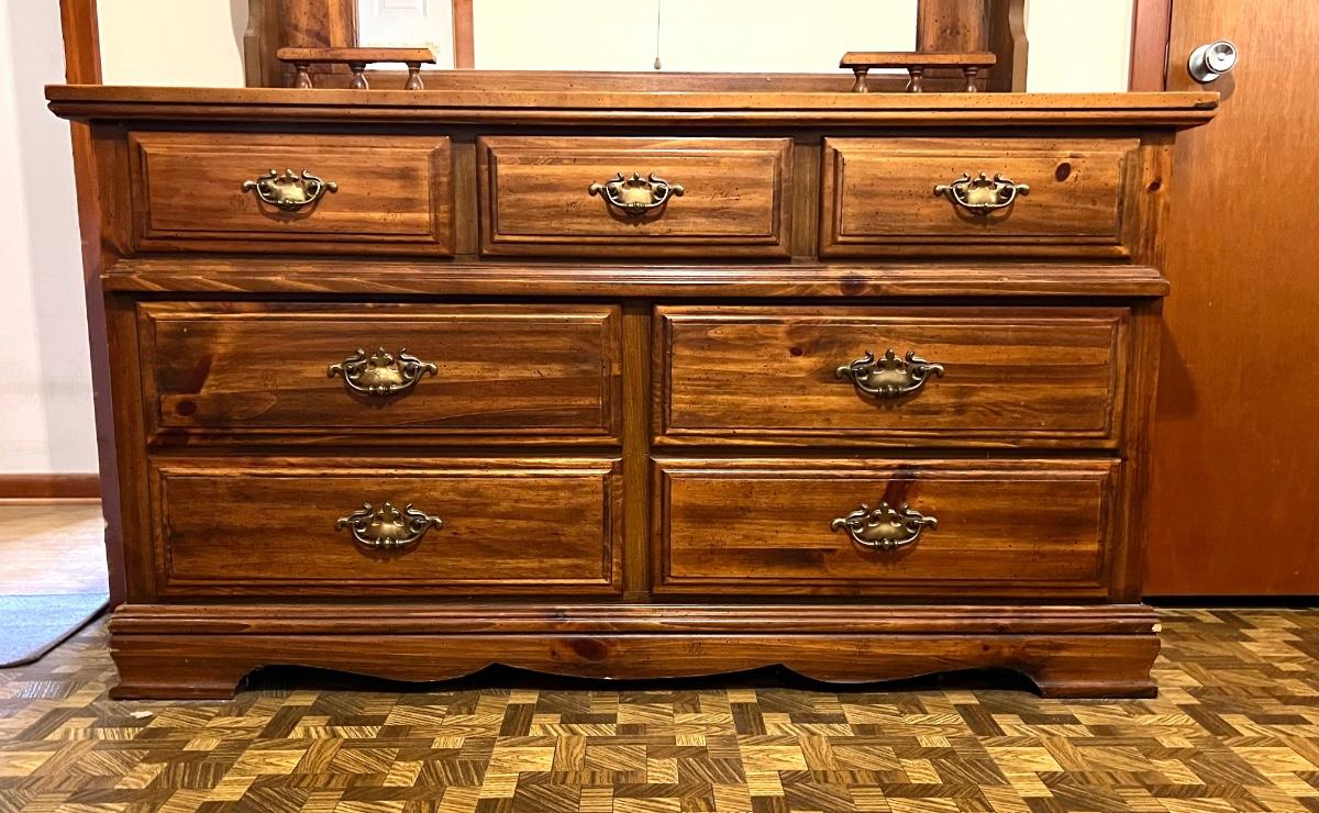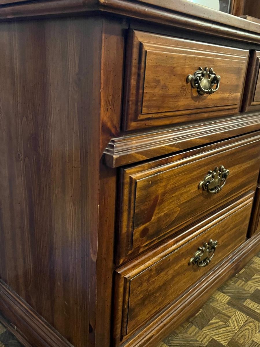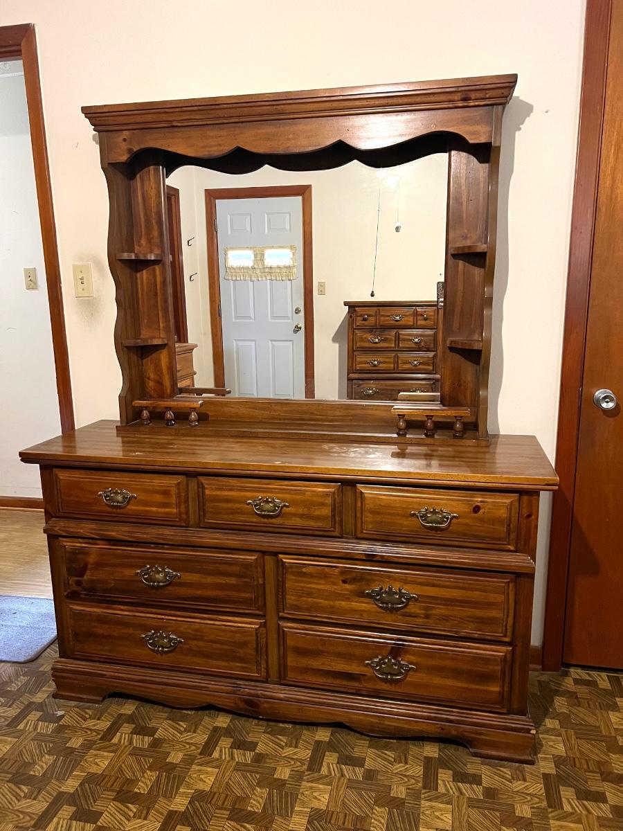 7 drawer dresser with mirror Measures 71 inches tall, 58 inches long and 18 inches deep. Drawers work as they should. Some signs of use, see pictures