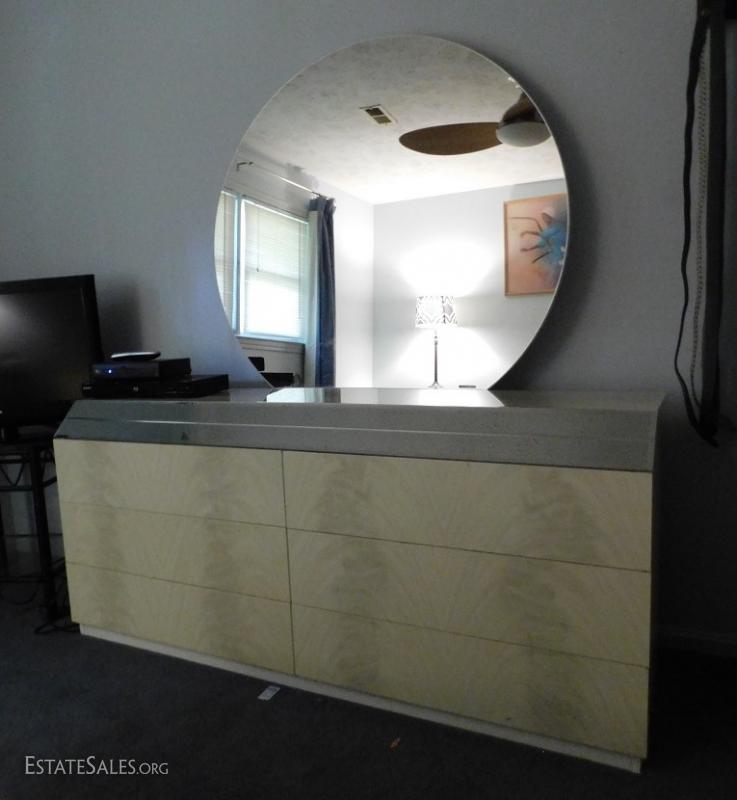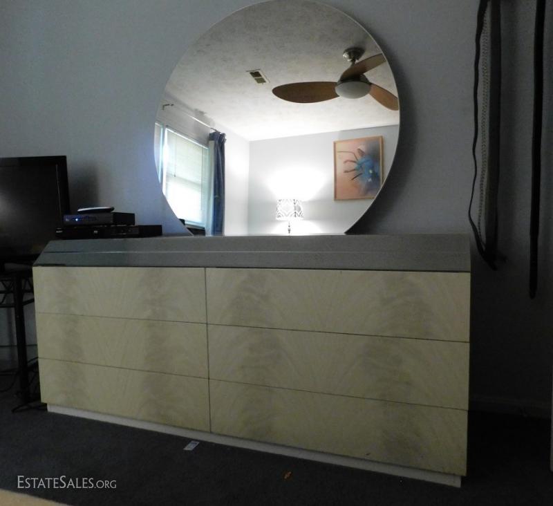 Contemporary six drawer dresser with round mirror. Bleached looked with reflective trim. In good shape. This dresser is about 6' long with a large amount of storage space.