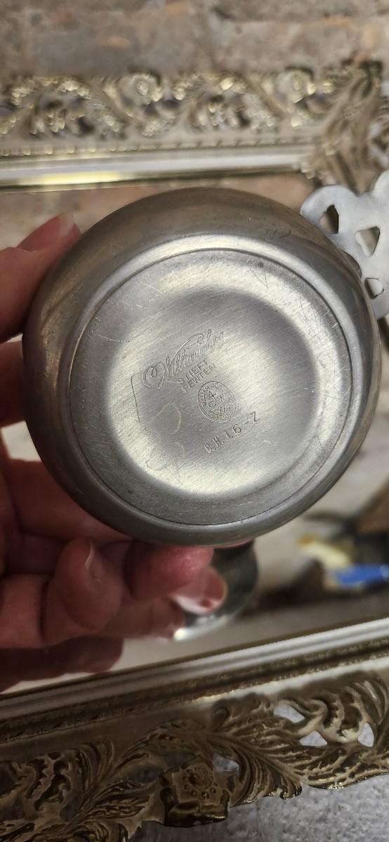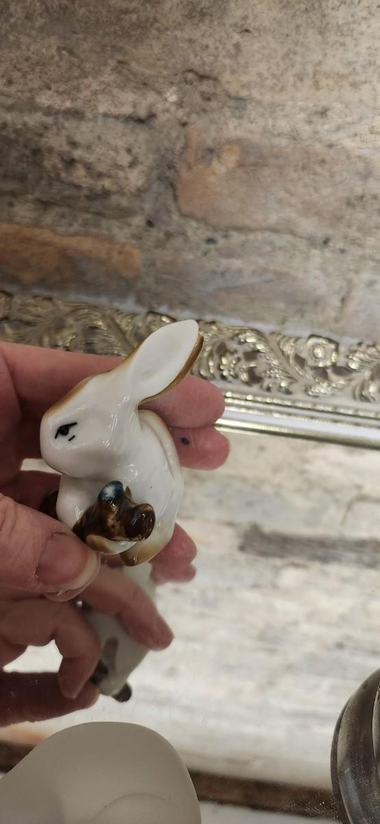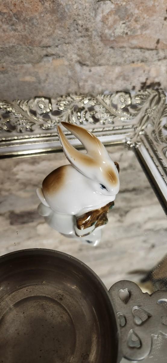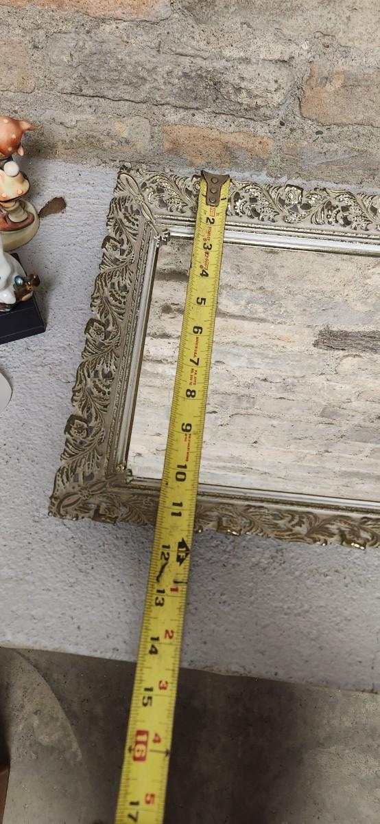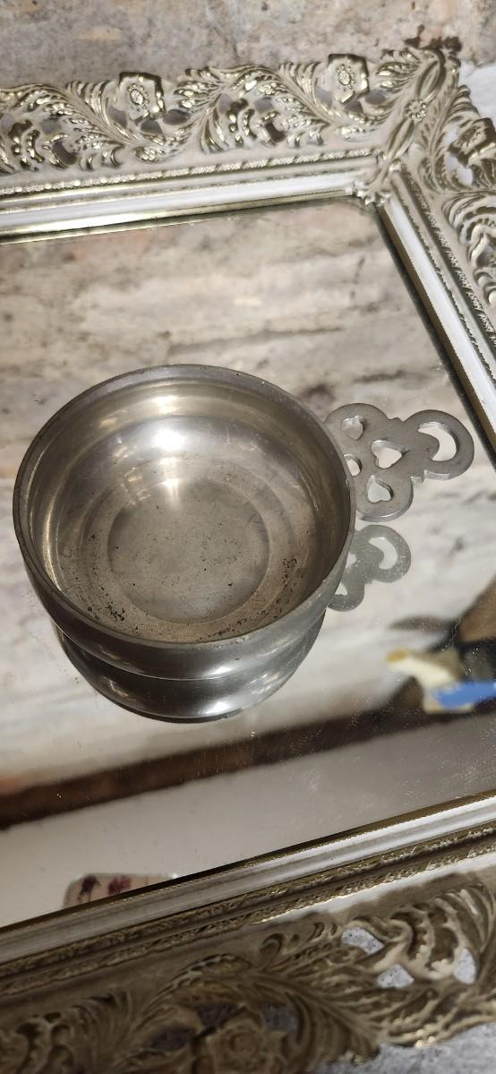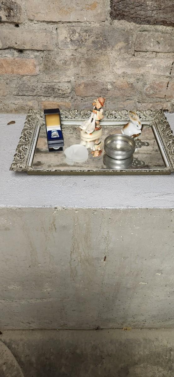 Mirrored dresser tray with a pewter porringer, Hummel Girl with Geese, sleeping kitty, Bing and Grondahl thimble and a Zsolnay Bunny figurine