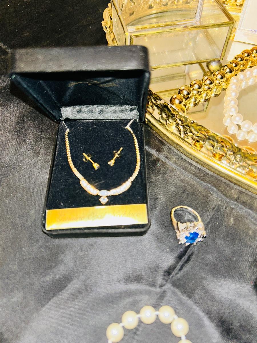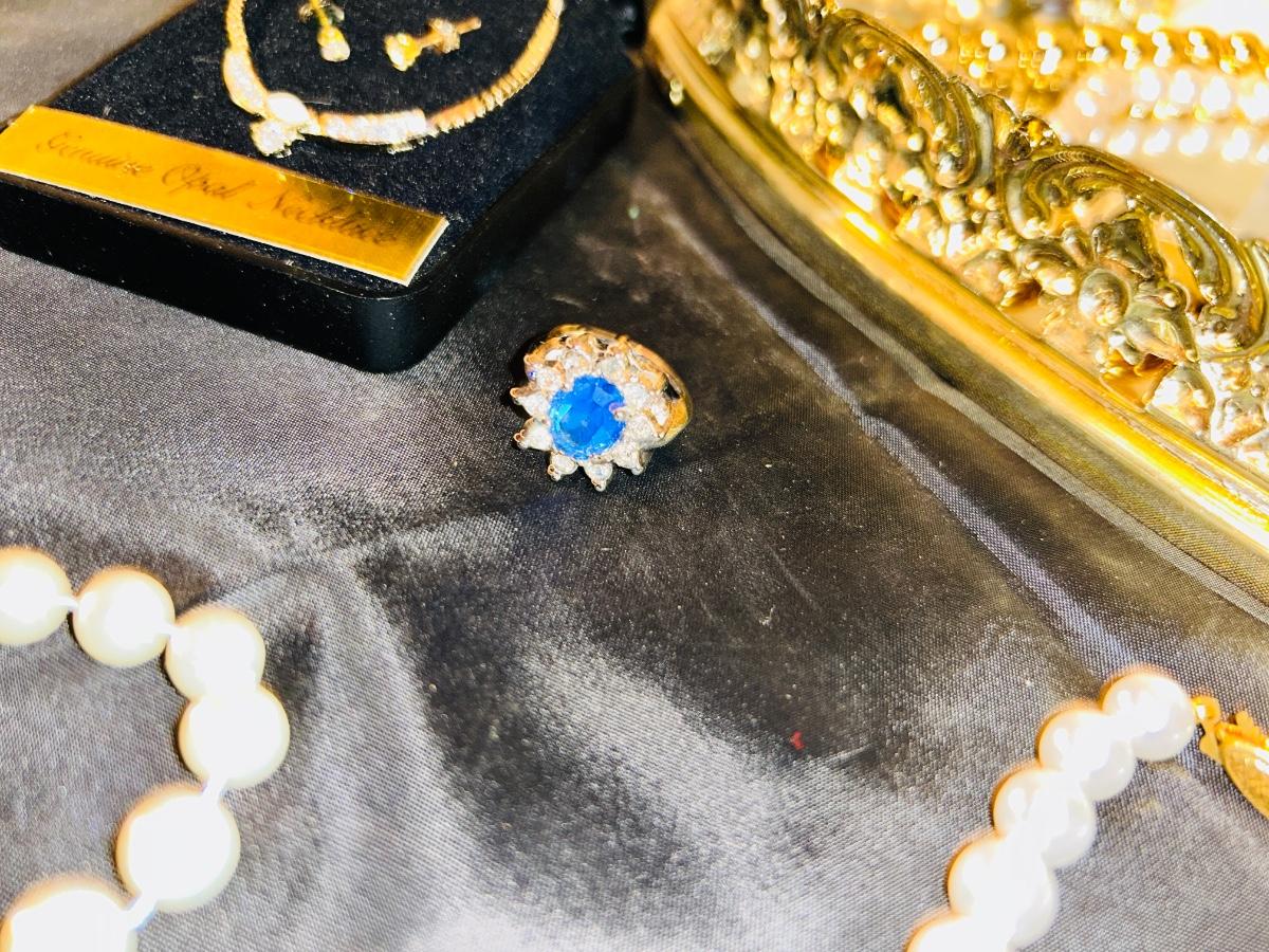 DRESSER TRAY, GOLD TONE AND PEARL COSTUME JEWELRY