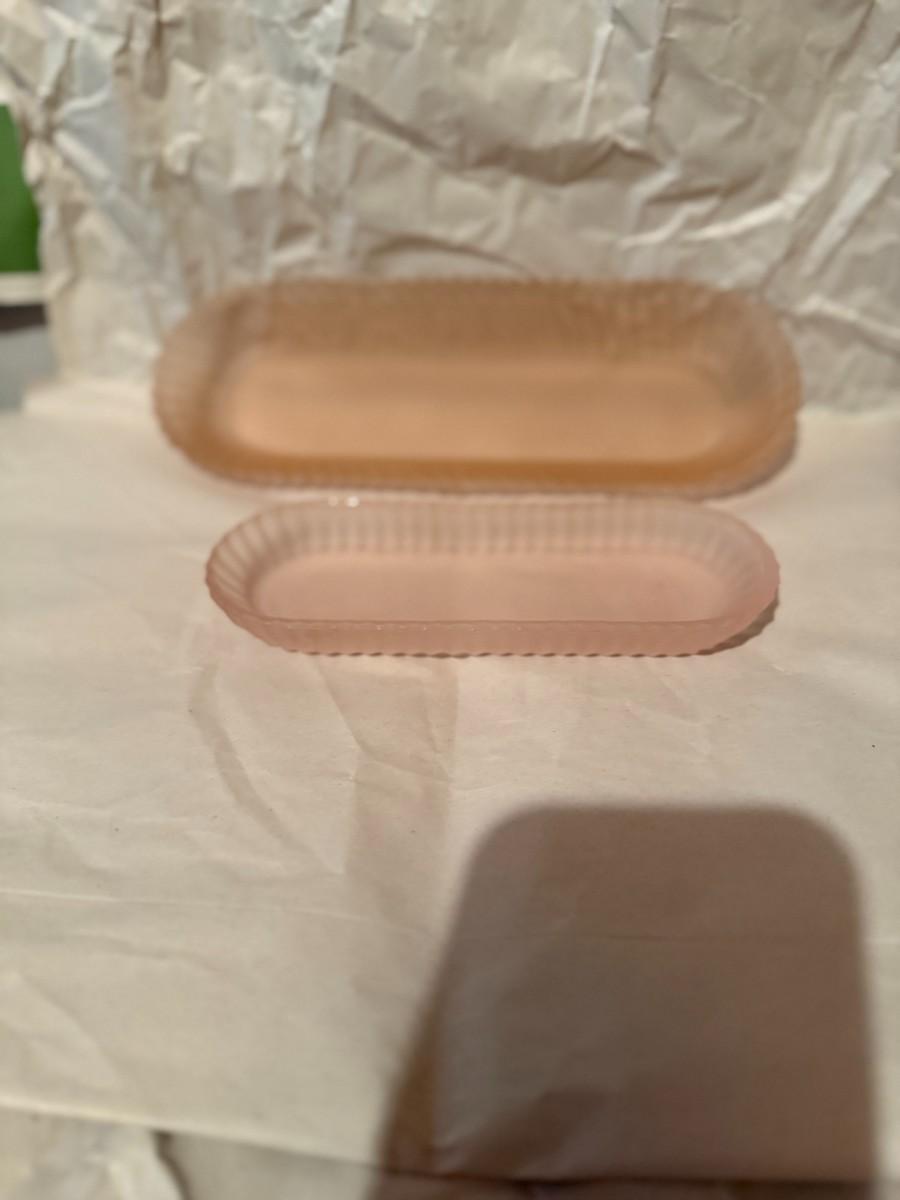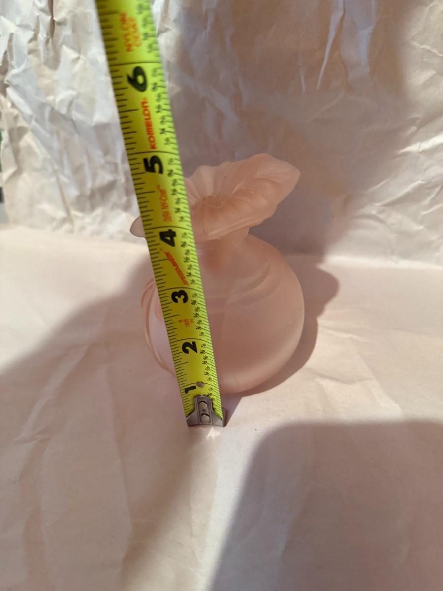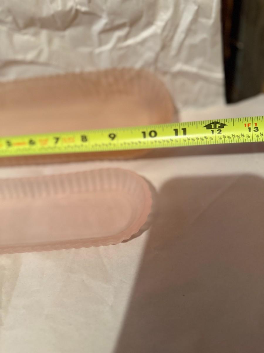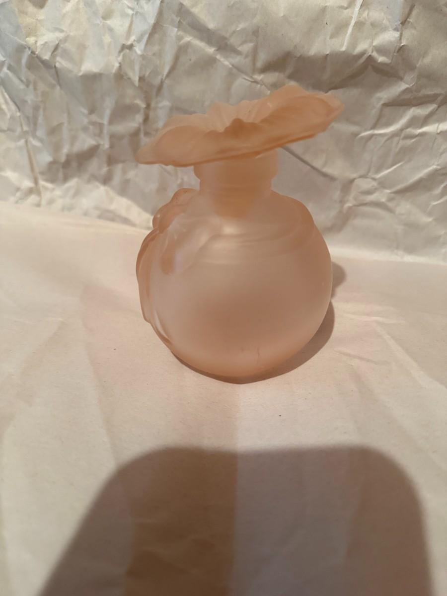 Dresser Vanity Set - Pink Frosted Glass 3 Piece: A lovely vanity set featuring a tray, jar, and atomizer in pink frosted glass, perfect for adding vintage glamour to your dresser.