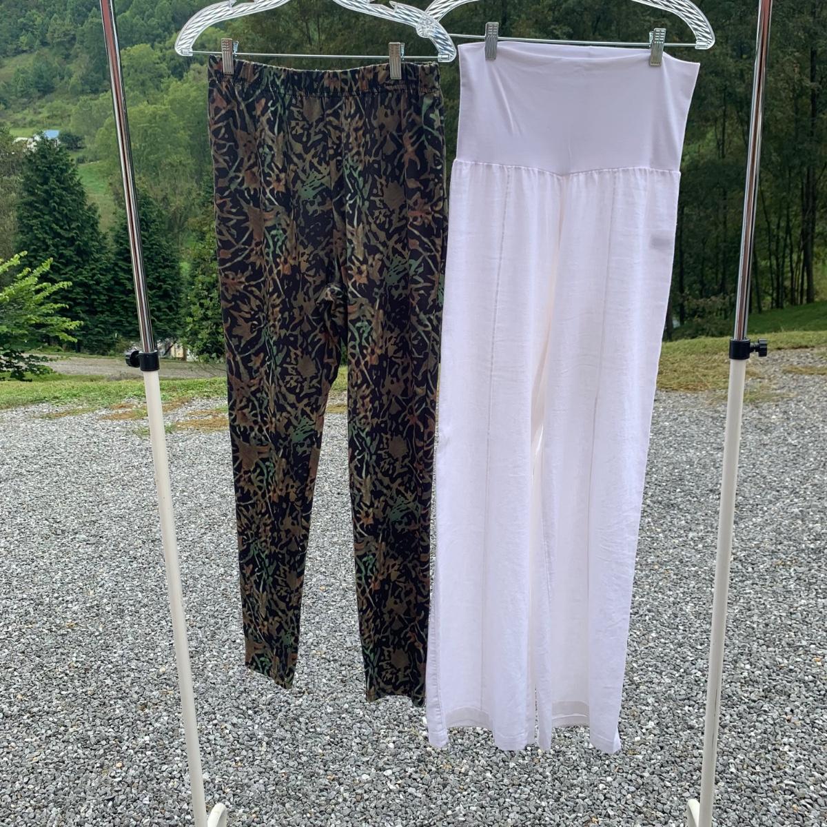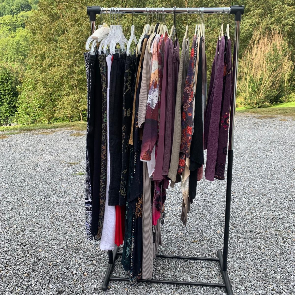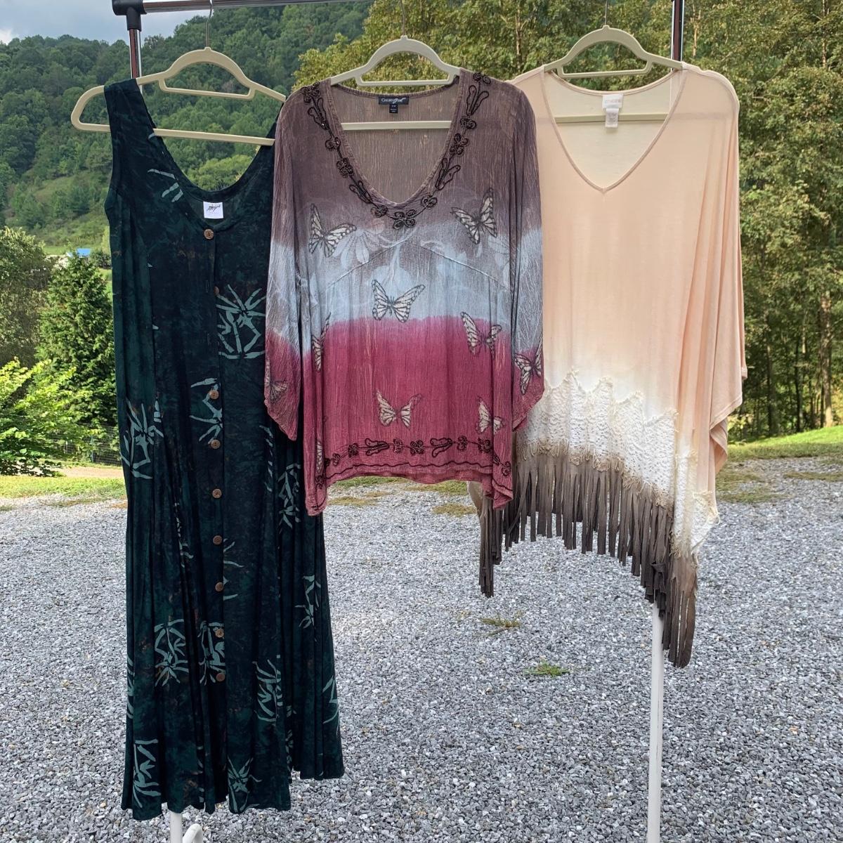 In the collection of gorgeous flowy clothing, there are two cardigans, a hoodie, nine long sleeved shirts, a soft and sleeveless viscose button down, a flowy dyed fringe shirt, a vest, five maxi dresses, seven pairs of pants/leggings, and a skirt (28 total items). Most items are size S or M. Please see photos for inventory and details. There is a stain on the fringed Chico’s top that appears to be washable. Hangers are not included.