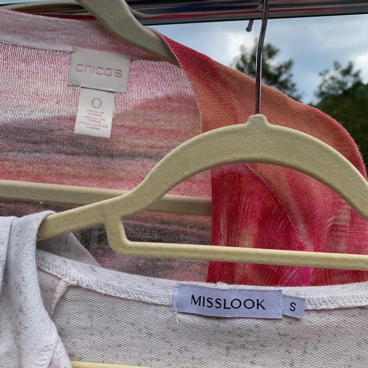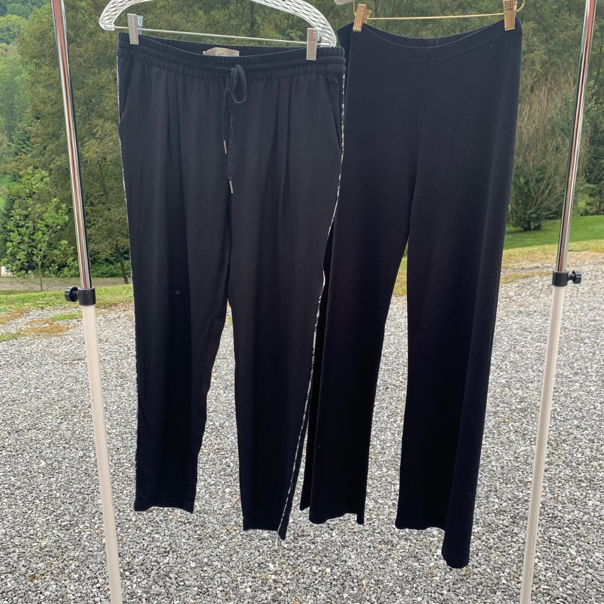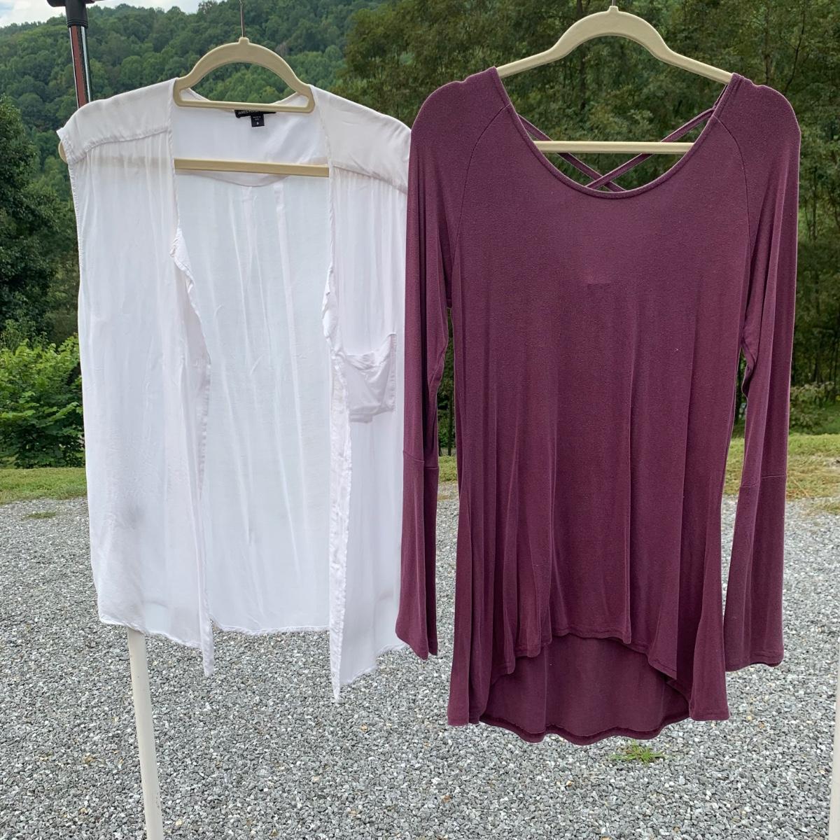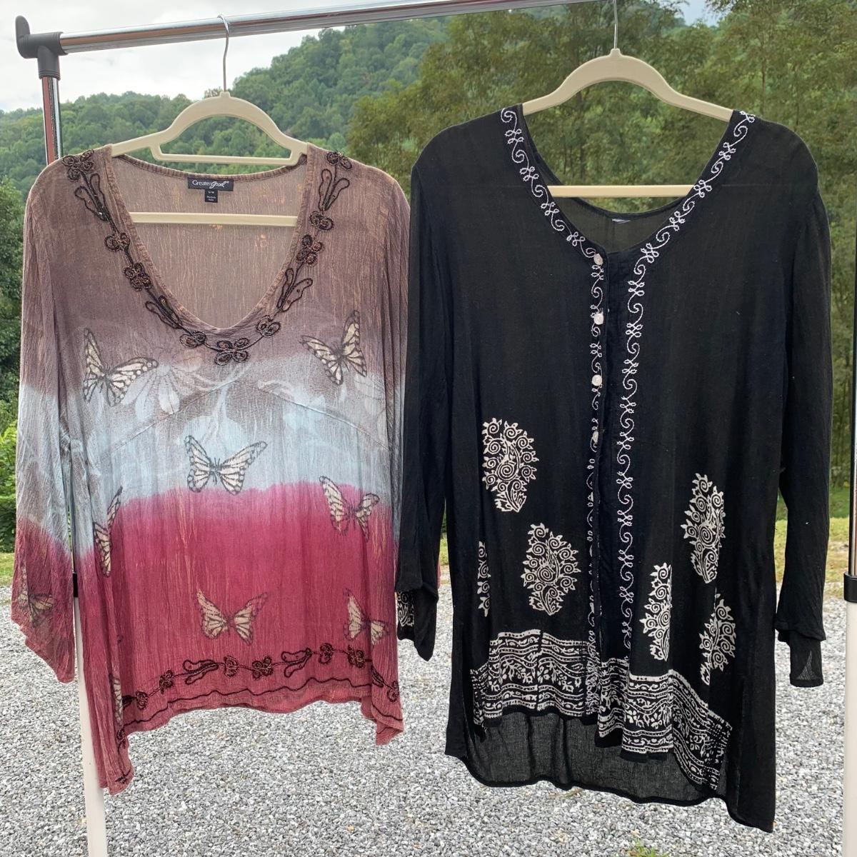 In the collection of gorgeous flowy clothing, there are two cardigans, a hoodie, nine long sleeved shirts, a soft and sleeveless viscose button down, a flowy dyed fringe shirt, a vest, five maxi dresses, seven pairs of pants/leggings, and a skirt (28 total items). Most items are size S or M. Please see photos for inventory and details. There is a stain on the fringed Chico’s top that appears to be washable. Hangers are not included.