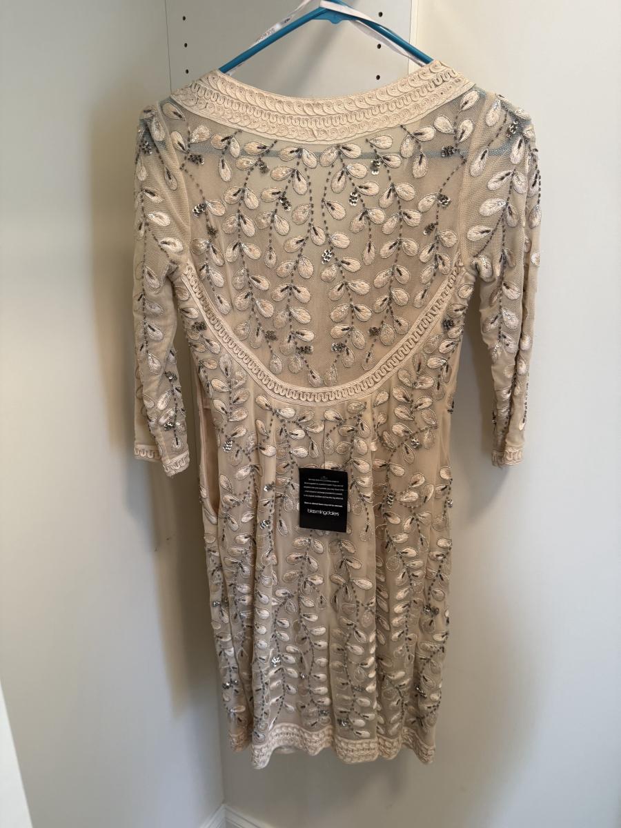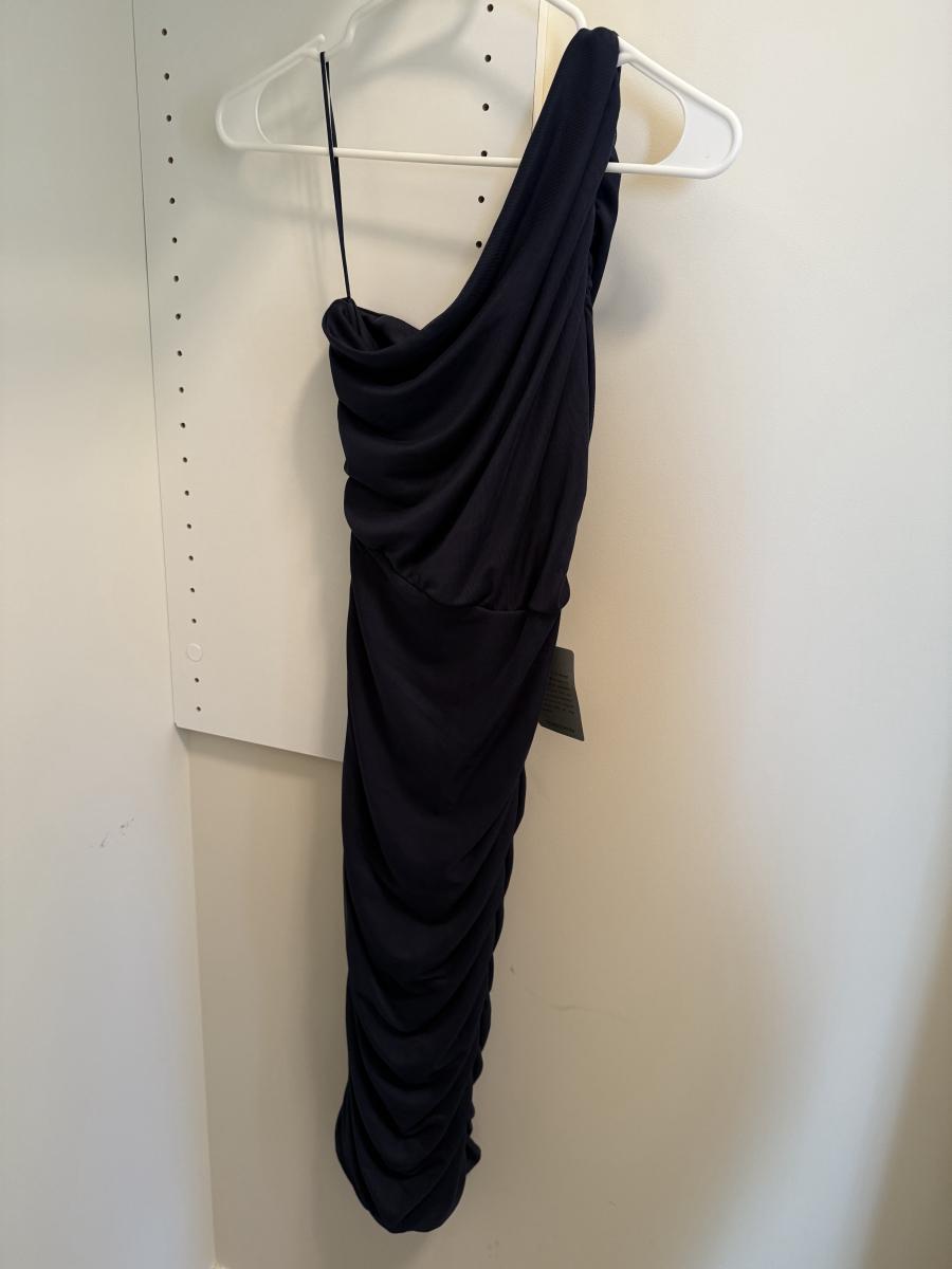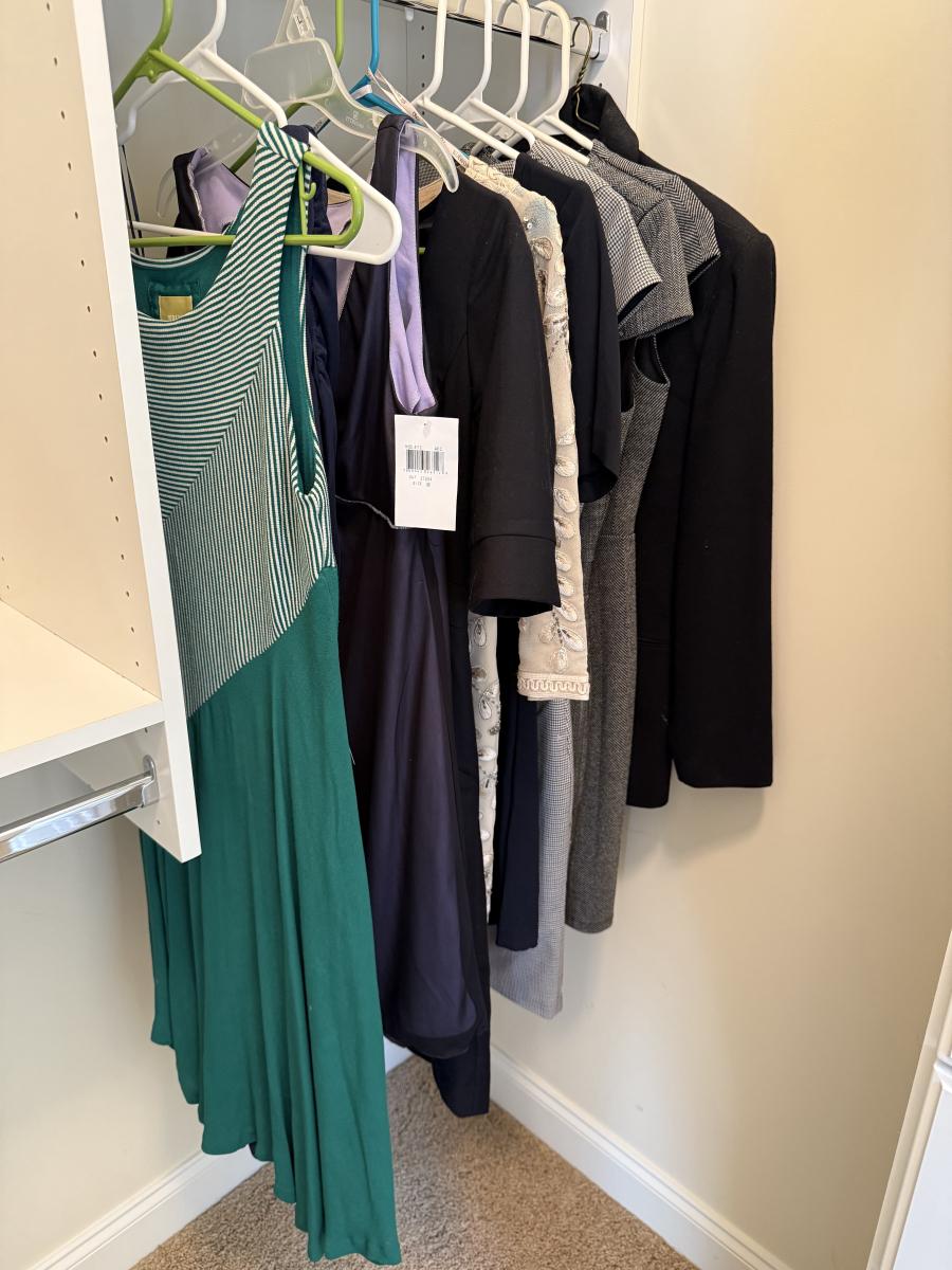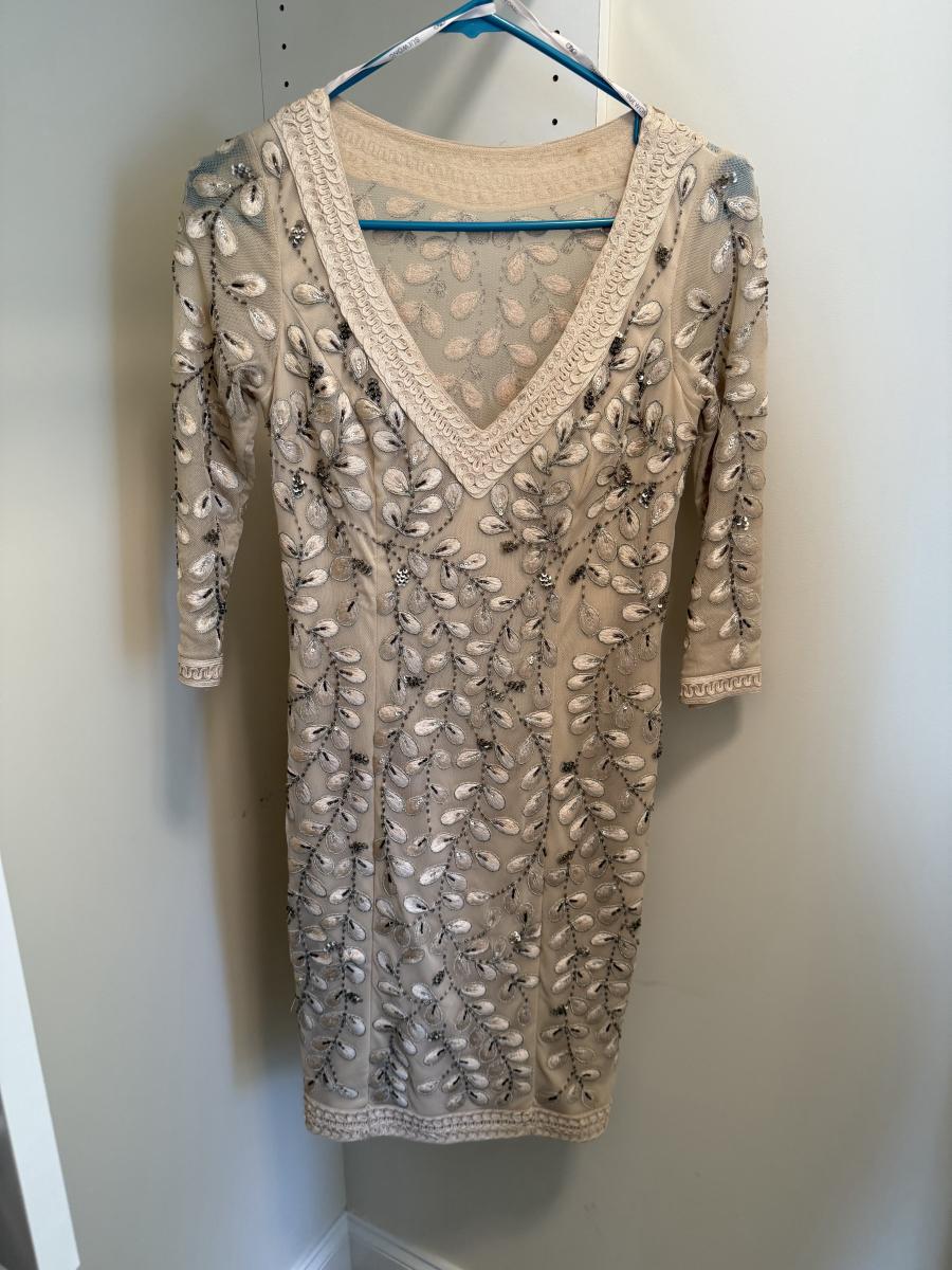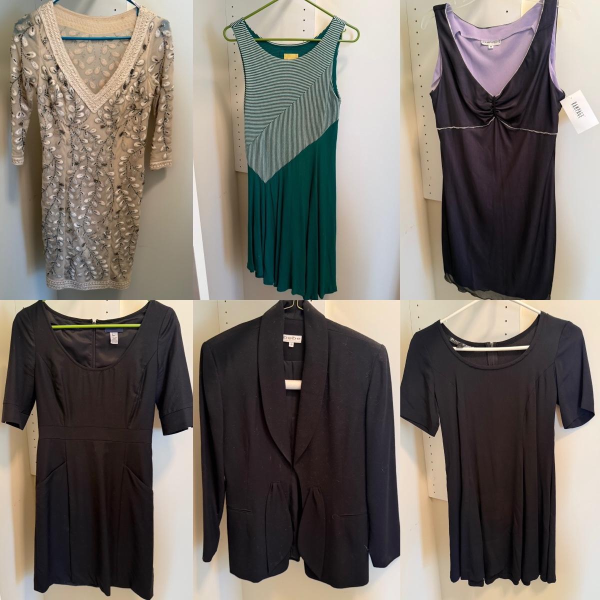 Nine dresses and one Bebe jacket. Sizes range from XS to M. Many are new with tags. Dress brands include Maeve by Anthropologie, J. Crew, Rampage, Sue Wong, Betsy Johnson, H&M, and Live X Design. The Bebe jacket has some pet fur on it and will need to be cleaned.
