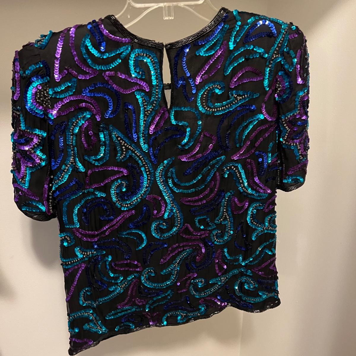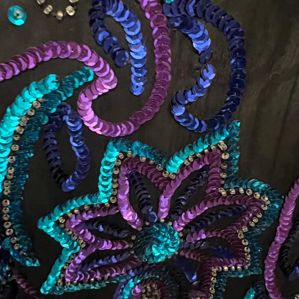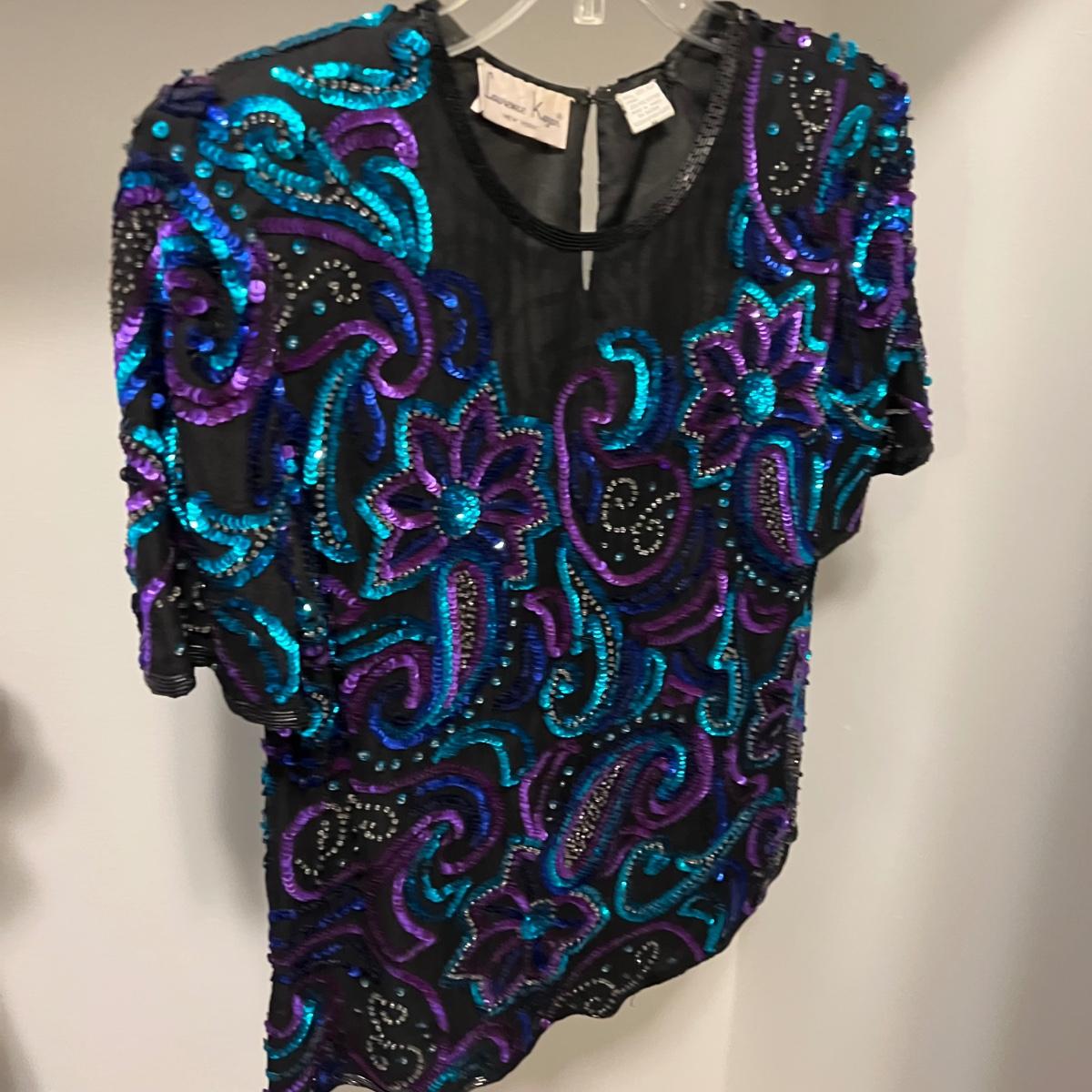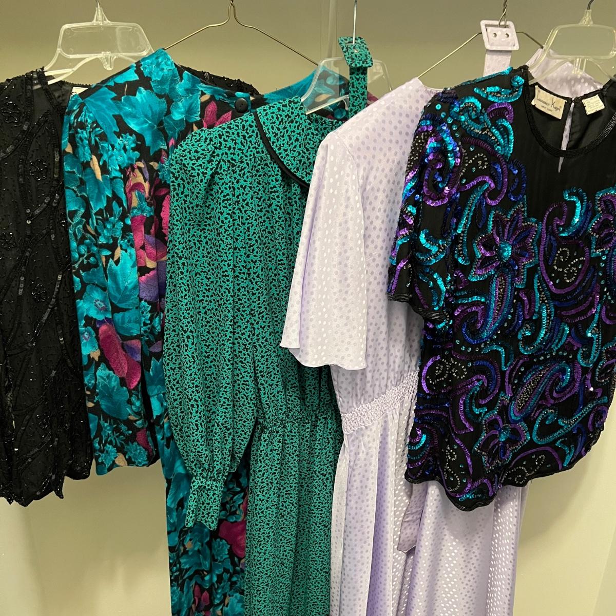 Three dresses. One Ms. Chaus, green and black size 8, one Jessica Howard, teal and black size 10, and one violet Ms, Chaus size 10. A black, petite large, sequin top and a teal and purple and black size medium sequin top.