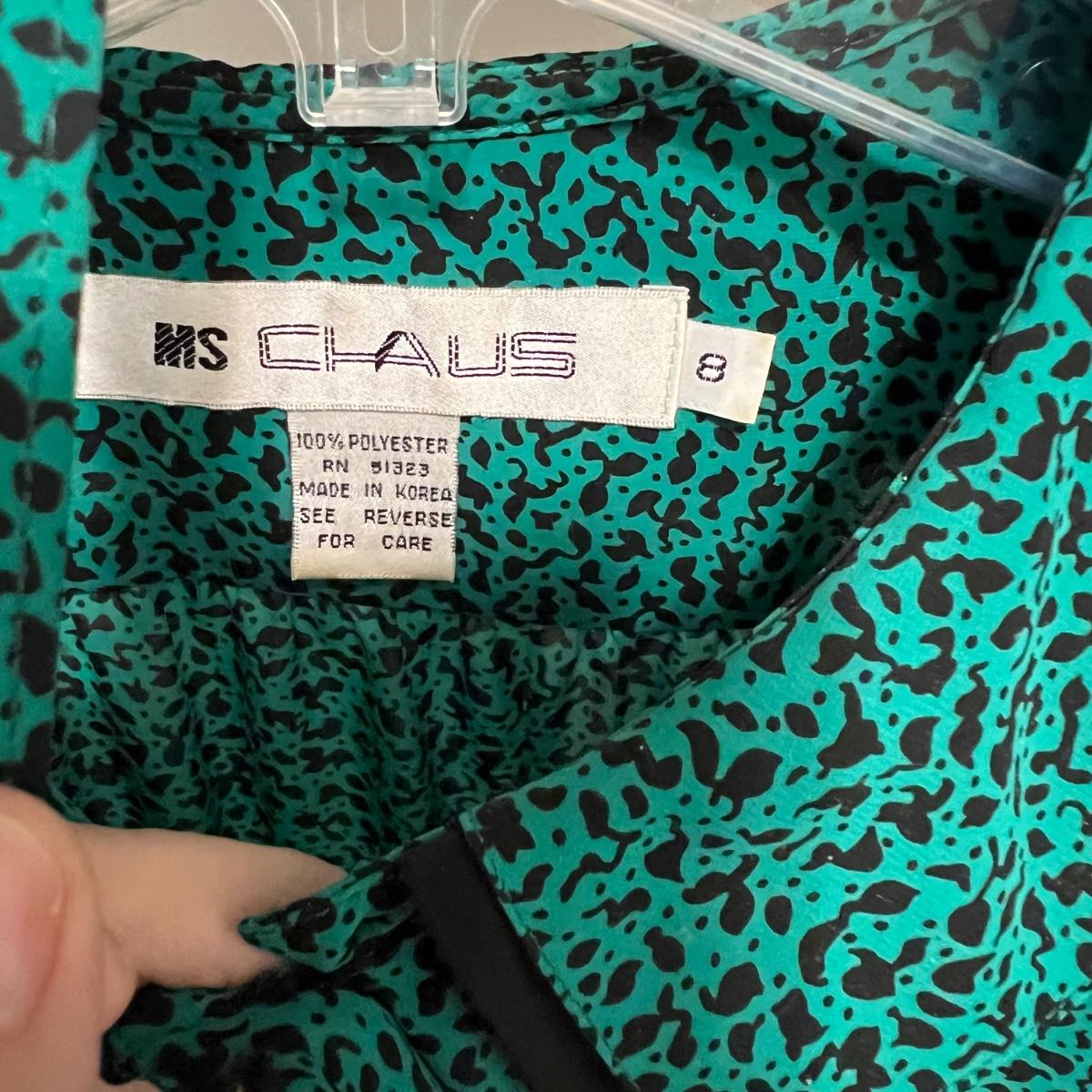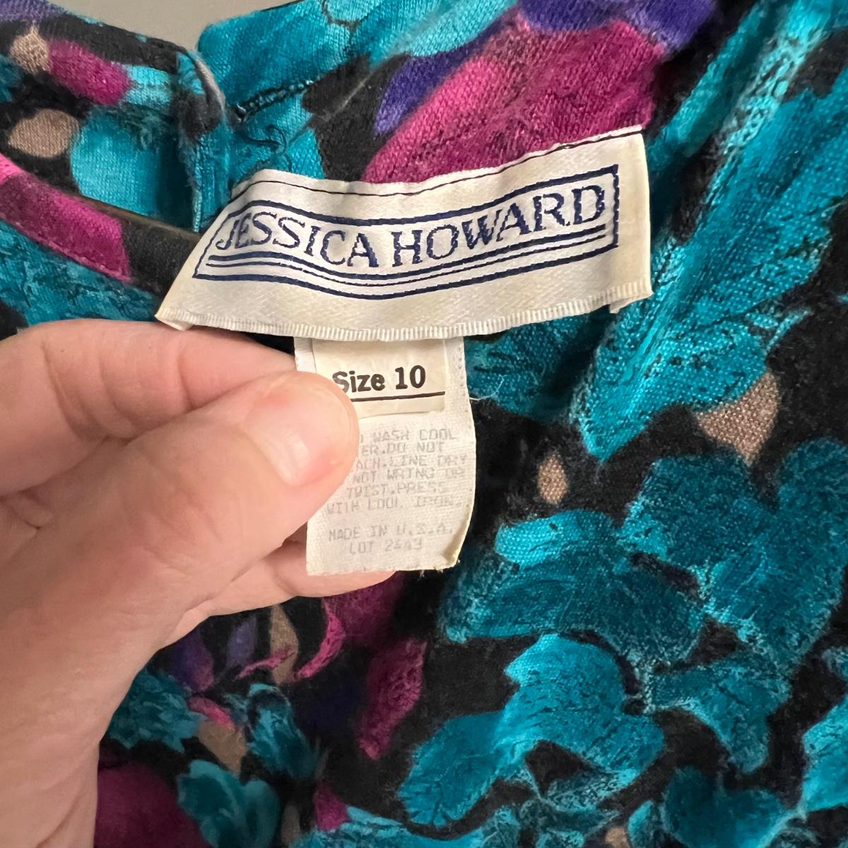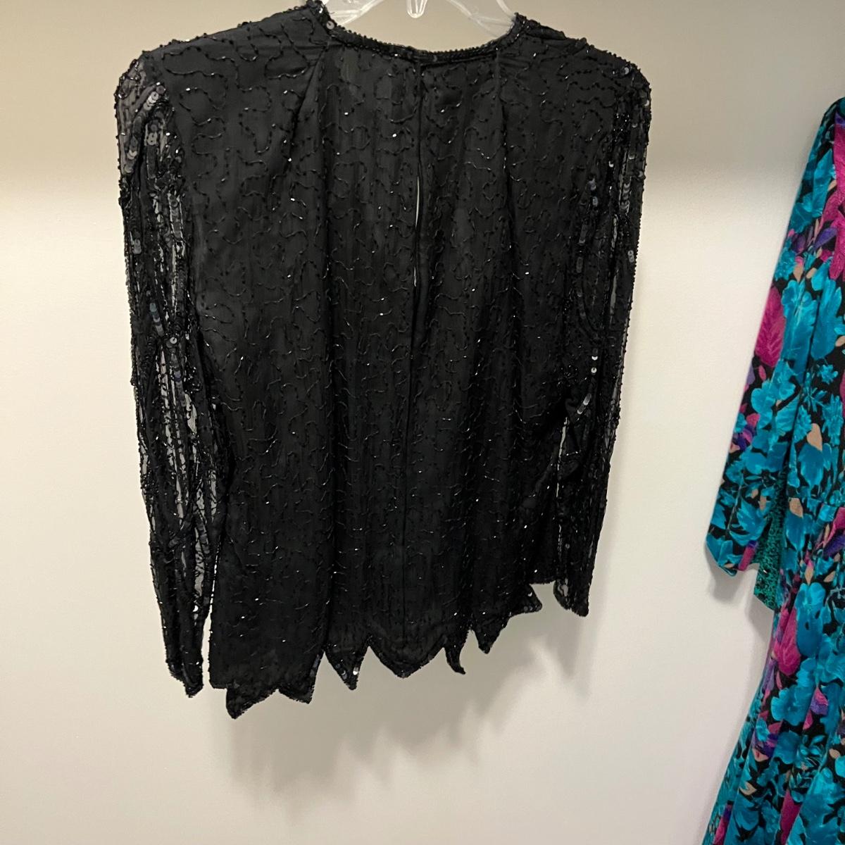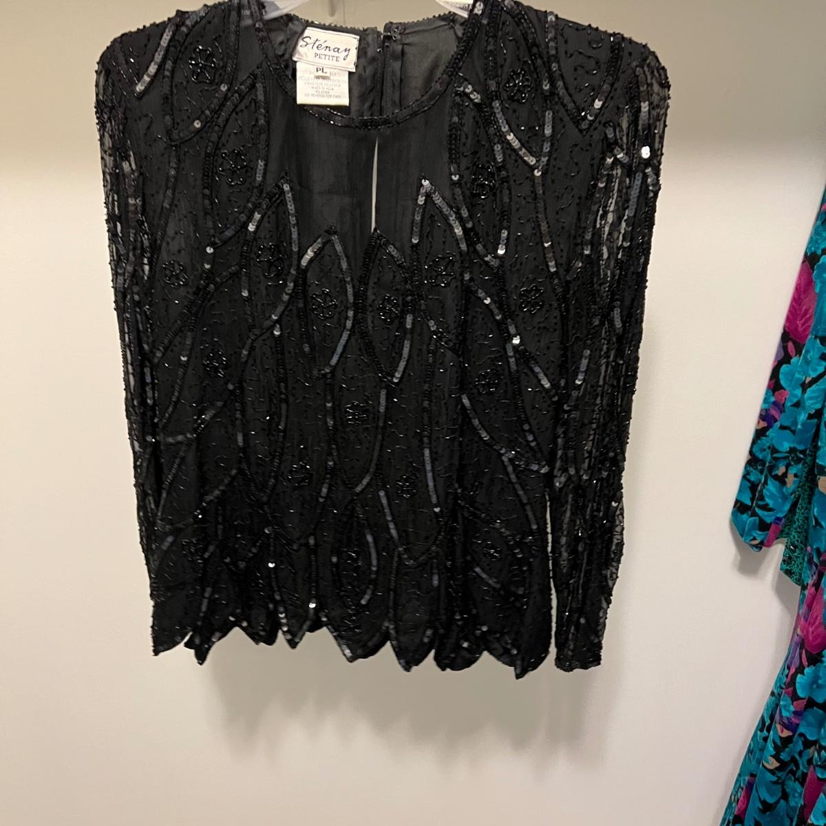 Three dresses. One Ms. Chaus, green and black size 8, one Jessica Howard, teal and black size 10, and one violet Ms, Chaus size 10. A black, petite large, sequin top and a teal and purple and black size medium sequin top.