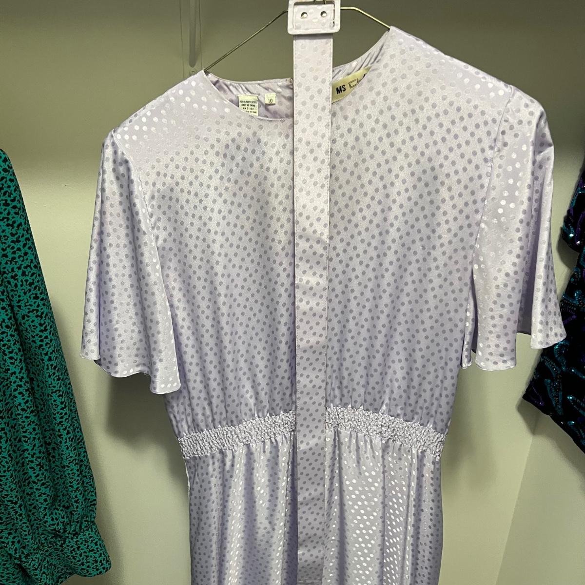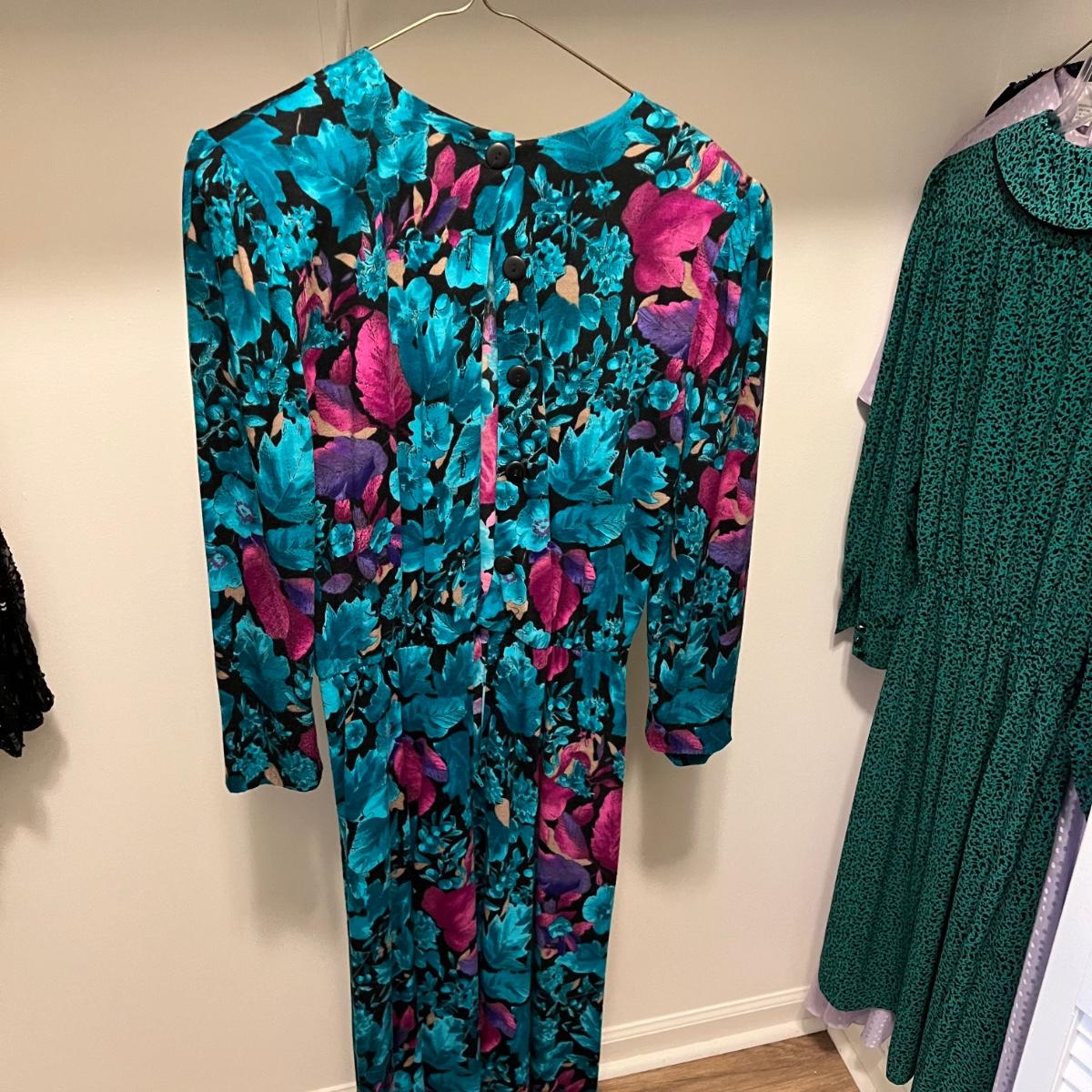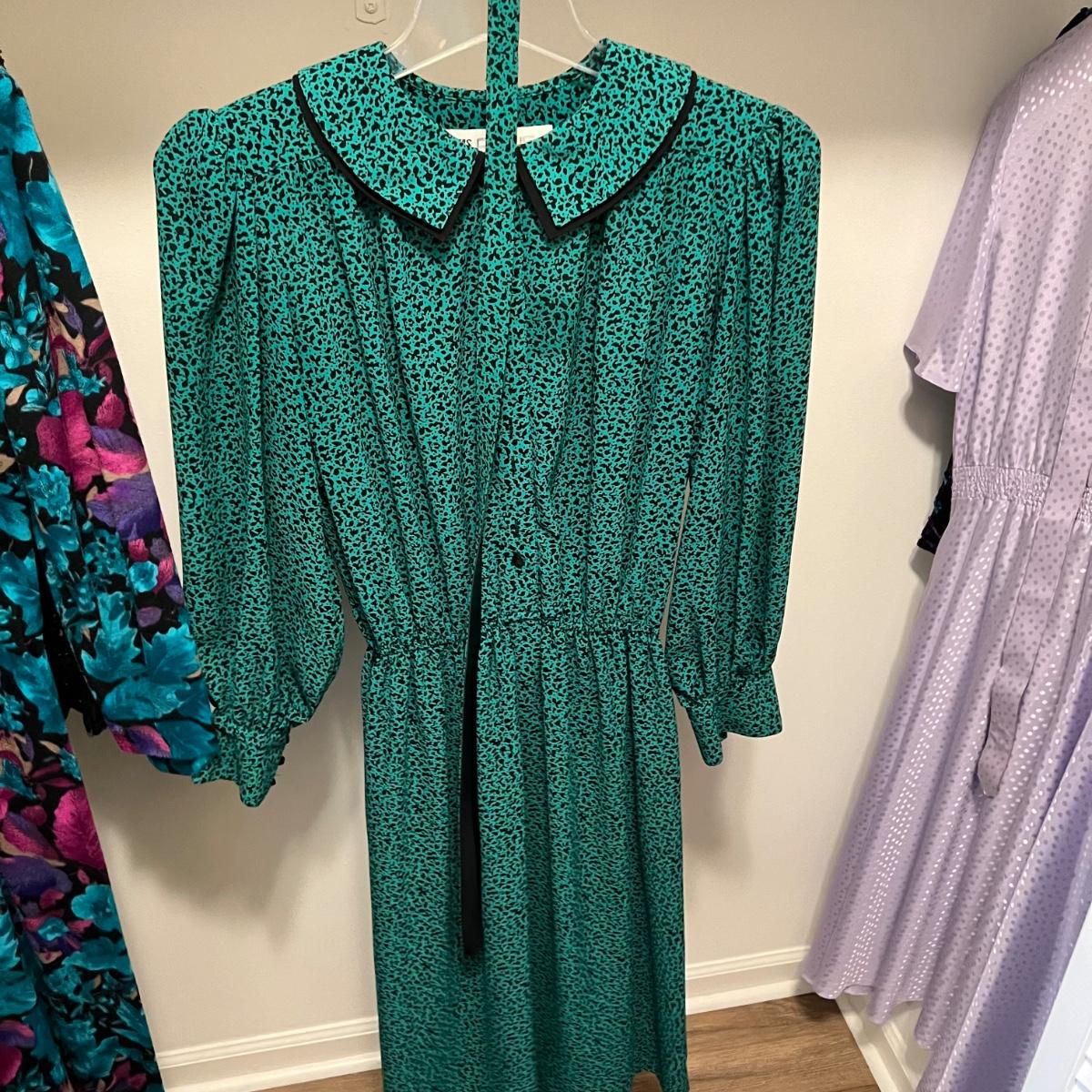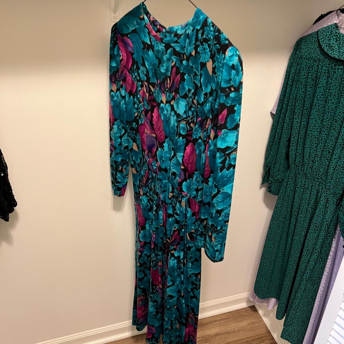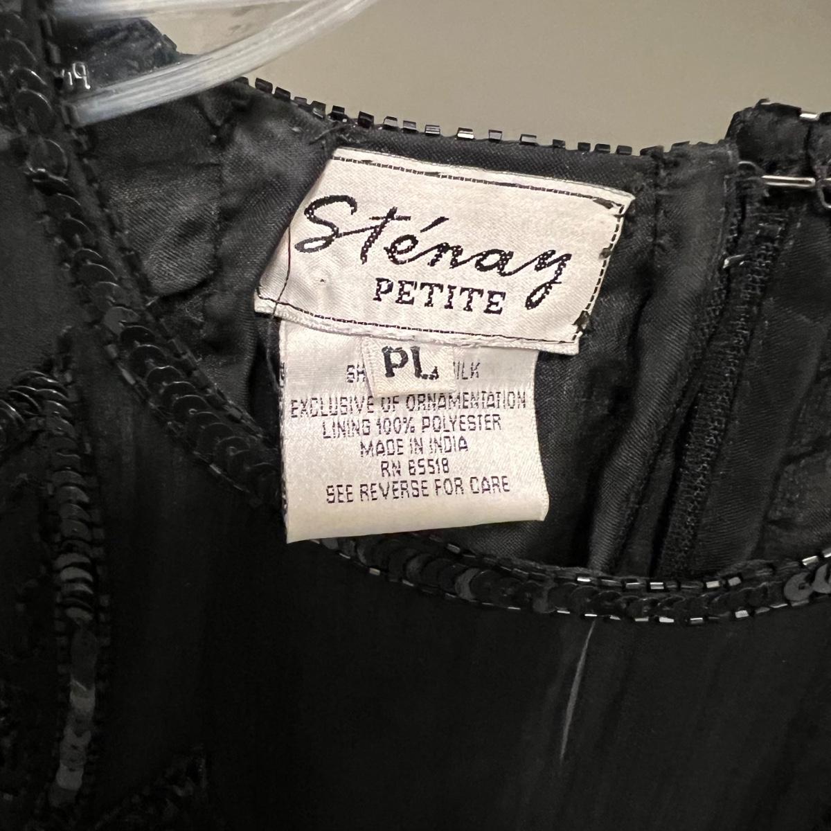 Three dresses. One Ms. Chaus, green and black size 8, one Jessica Howard, teal and black size 10, and one violet Ms, Chaus size 10. A black, petite large, sequin top and a teal and purple and black size medium sequin top.