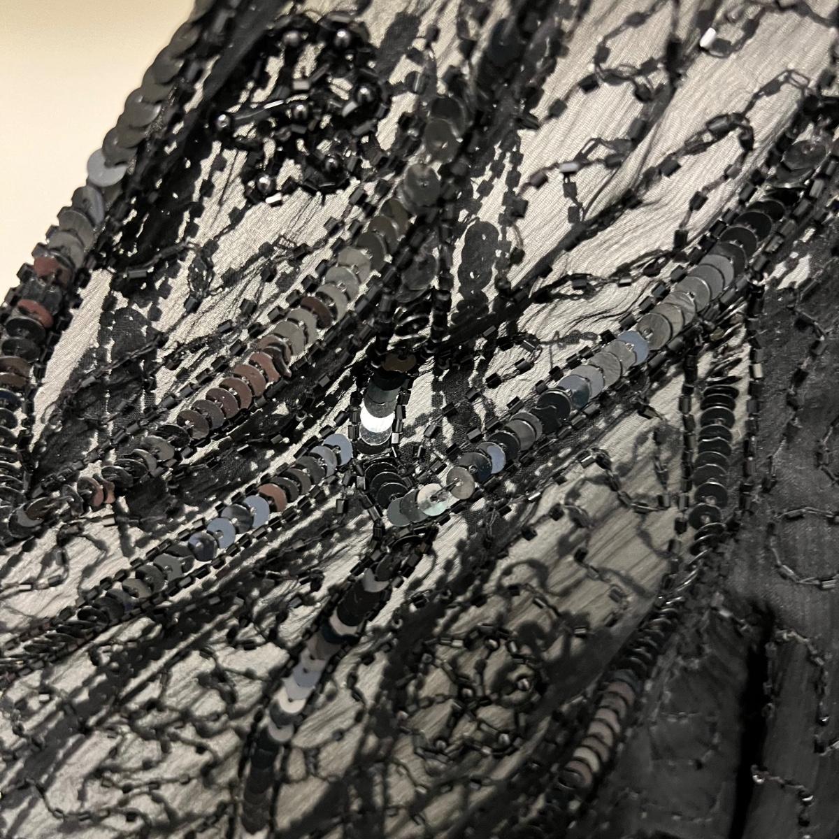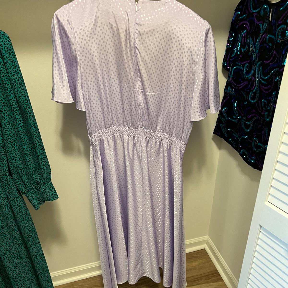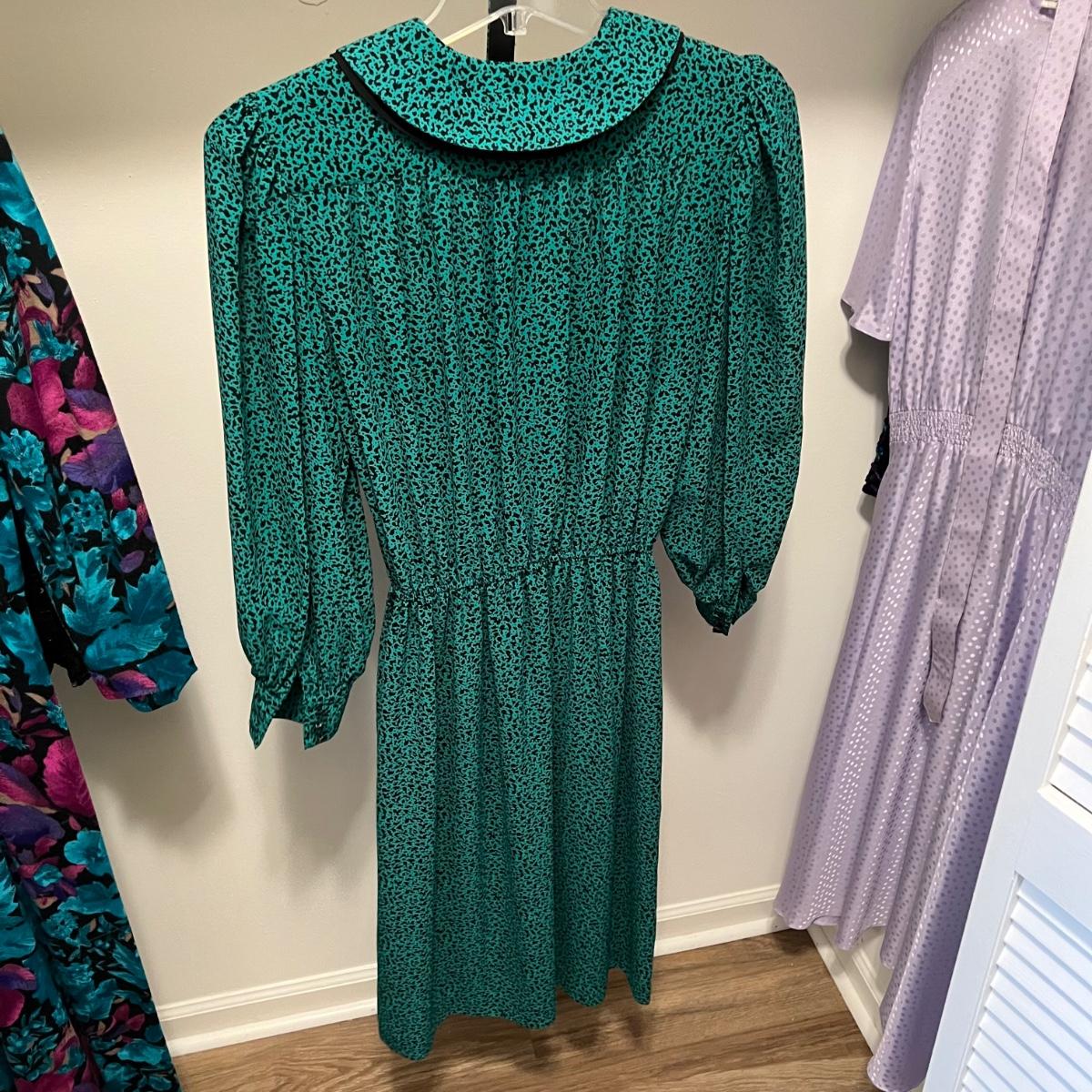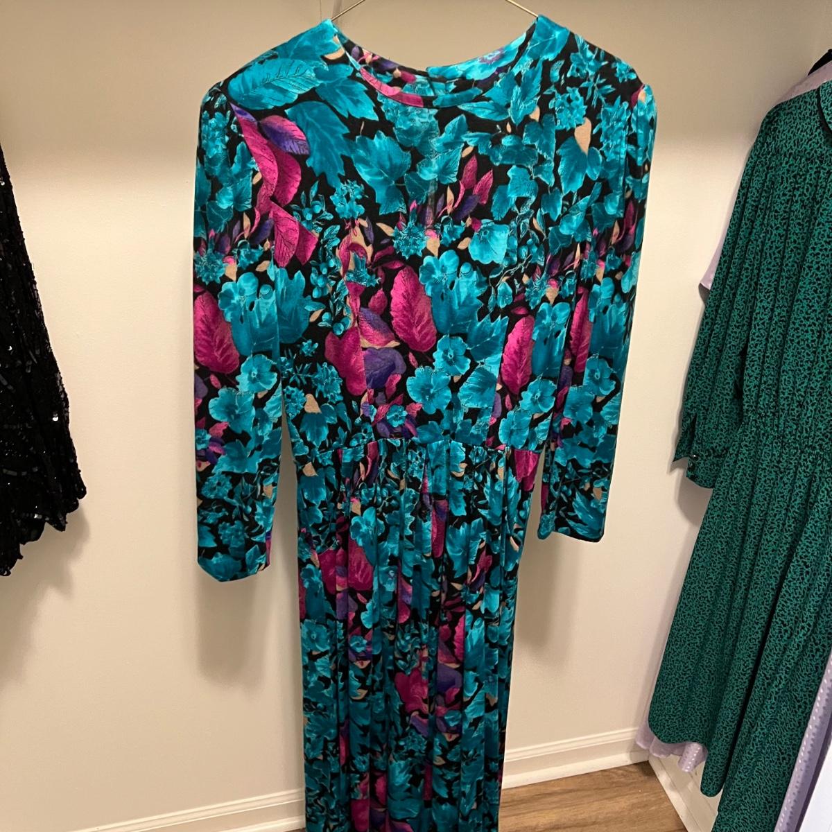 Three dresses. One Ms. Chaus, green and black size 8, one Jessica Howard, teal and black size 10, and one violet Ms, Chaus size 10. A black, petite large, sequin top and a teal and purple and black size medium sequin top.