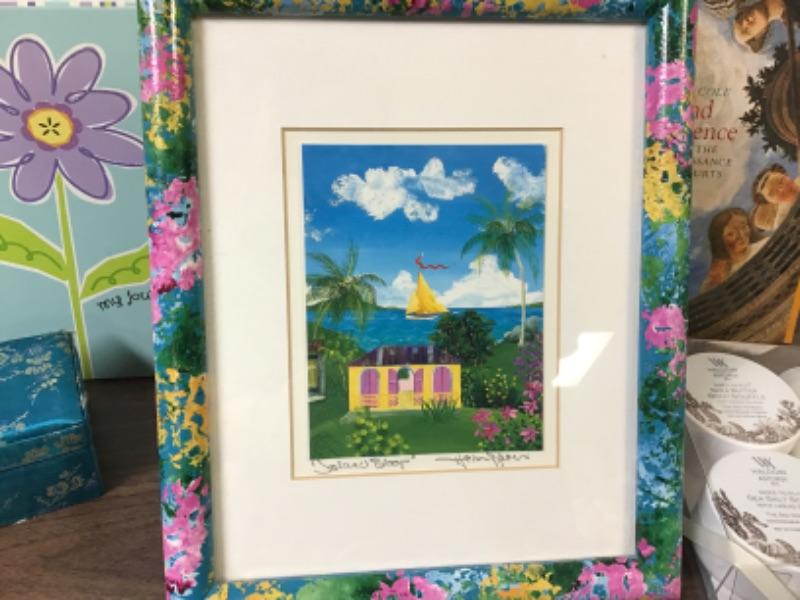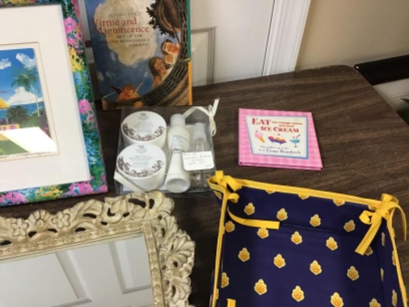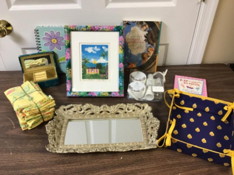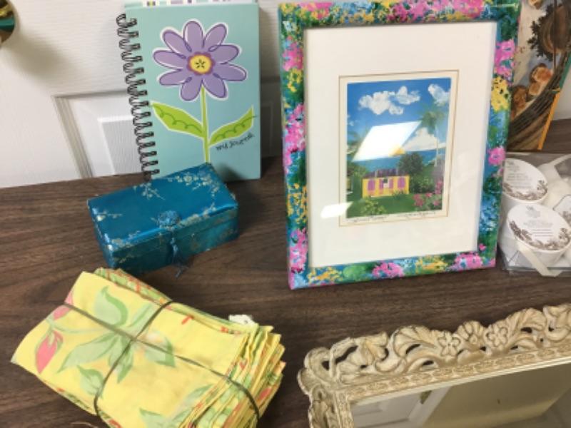 All pictured included! April Cornell cloth napkins. Waldorf Astoria vintage bath set, silk jewelry box, mirrored dressing tray, journal, book, Bahamas print framed, see pictures for more!