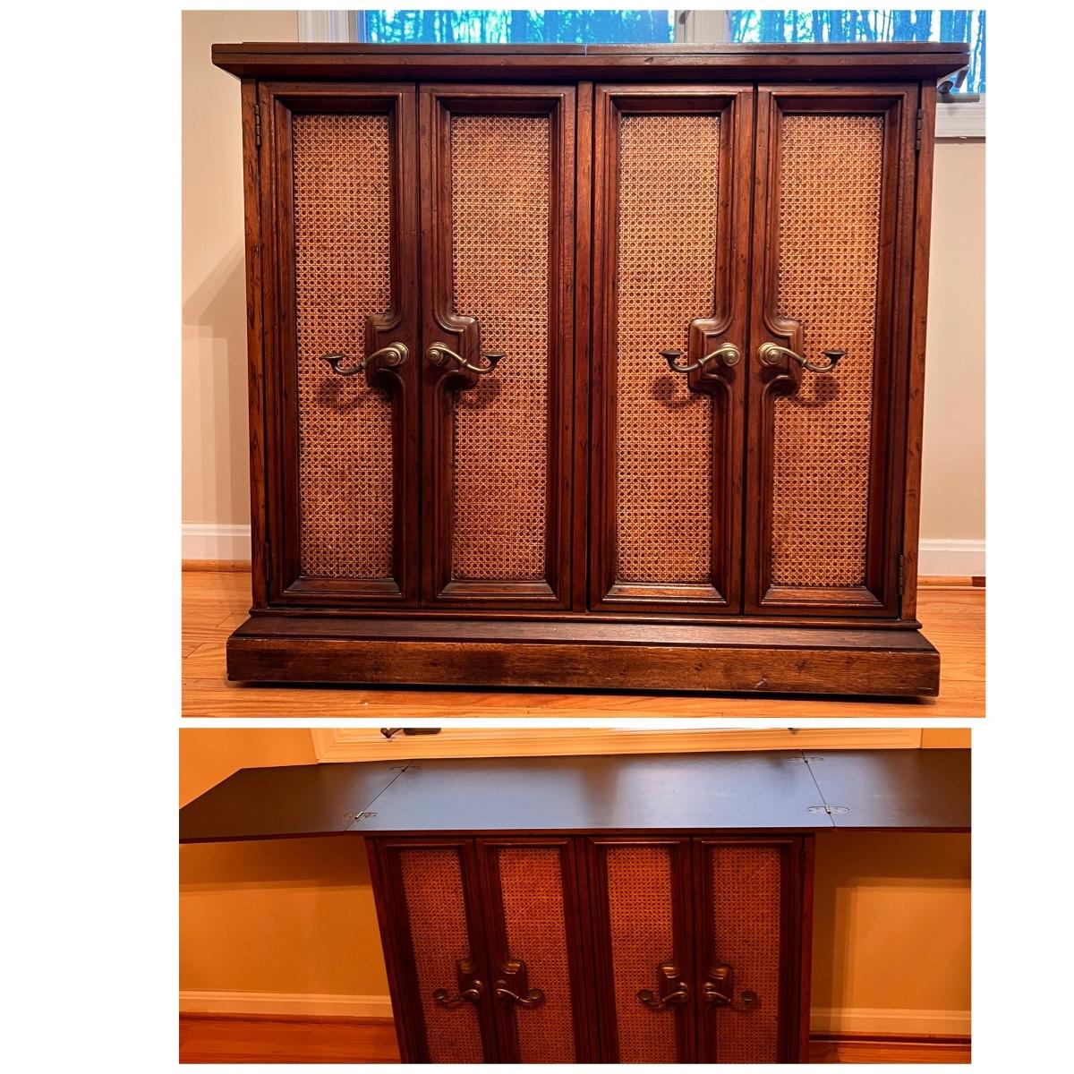 This is a very cool piece! top folds open for extra space. Cane panel doors open to drawer and 2 shelves. In good used condition. We are auctioning other Drexel furniture with same style.
