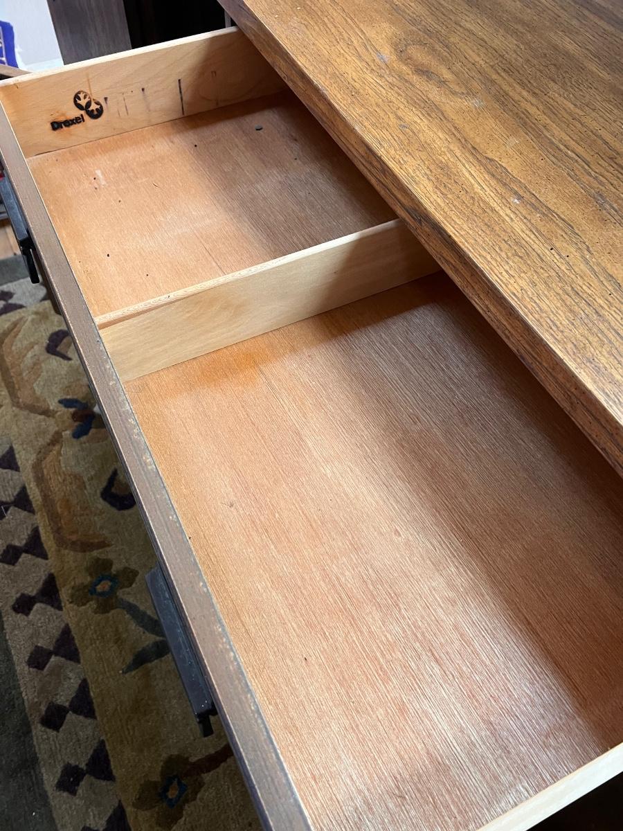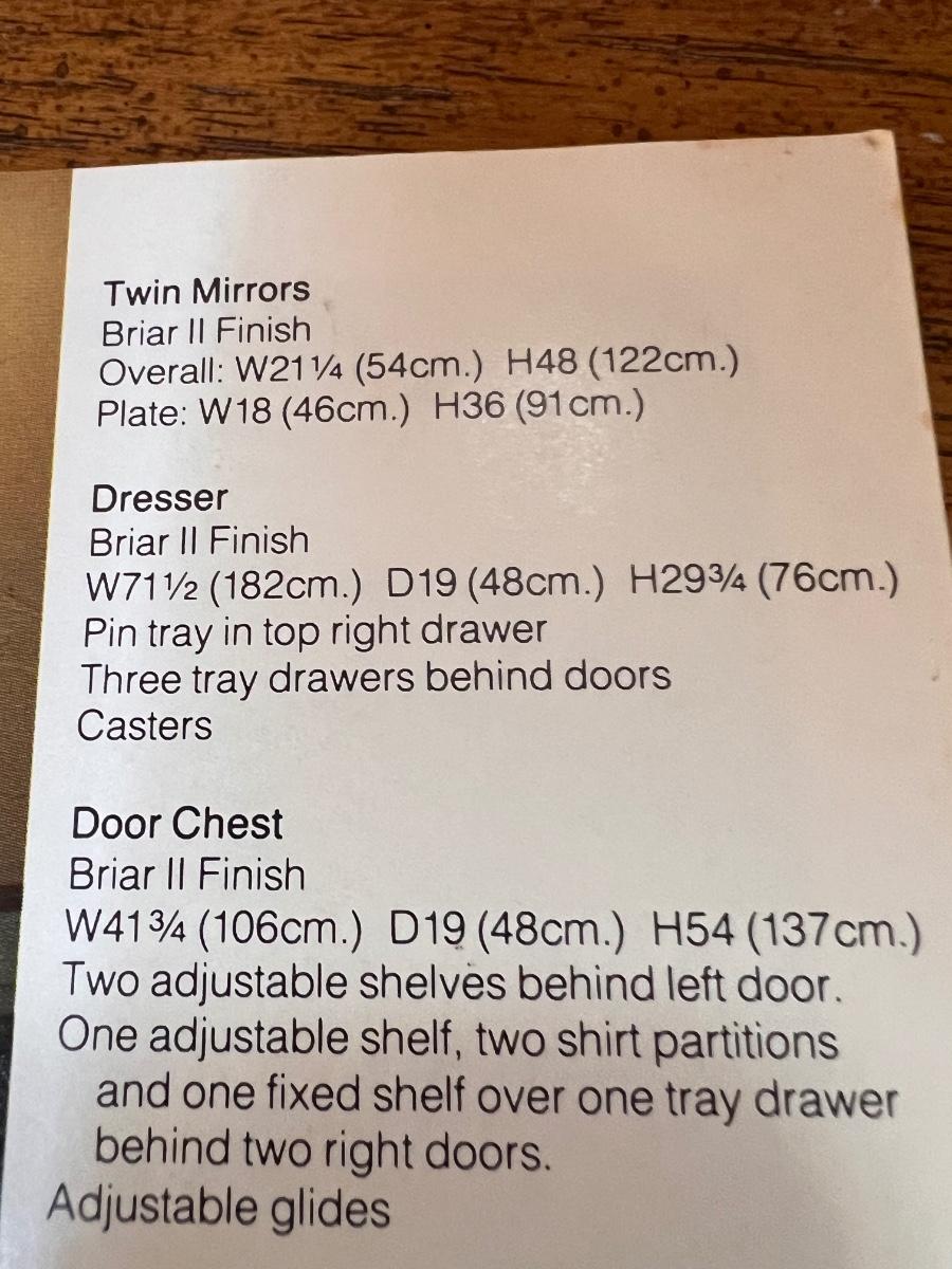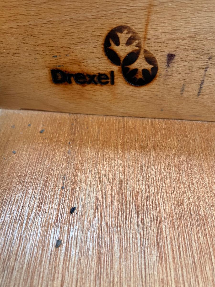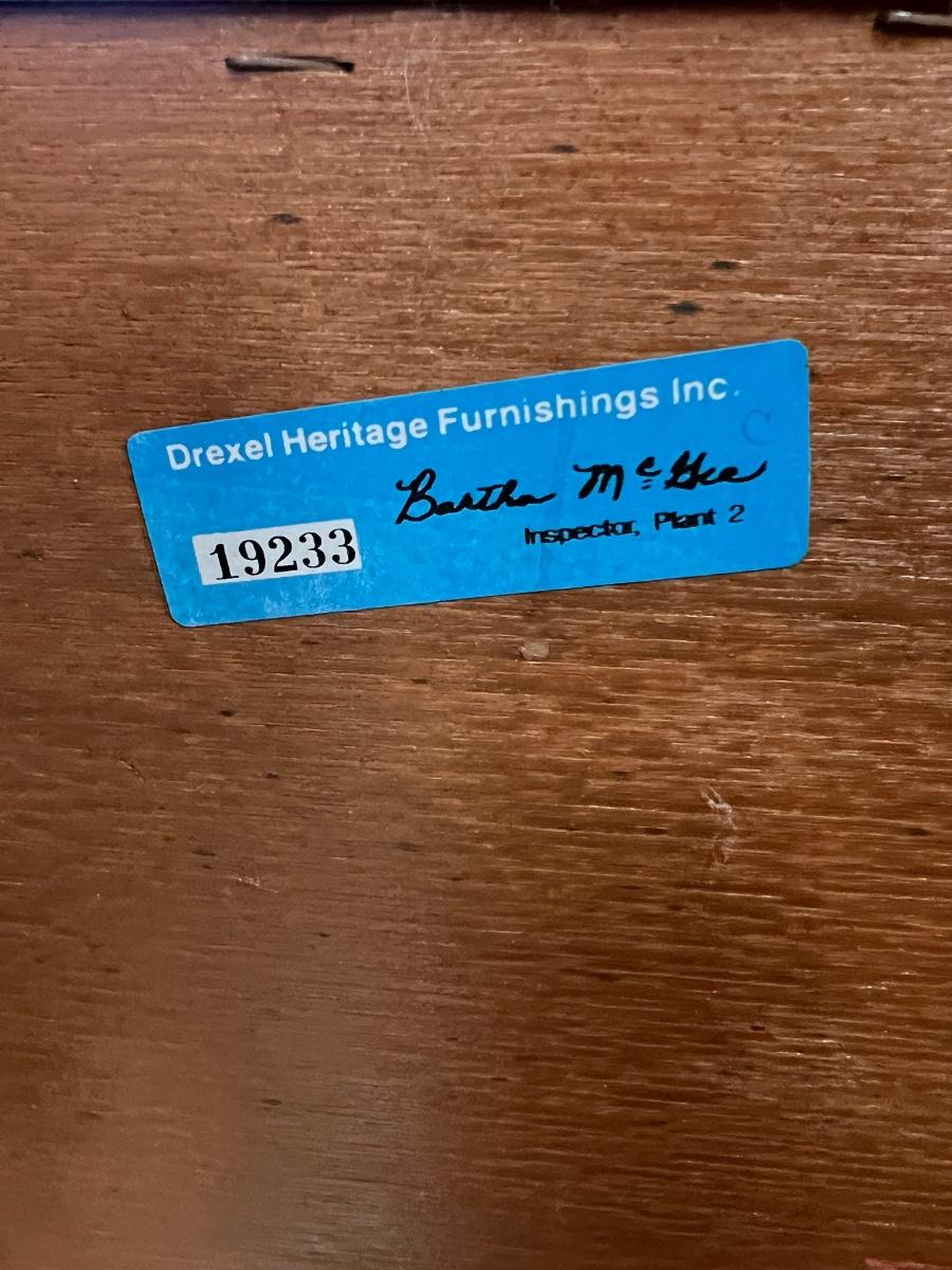 This beautiful Drexel solid wood dresser matches a display cabinet that is available in this auction. Dresser comes with booklet, see image as it shows measurements. There are some light stains in a few drawers which are likely from candles. Hardware is metal with a dark brown finish.