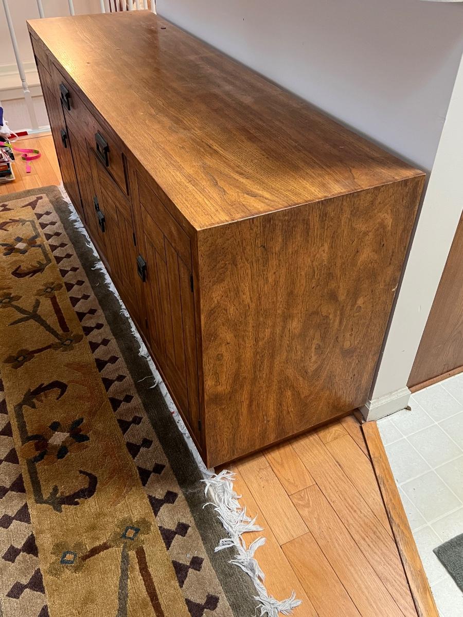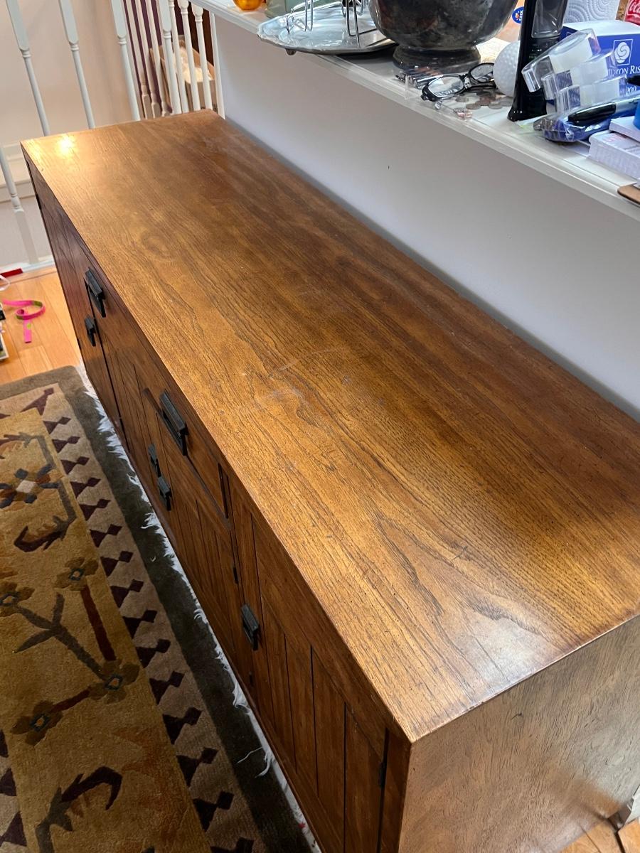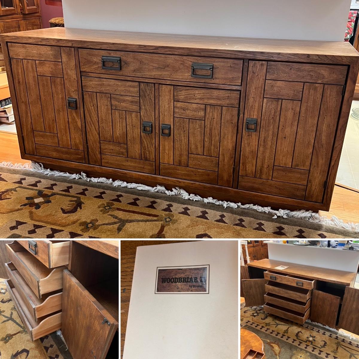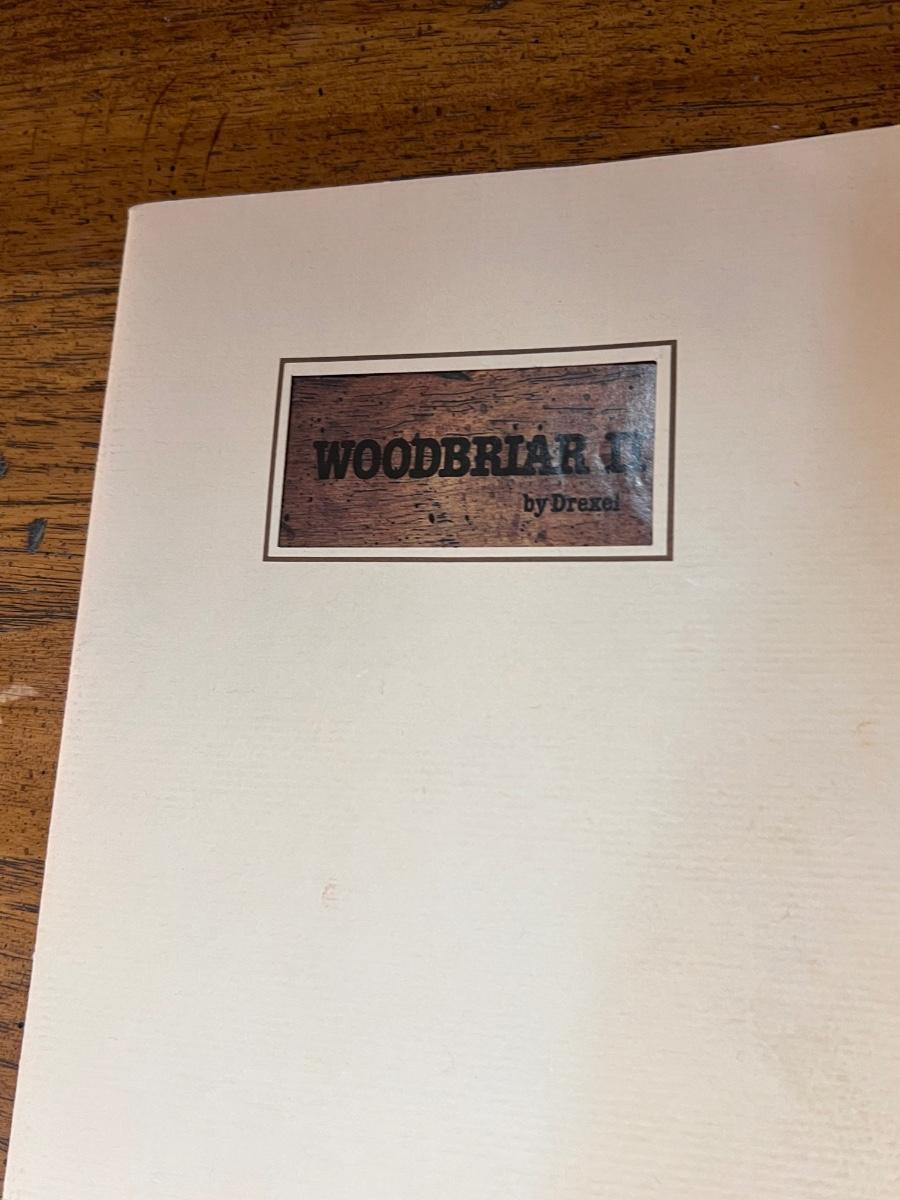 This beautiful Drexel solid wood dresser matches a display cabinet that is available in this auction. Dresser comes with booklet, see image as it shows measurements. There are some light stains in a few drawers which are likely from candles. Hardware is metal with a dark brown finish.