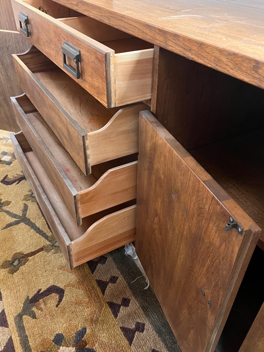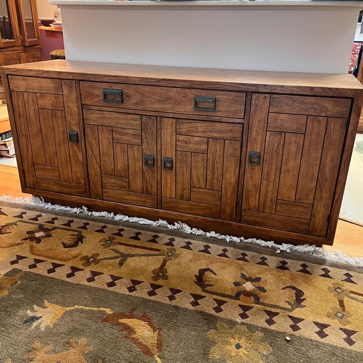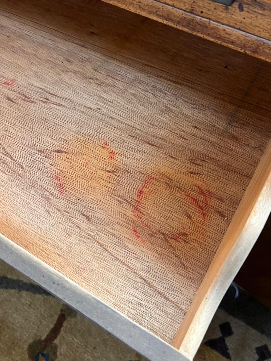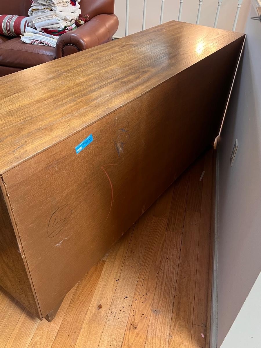 This beautiful Drexel solid wood dresser matches a display cabinet that is available in this auction. Dresser comes with booklet, see image as it shows measurements. There are some light stains in a few drawers which are likely from candles. Hardware is metal with a dark brown finish.