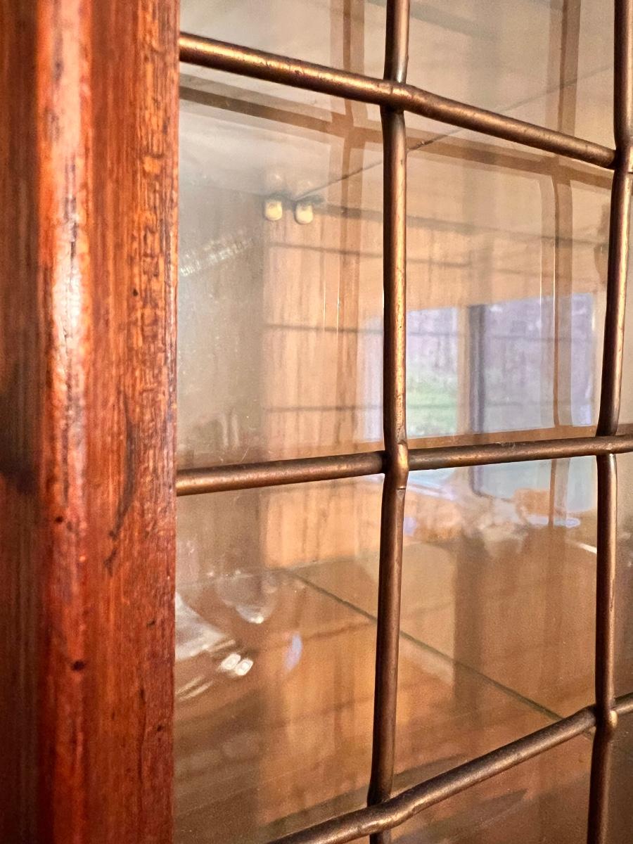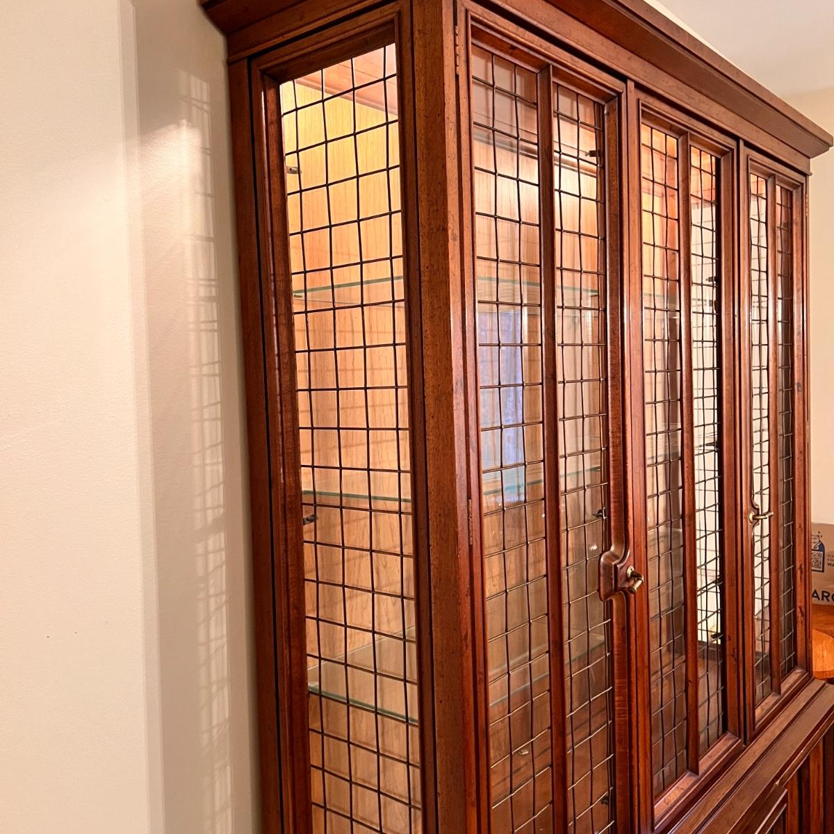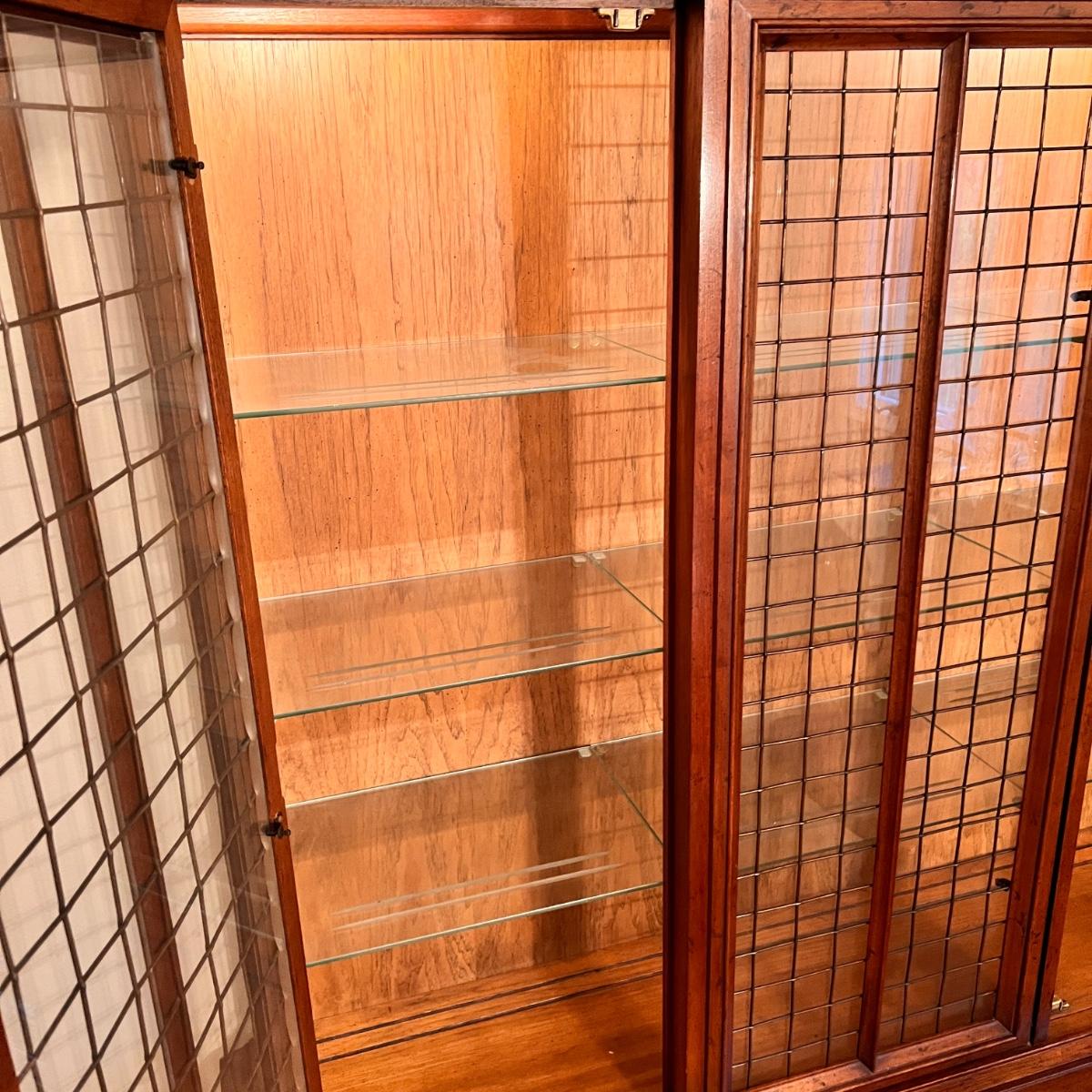 Glass shelves with display notch for leaning items, overhead light, 4 drawers, 2 cabinets with shelves. In good used condition. We also are auctioning other Drexel pieces of furniture with similar style (lot 750 and 751).