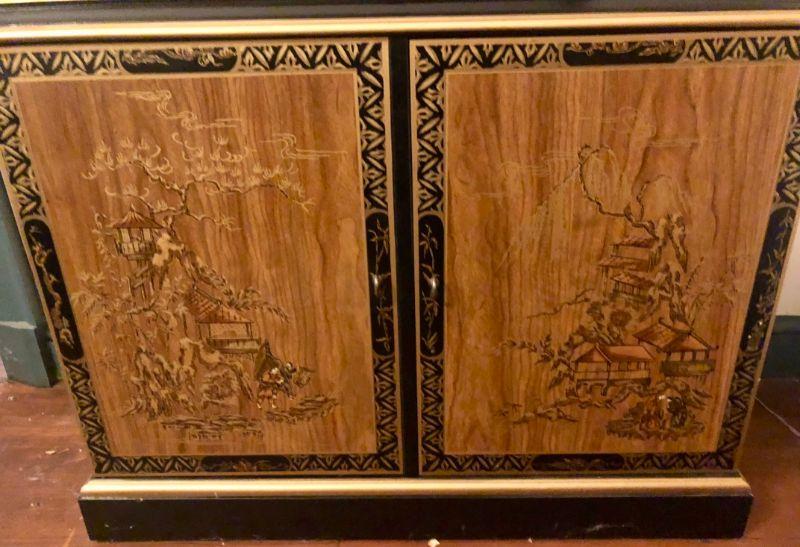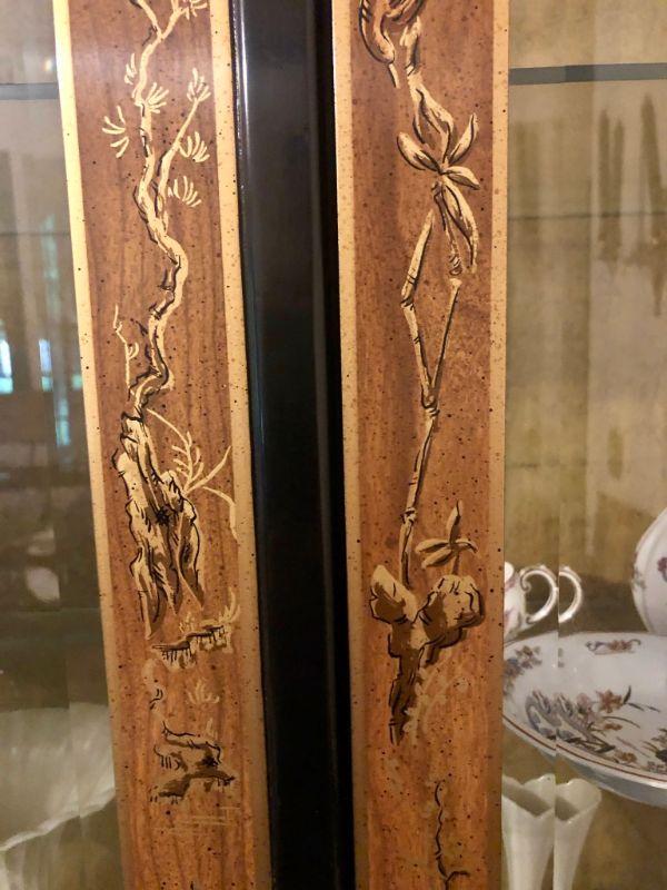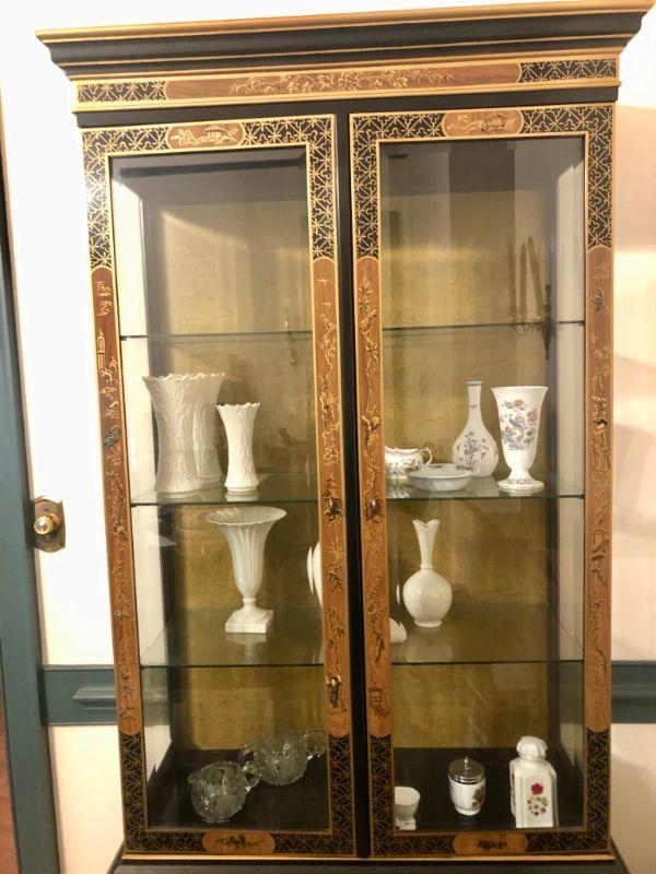 Drexel Chinoiserie Laquer Fruitwood China Cabinet. Very lovely in person and in great condition. 35x14.5x80.5