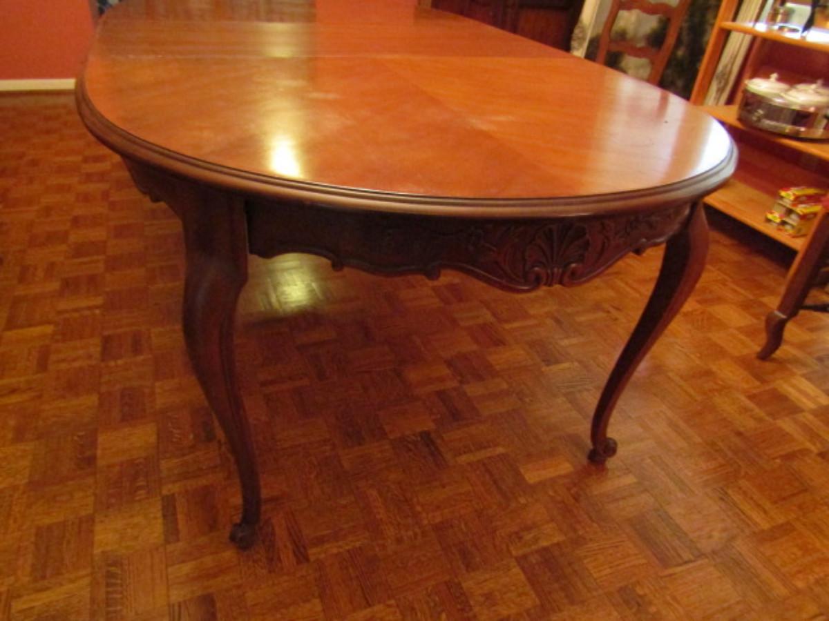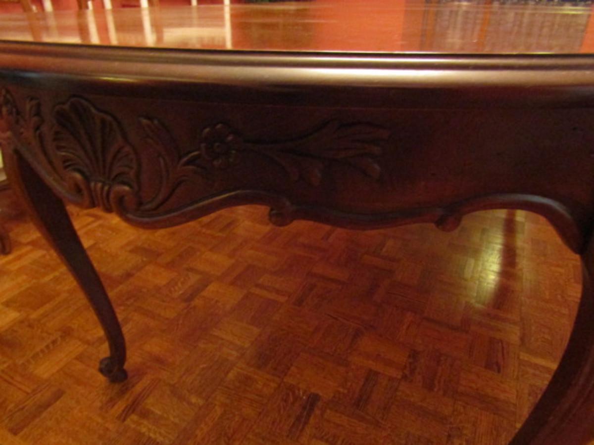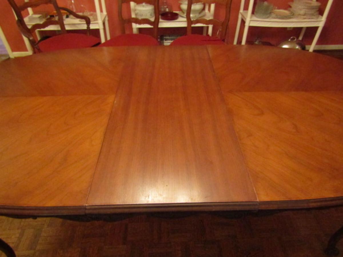 Drexel Dining Table- French in the Country Manner Style. Table is approx 43 3/4" wide, and has overall length of 81 3/4" with the 18" leaf inserted.