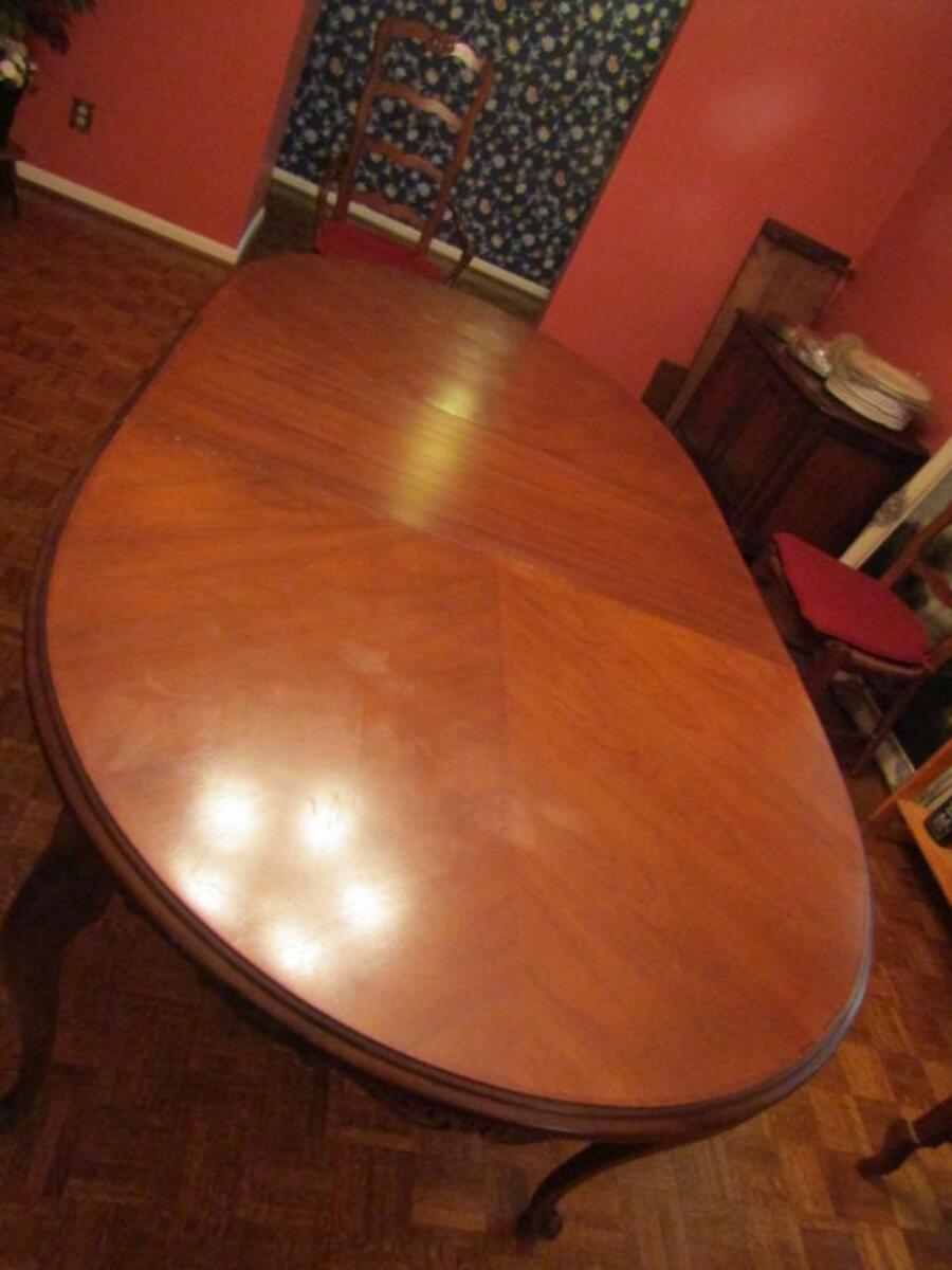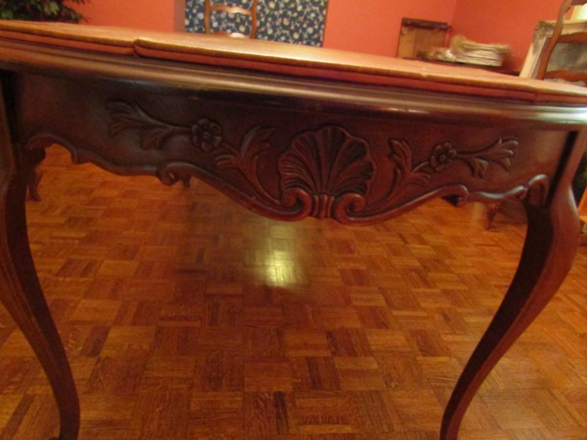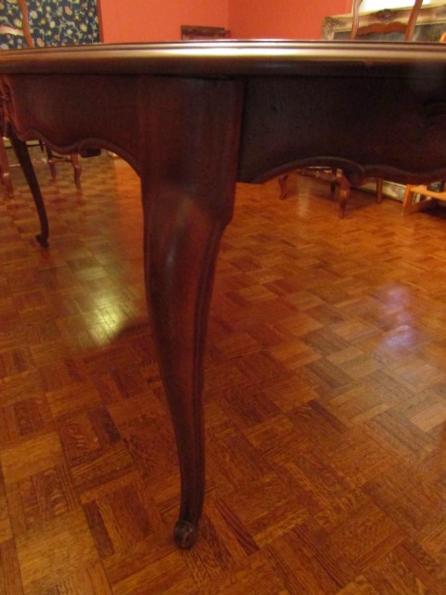 Drexel Dining Table- French in the Country Manner Style. Table is approx 43 3/4" wide, and has overall length of 81 3/4" with the 18" leaf inserted.