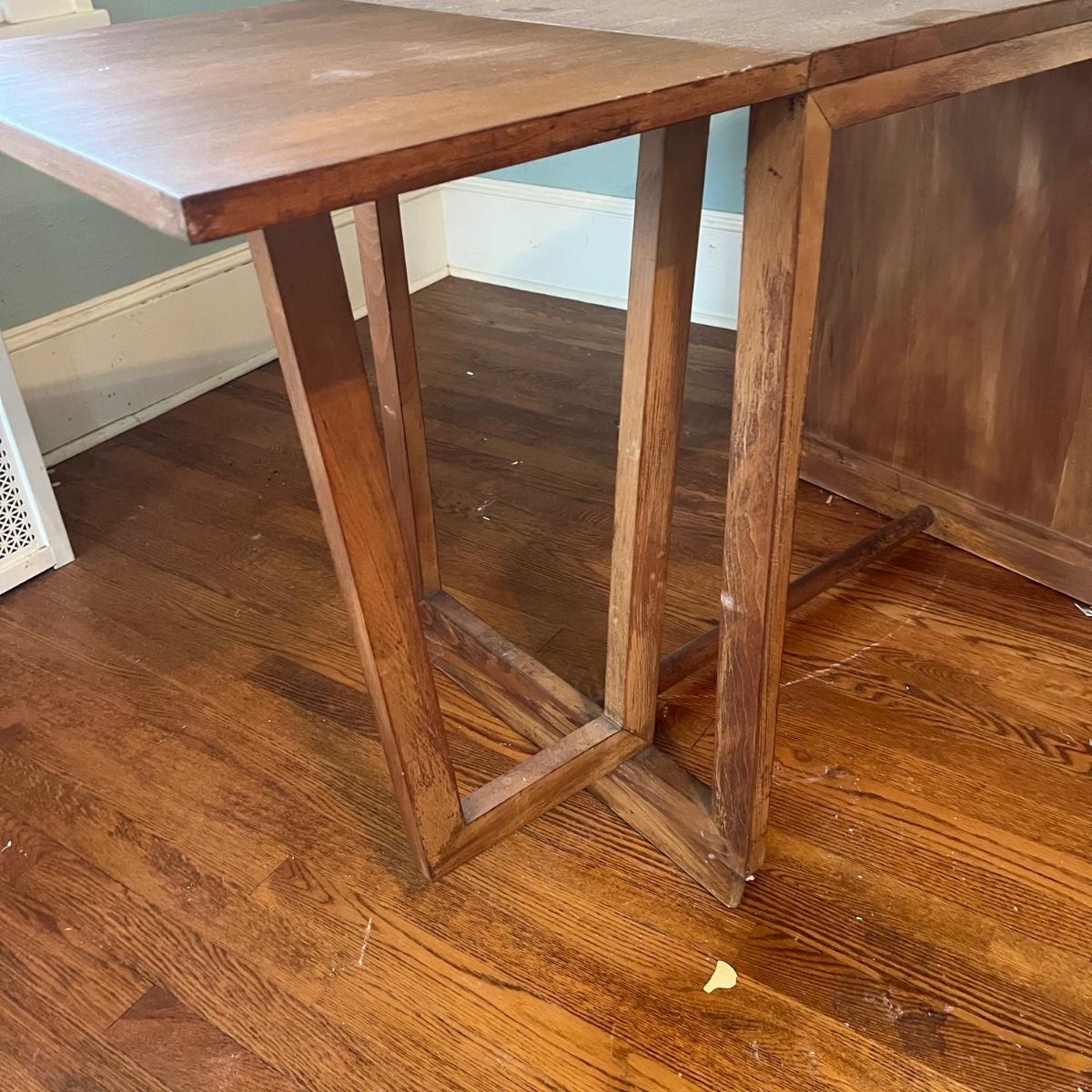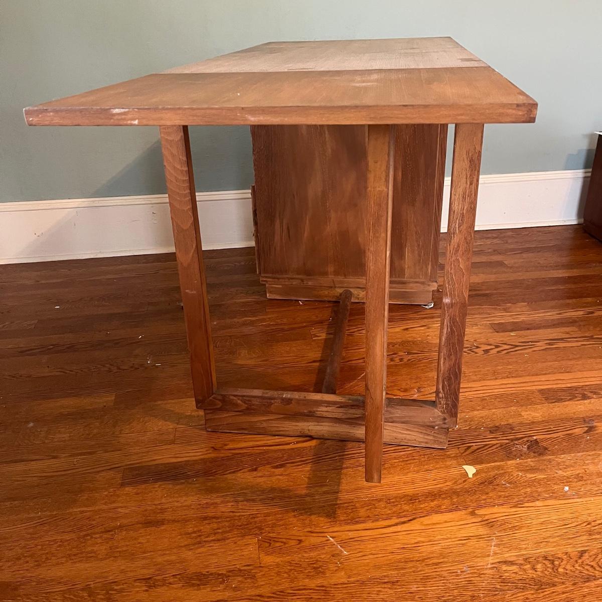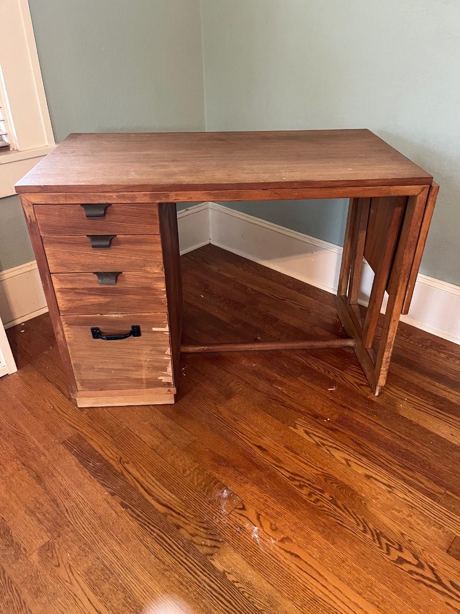 Wooden Drexel Drop Leaf Desk has four drawers and a drop leaf extension on the right side of desk. Drawers have metal pulls.