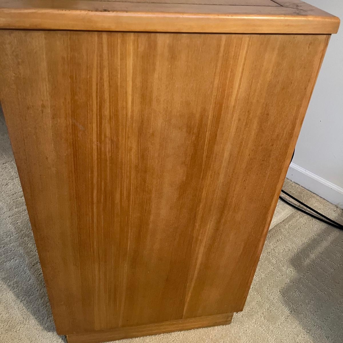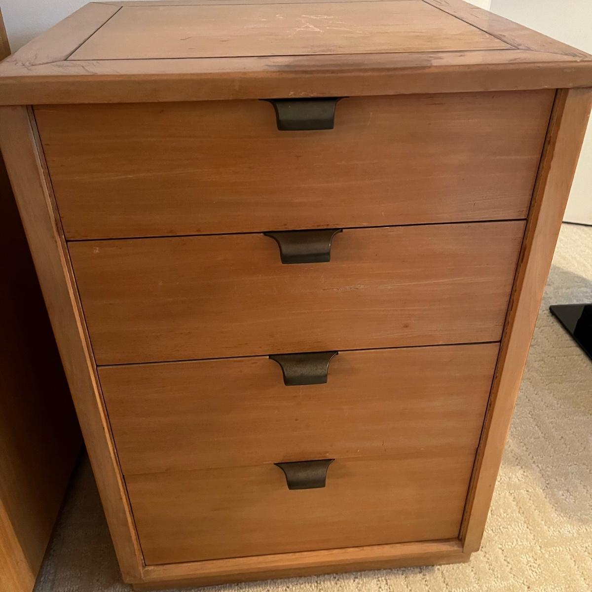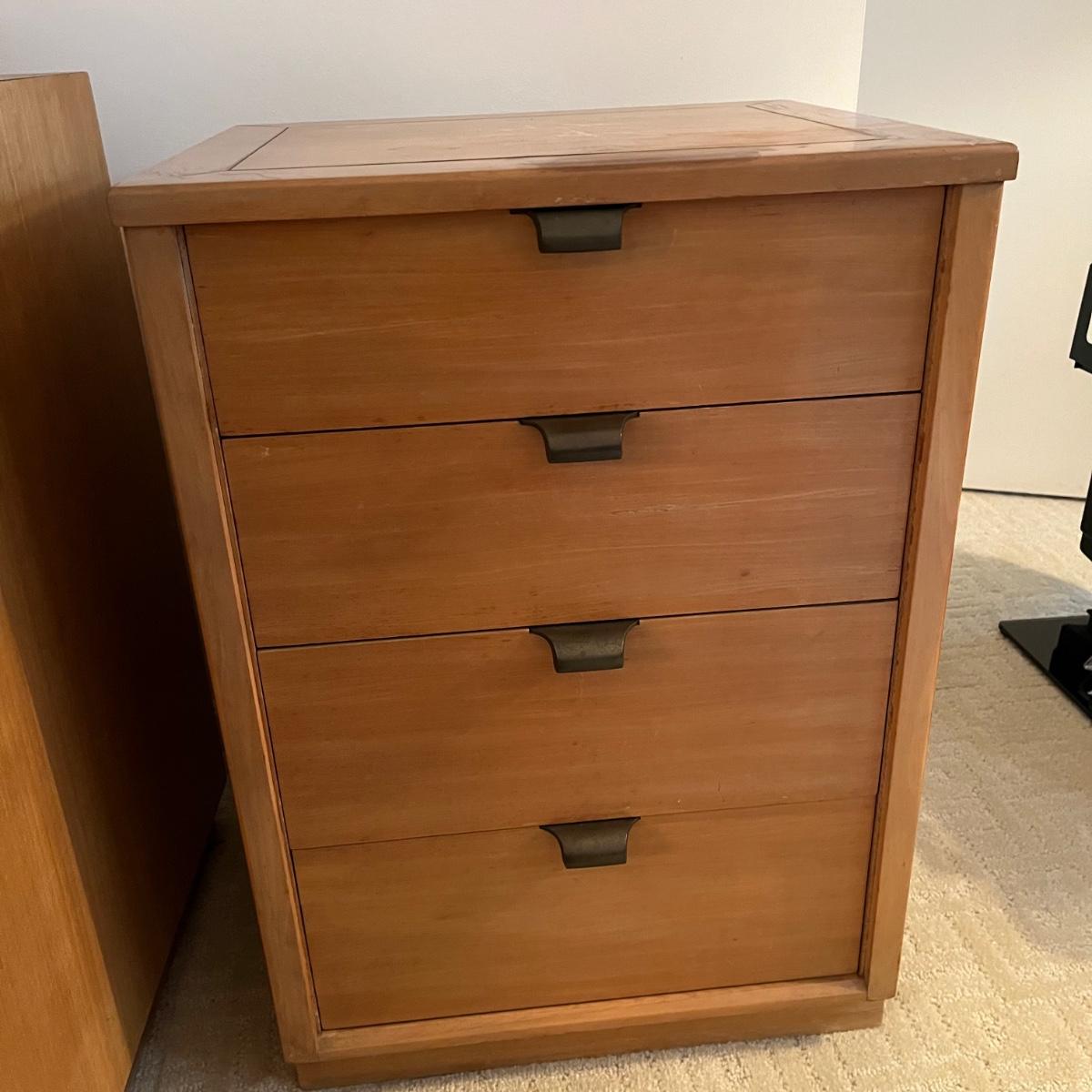 Lot includes a four dovetailed drawer chest by Drexel. Chest has a few scratches an gouges on top, see pictures. See earlier in sale for matching piece. Chest measures 17.5” x 20” x 28.5”. Local pickup only.