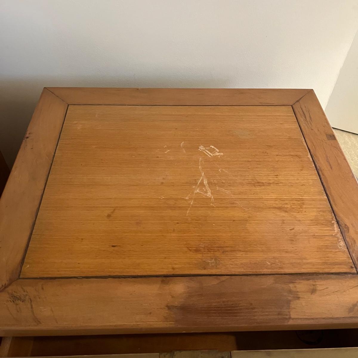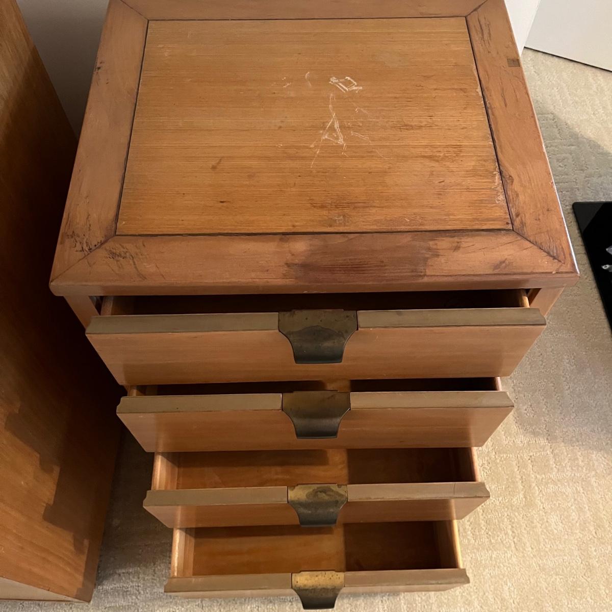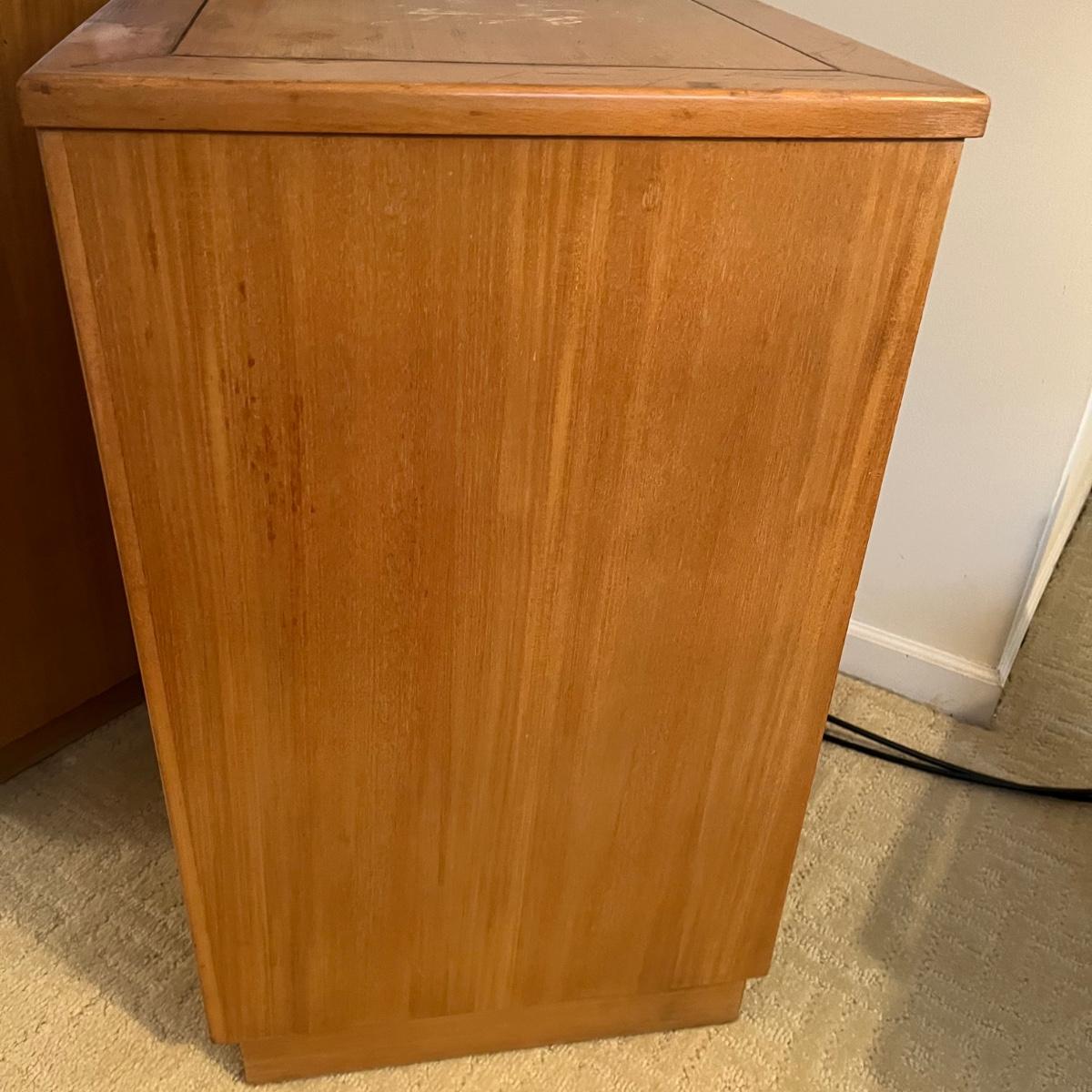 Lot includes a four dovetailed drawer chest by Drexel. Chest has a few scratches an gouges on top, see pictures. See earlier in sale for matching piece. Chest measures 17.5” x 20” x 28.5”. Local pickup only.