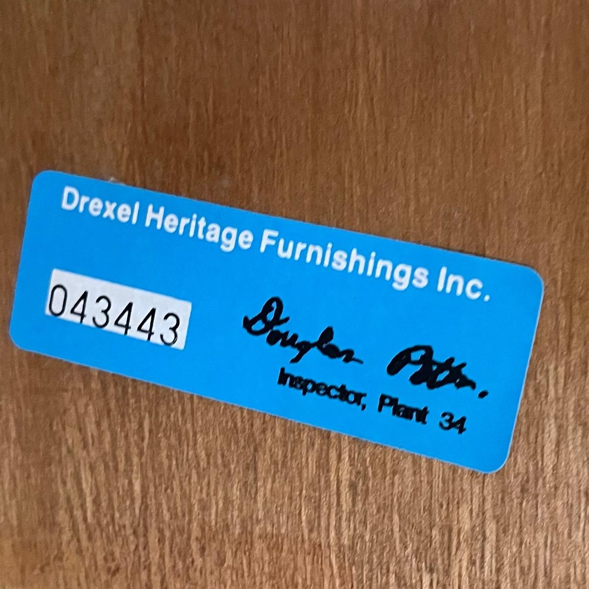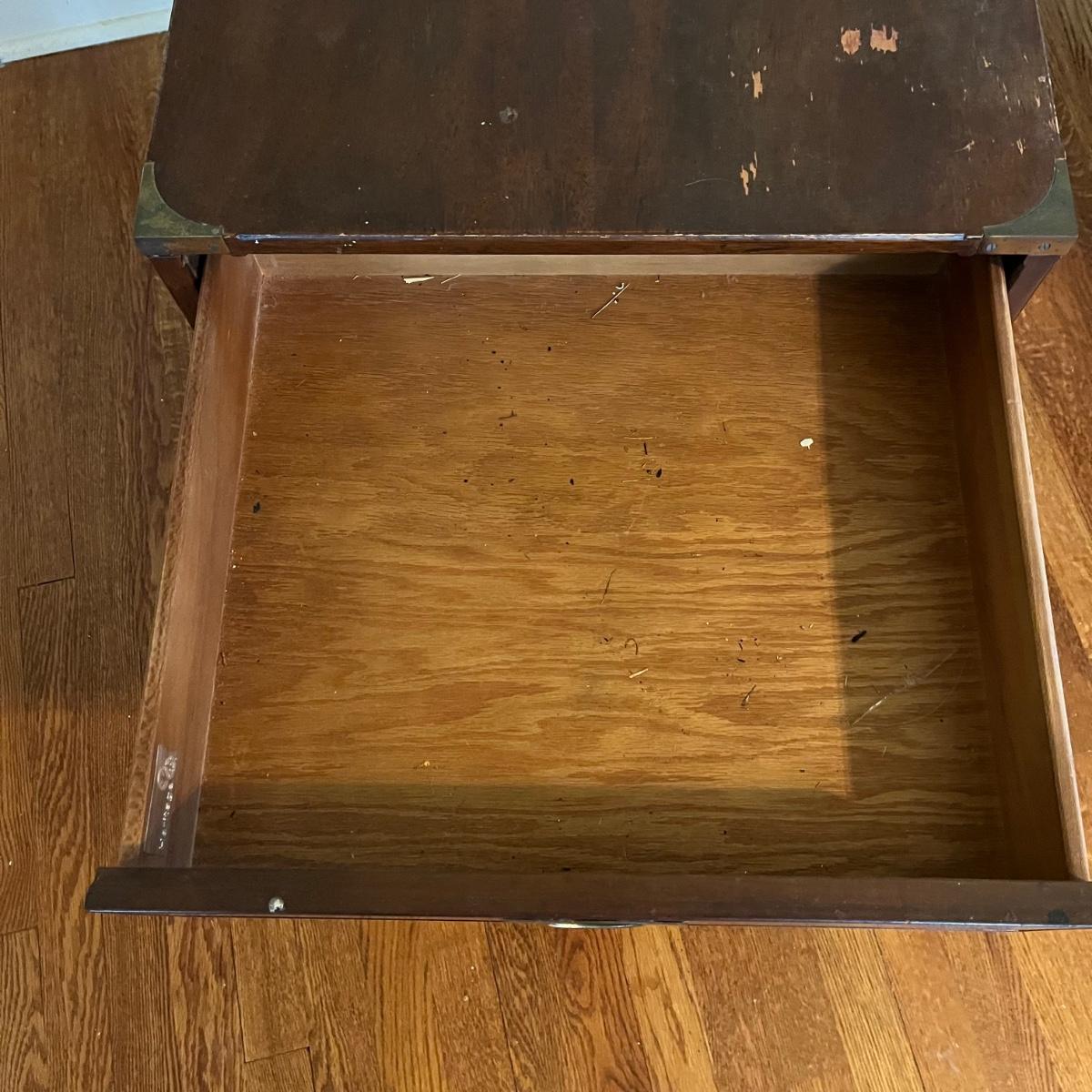 Dark wood Drexel Heritage side table with one drawer. Brass detailing. Measures 20.5” x 25.5” x 23”H. Signs of wear.