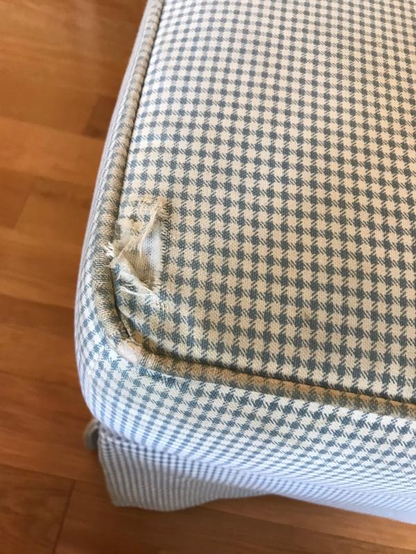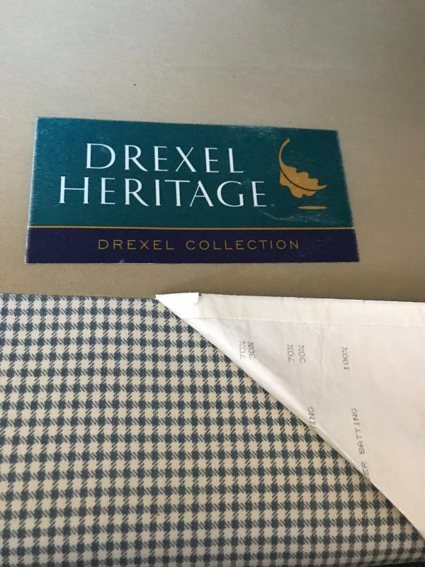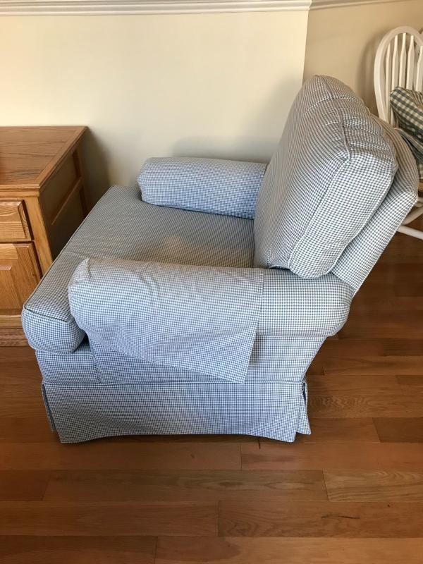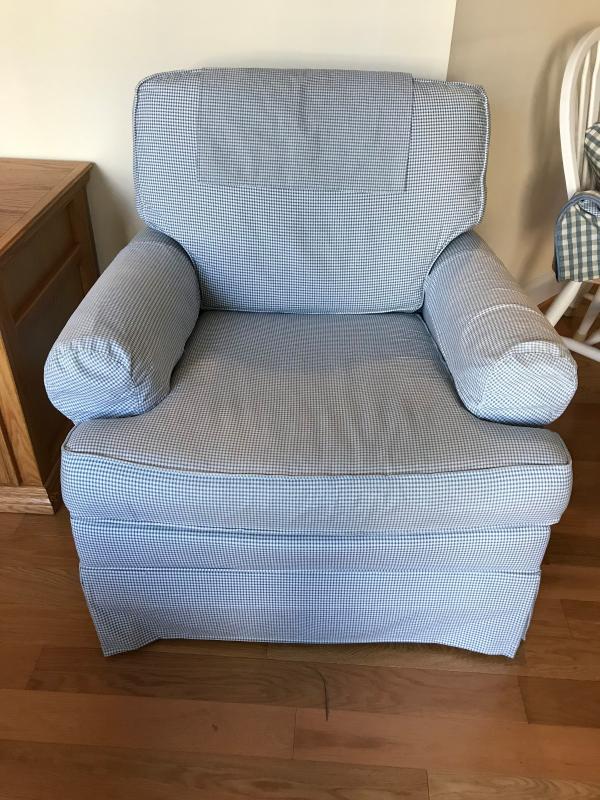 Very nice Drexel Heritage club chair. Loose pillow back and seat. Pleated skirt. 38" x 34" x 34" H Matching ottoman has wear and needs cleaning. 19" x 28" x 16" All upholstered in a blue and white check. Extra fabric to match. Pet and smoke free house.