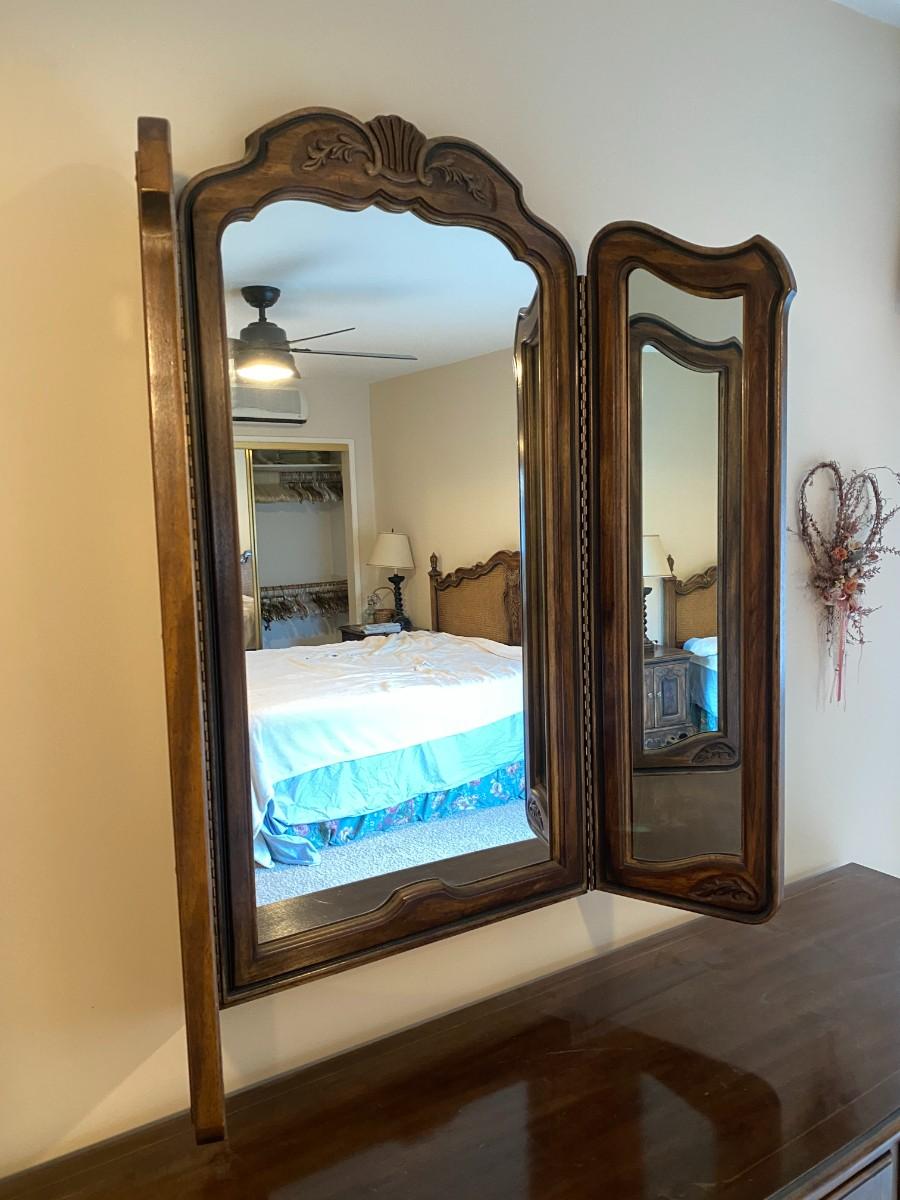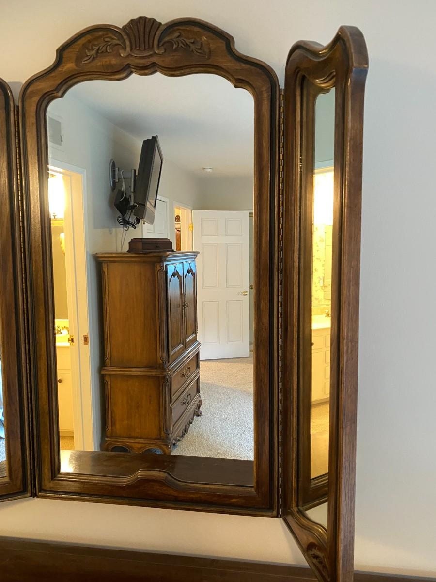 Gorgeous dresser and mirror set. Both in excellent condition. The wardrobe mirror is an added touch.