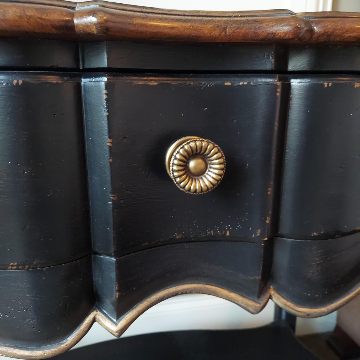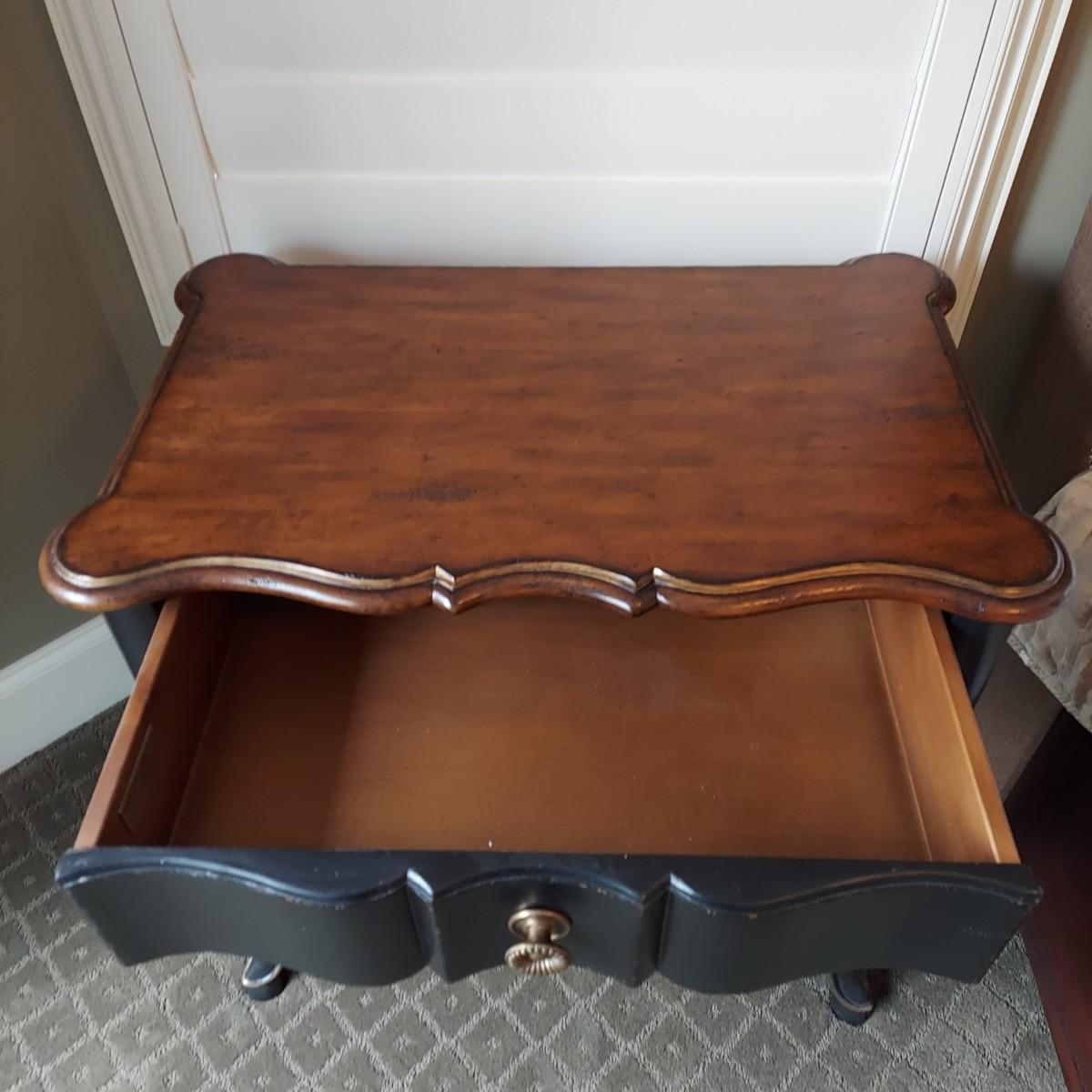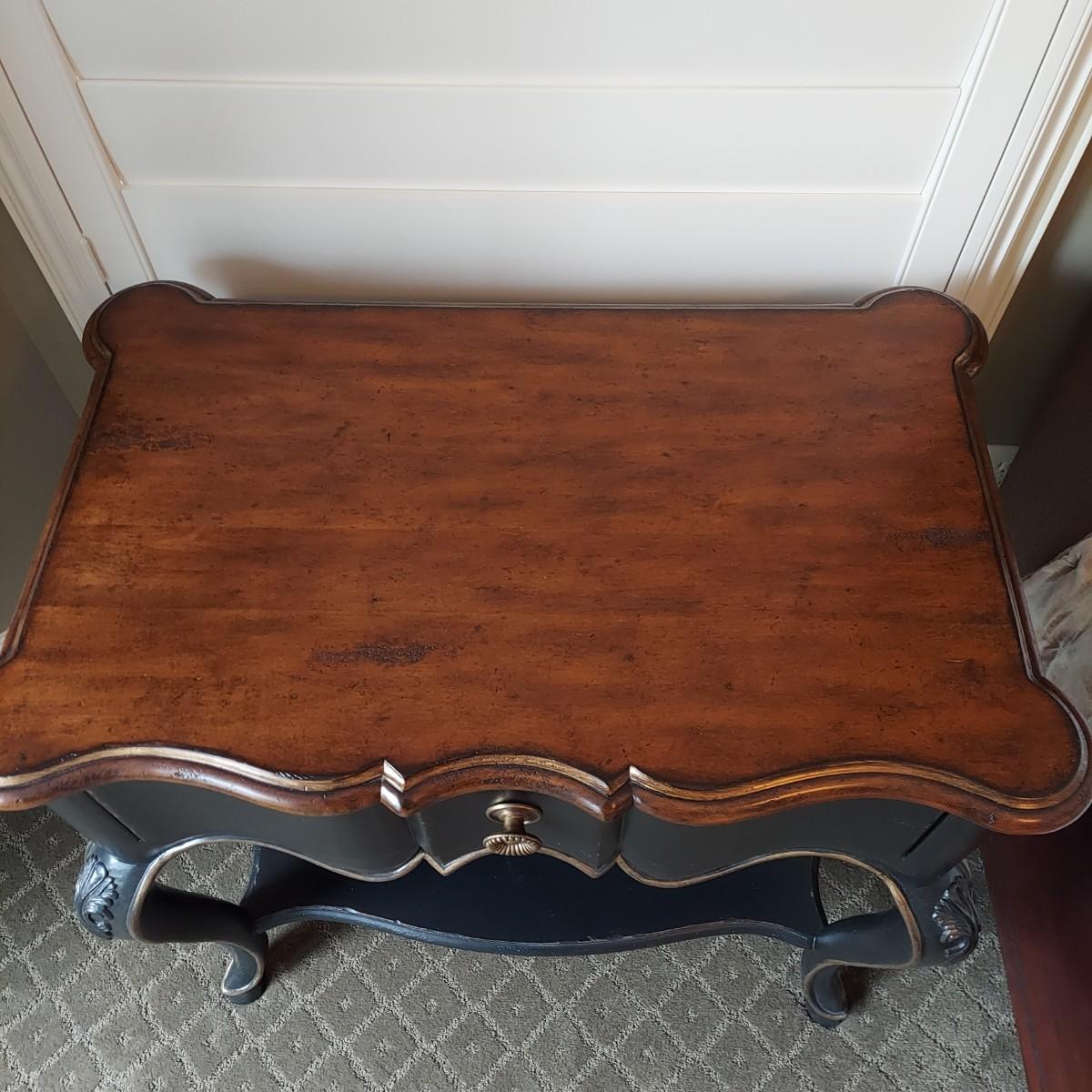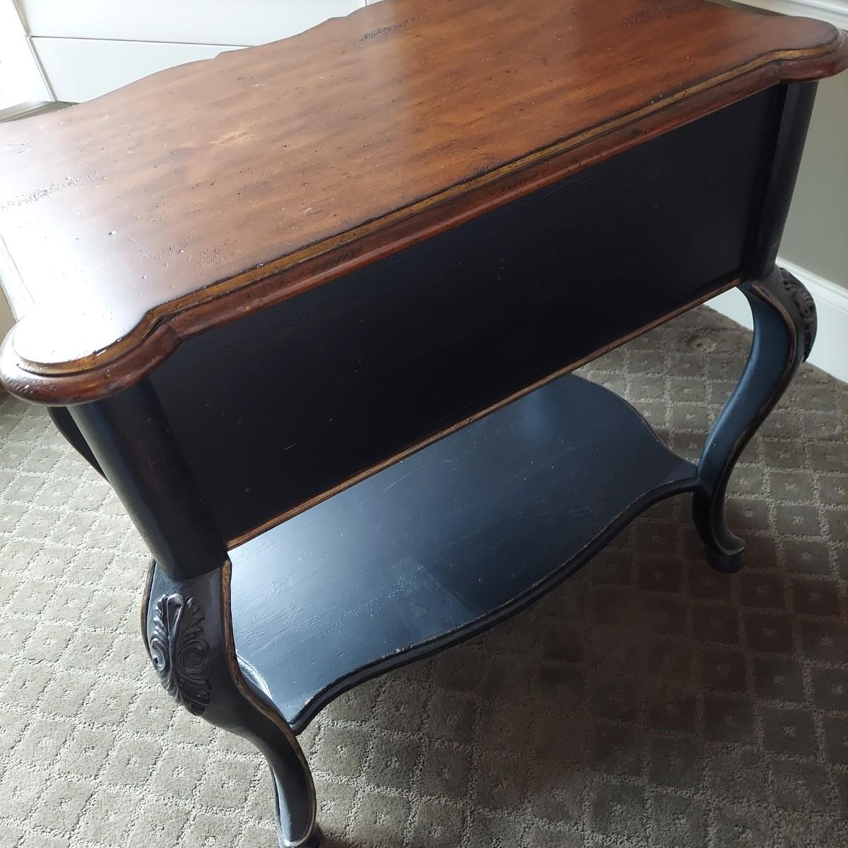 Beautiful solid wood antique style side table by Drexel Heritage. Has dovetailed drawers. Black with gold details. Stained wood top. Measures 32” x 20” x 32"H. Please see photos for details. Local Pickup Only.