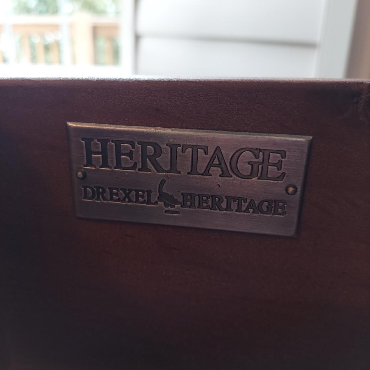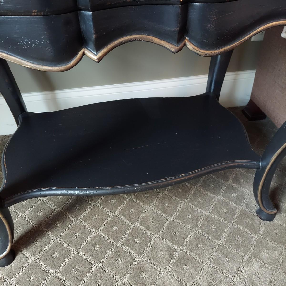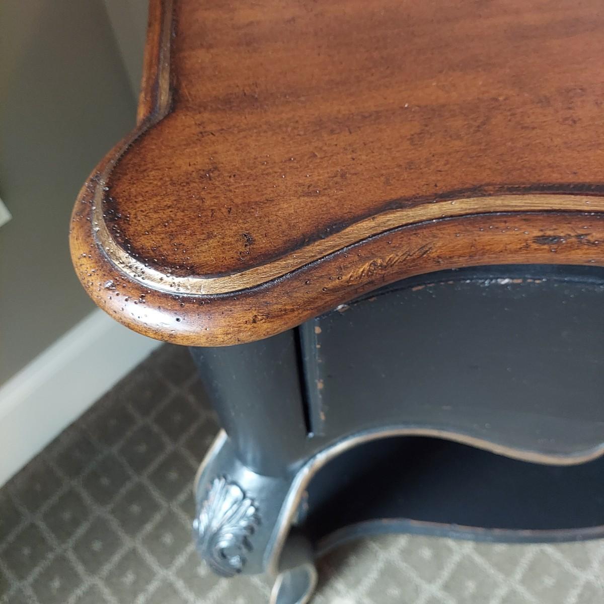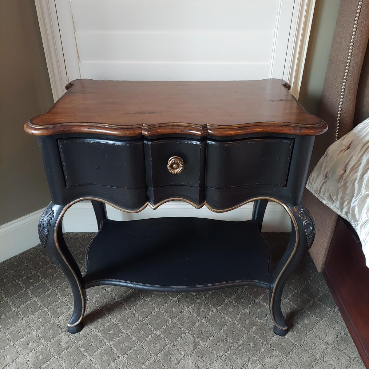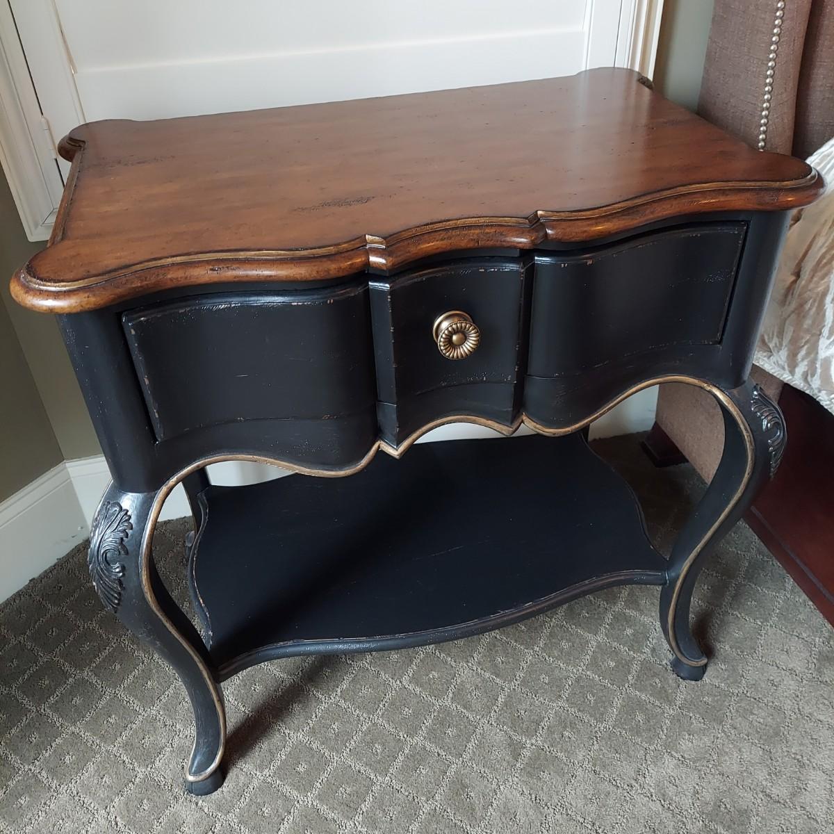 Beautiful solid wood antique style side table by Drexel Heritage. Has dovetailed drawers. Black with gold details. Stained wood top. Measures 32” x 20” x 32"H. Please see photos for details. Local Pickup Only.