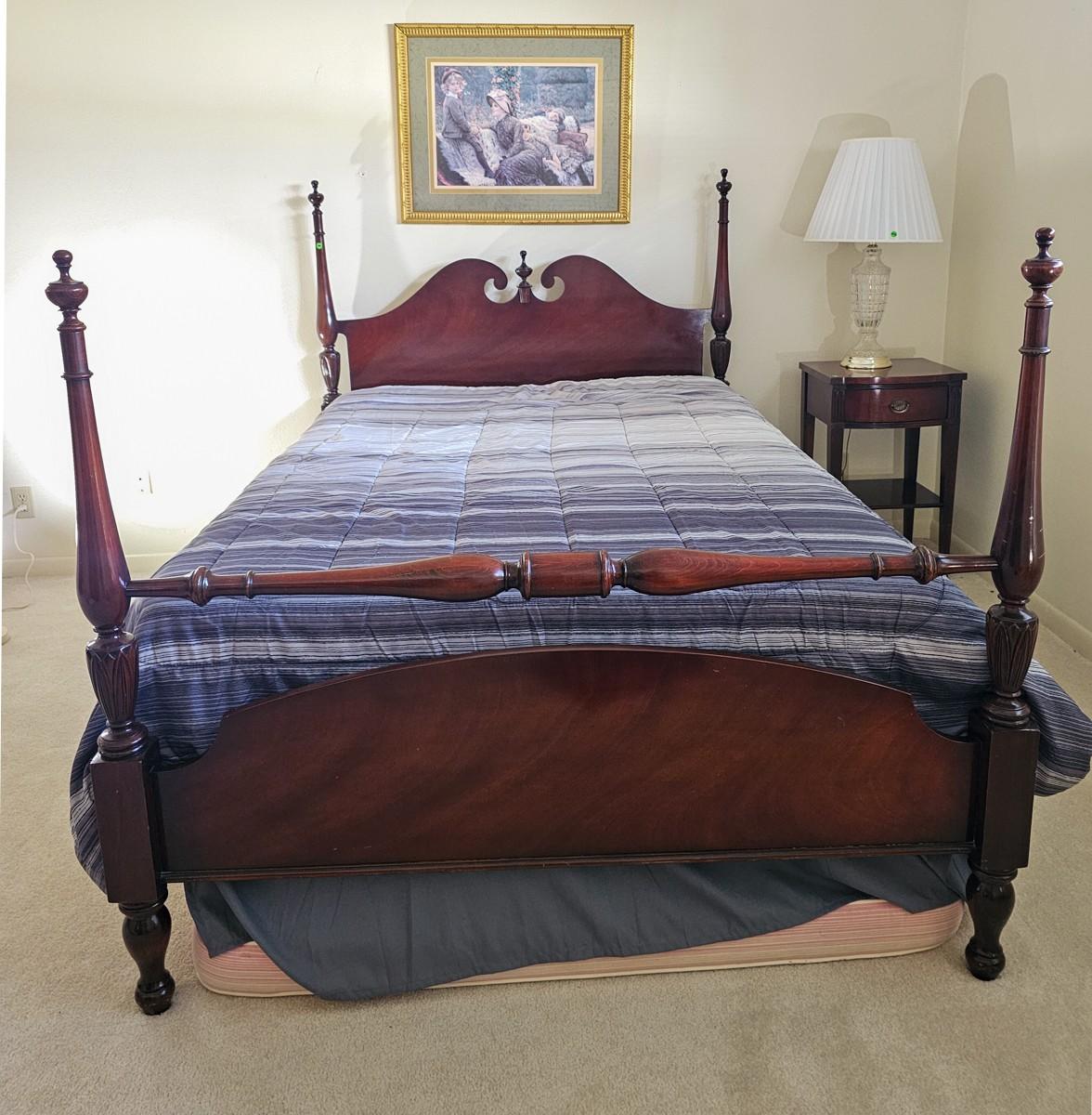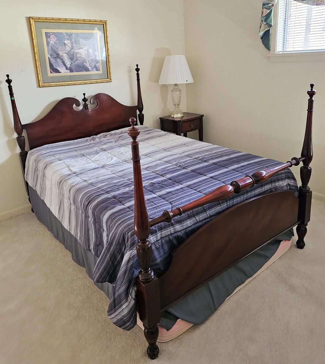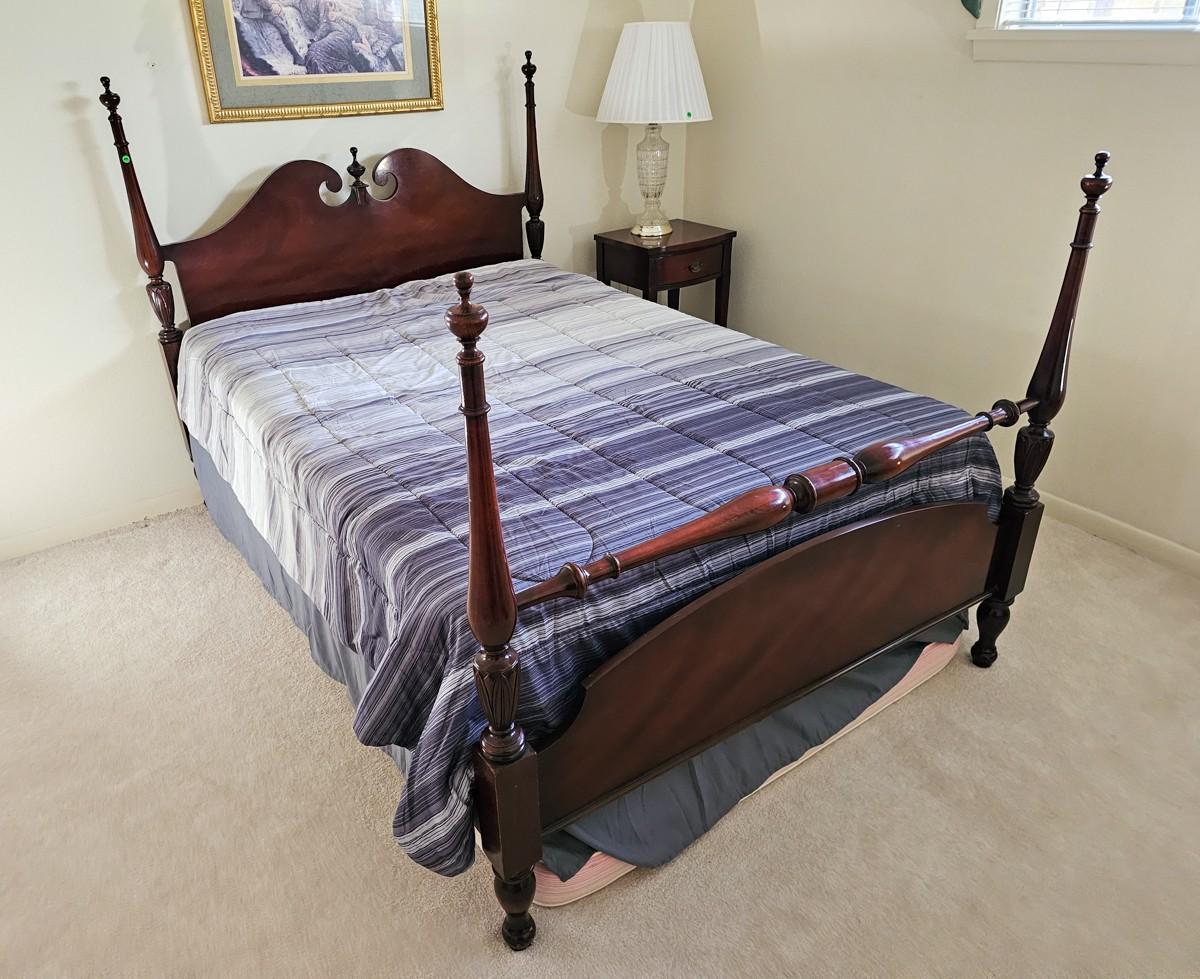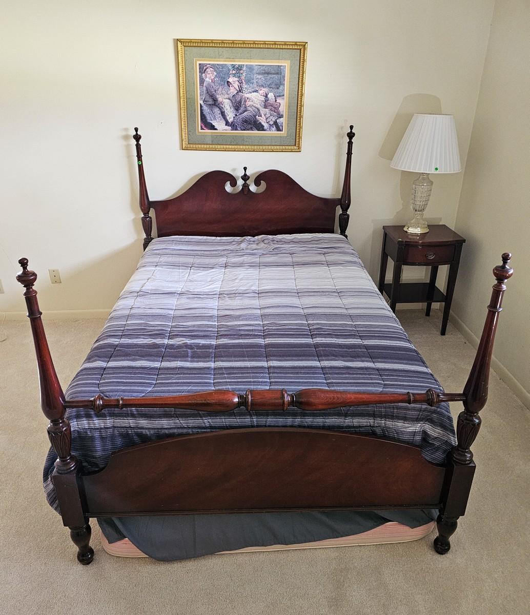 Full four poster bed by Drexel. Mattress and box springs, bedding included.