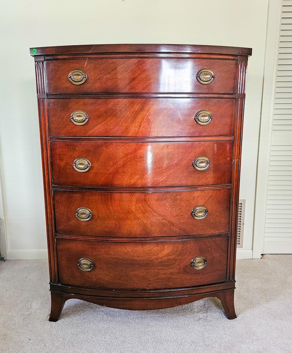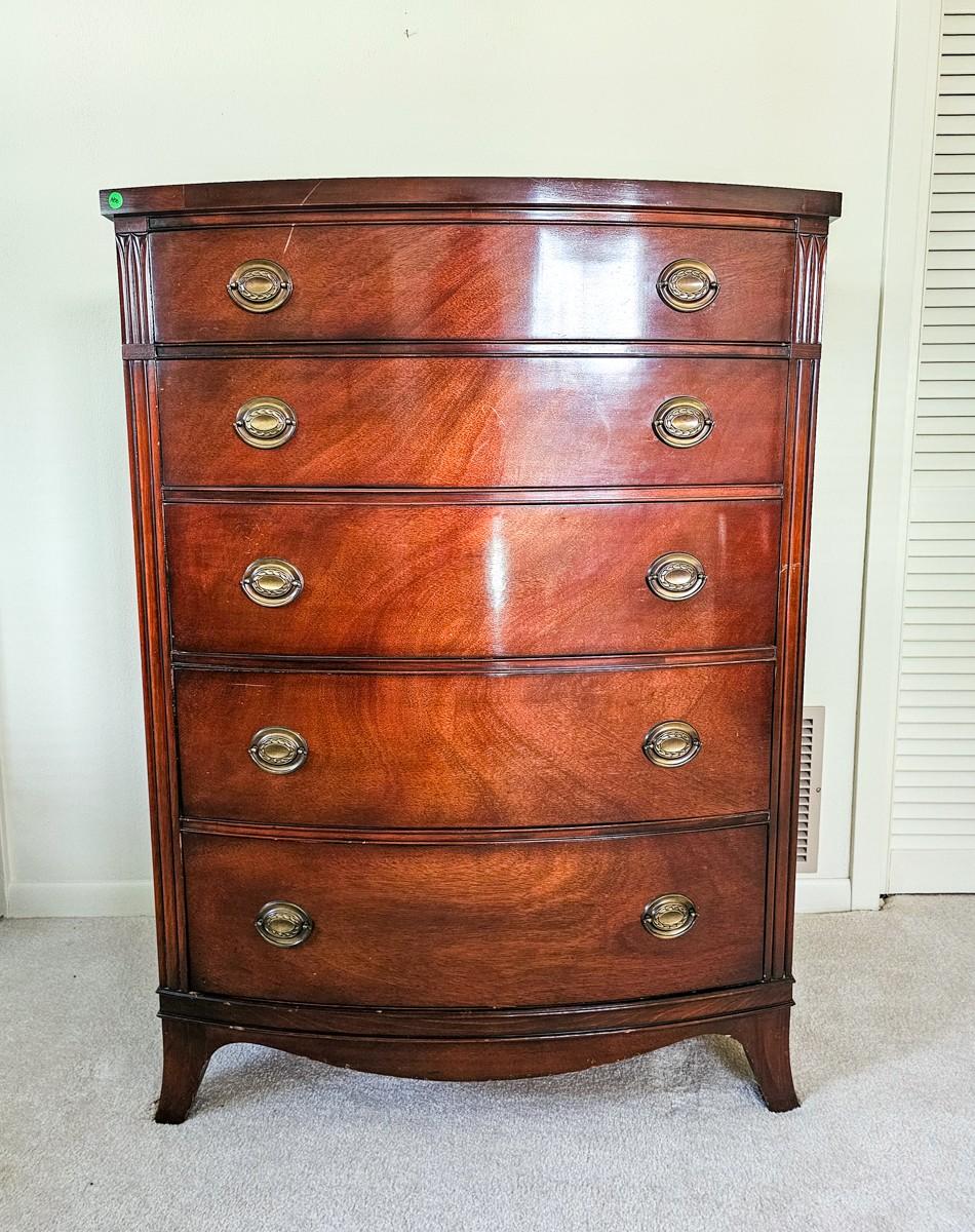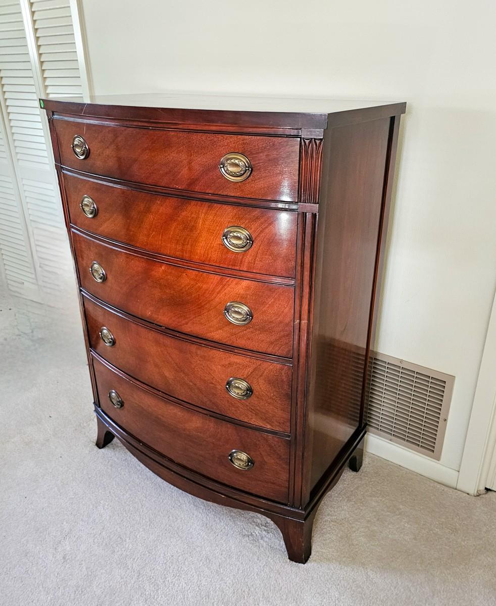 Bow front mahogany chest of drawers by Drexel. Has a few scratches, should be easy to fix with Howard's.