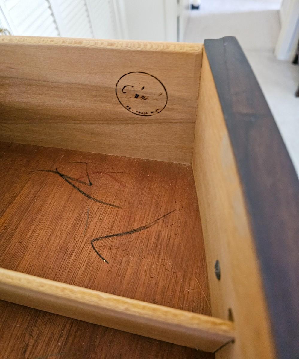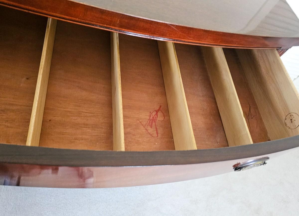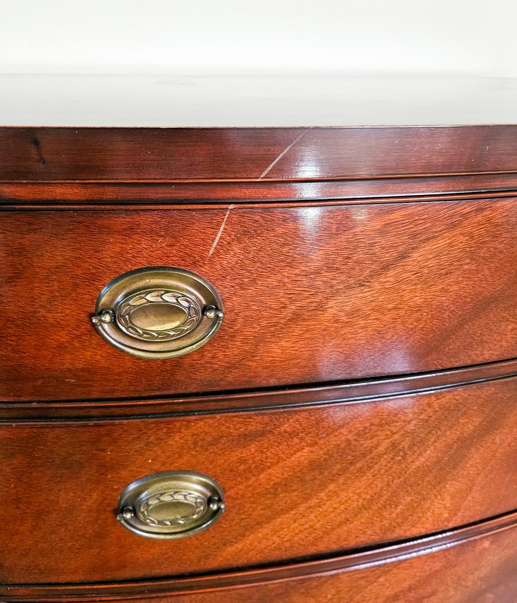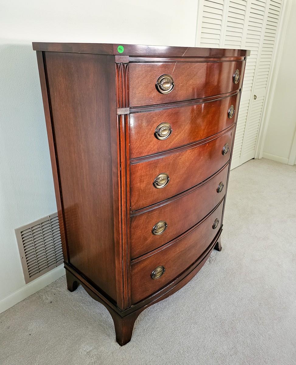 Bow front mahogany chest of drawers by Drexel. Has a few scratches, should be easy to fix with Howard's.