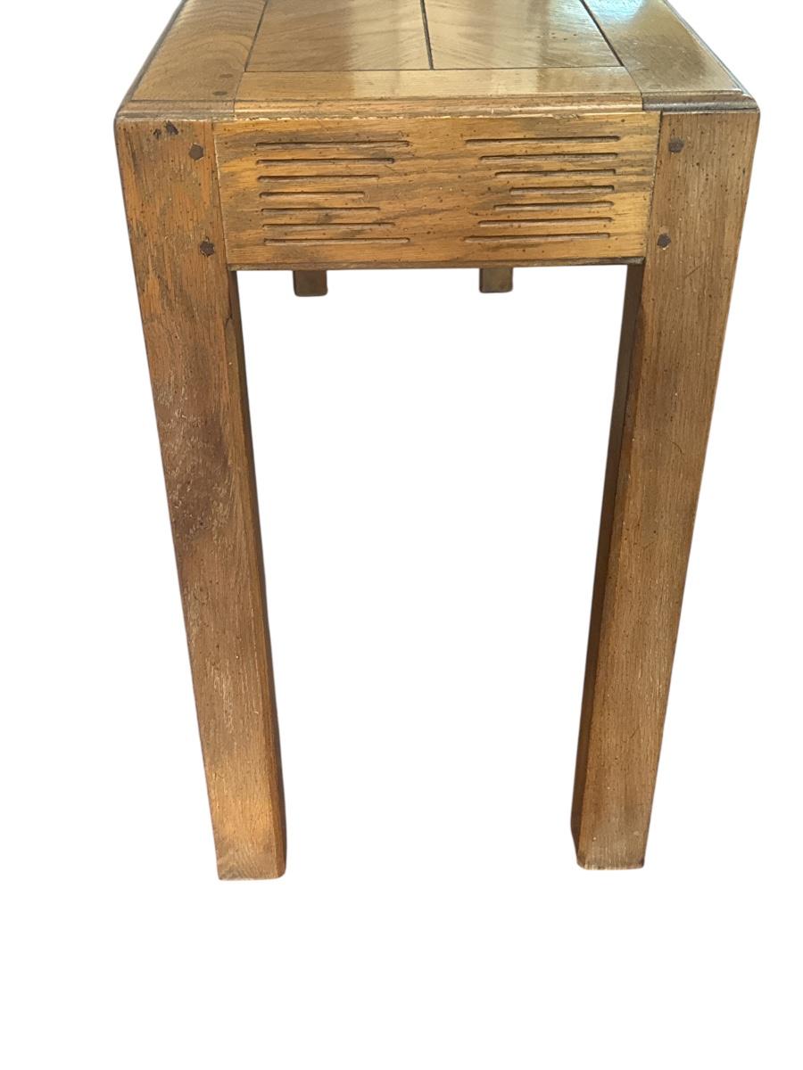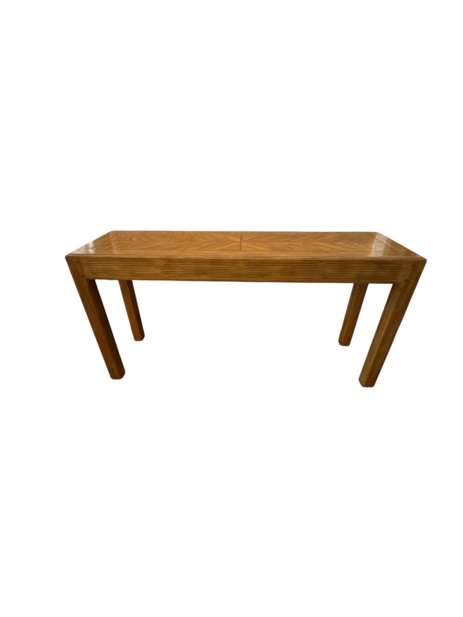 Sleek wood sofa table by Drexel Heritage with angled legs and a warm, medium finish. Features chevron-patterned veneer on top and subtle carved detailing on the sides. A classic and well-crafted piece with timeless style. Light surface wear consistent with age