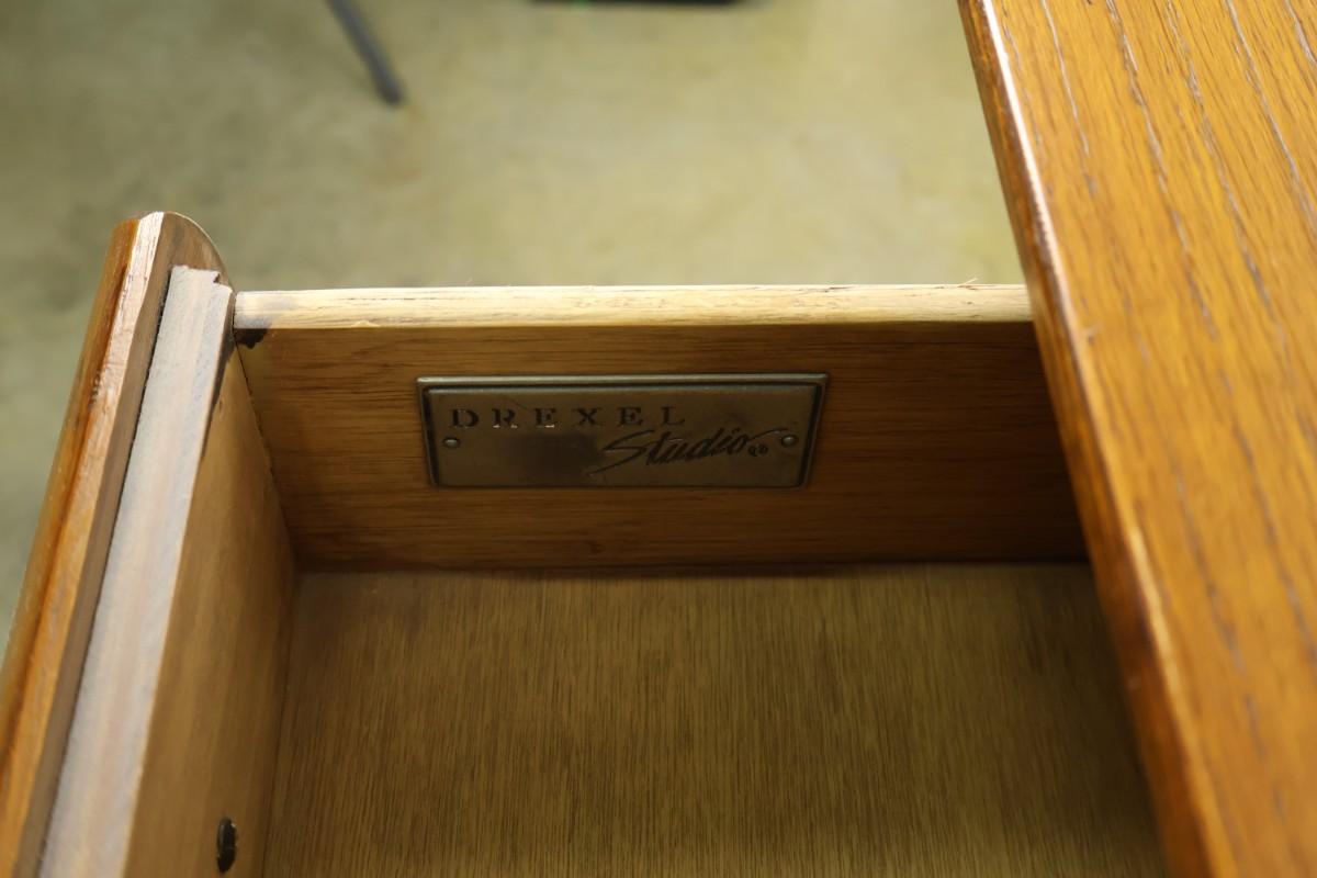 Drexel Studio one drawer side table. Drexel bland placard is on the inside of the drawer. 32" wide x 20" deep x 28" high.