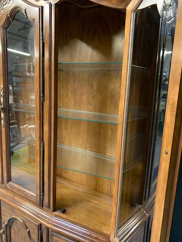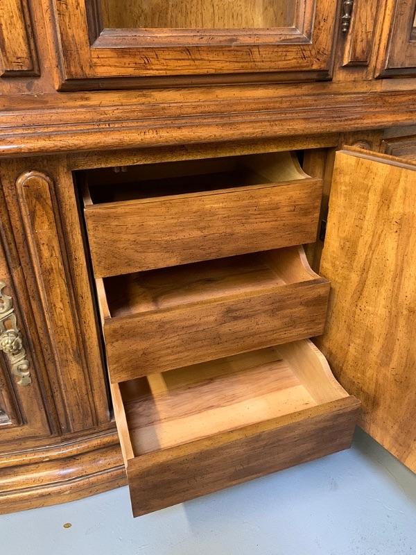 Bottom Portion: 3 Doors, Left and Right Doors have 2 Shelves in each, and middle Door has 3 Drawers.