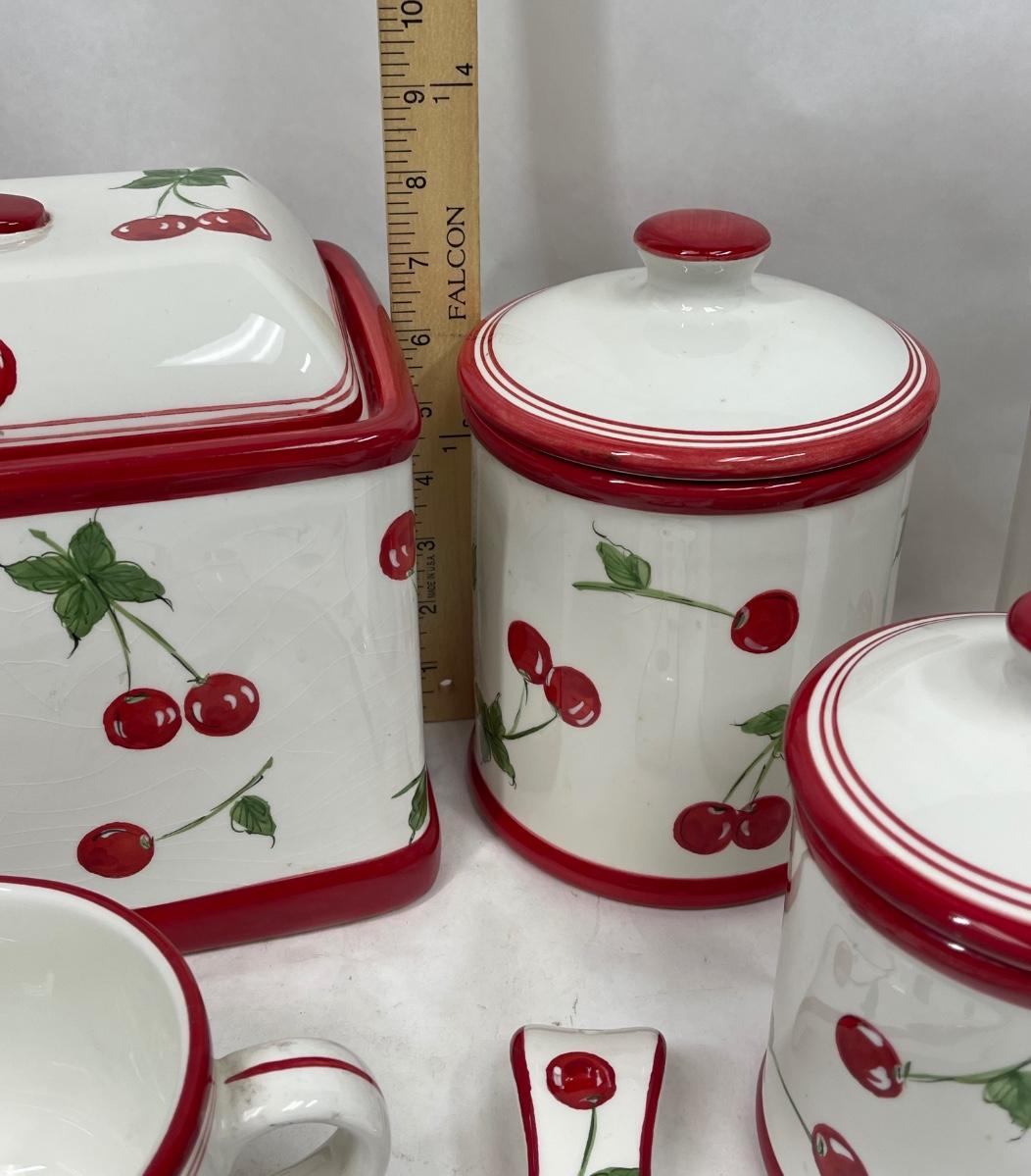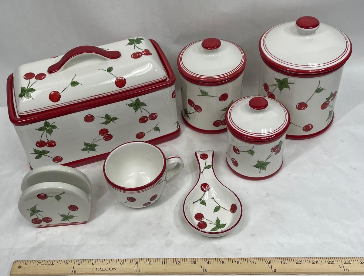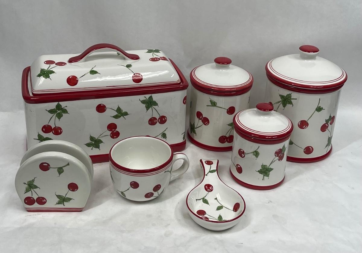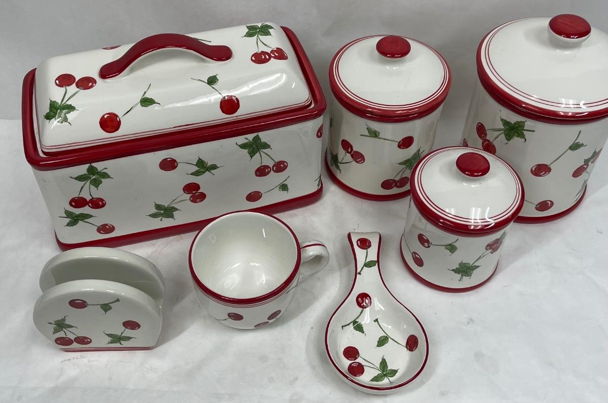 Ceramic Cherry, red & white, Kitchen Canisters, Bread Box, Spoon-rest, Napkin Holder, Mug