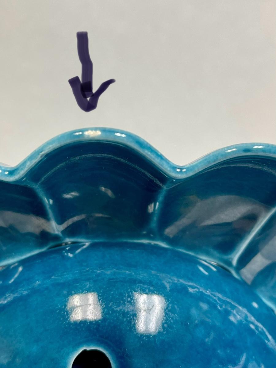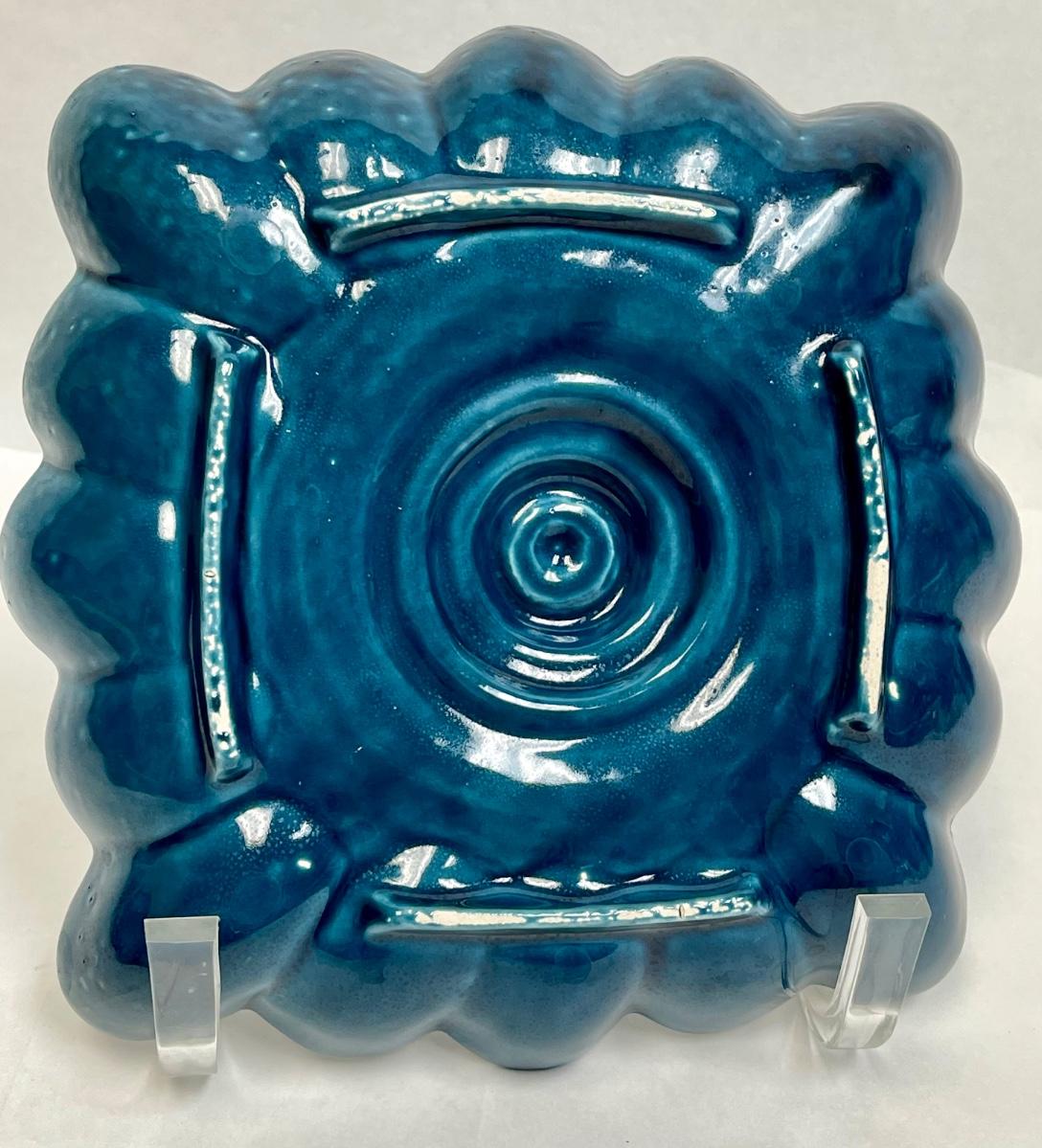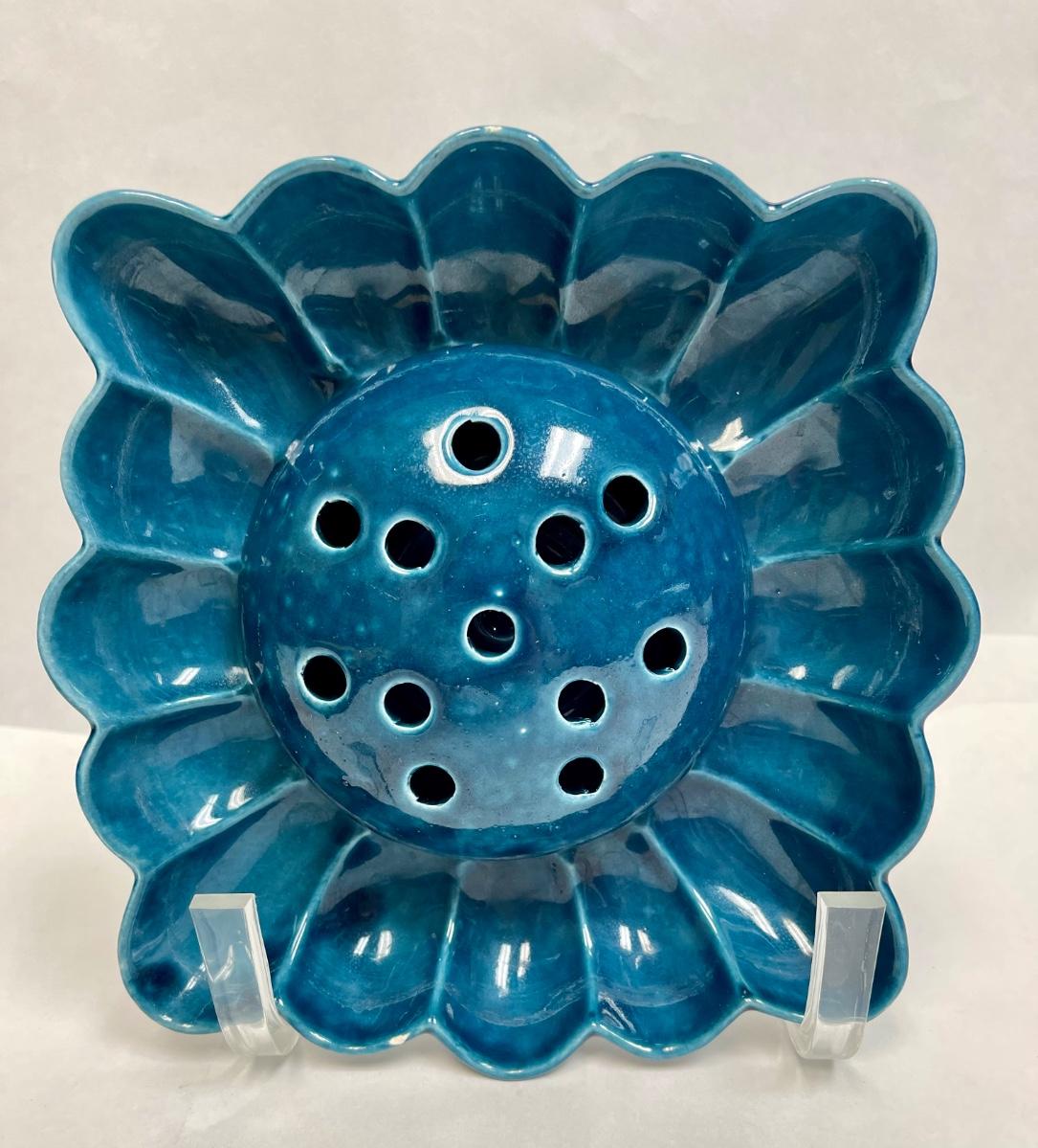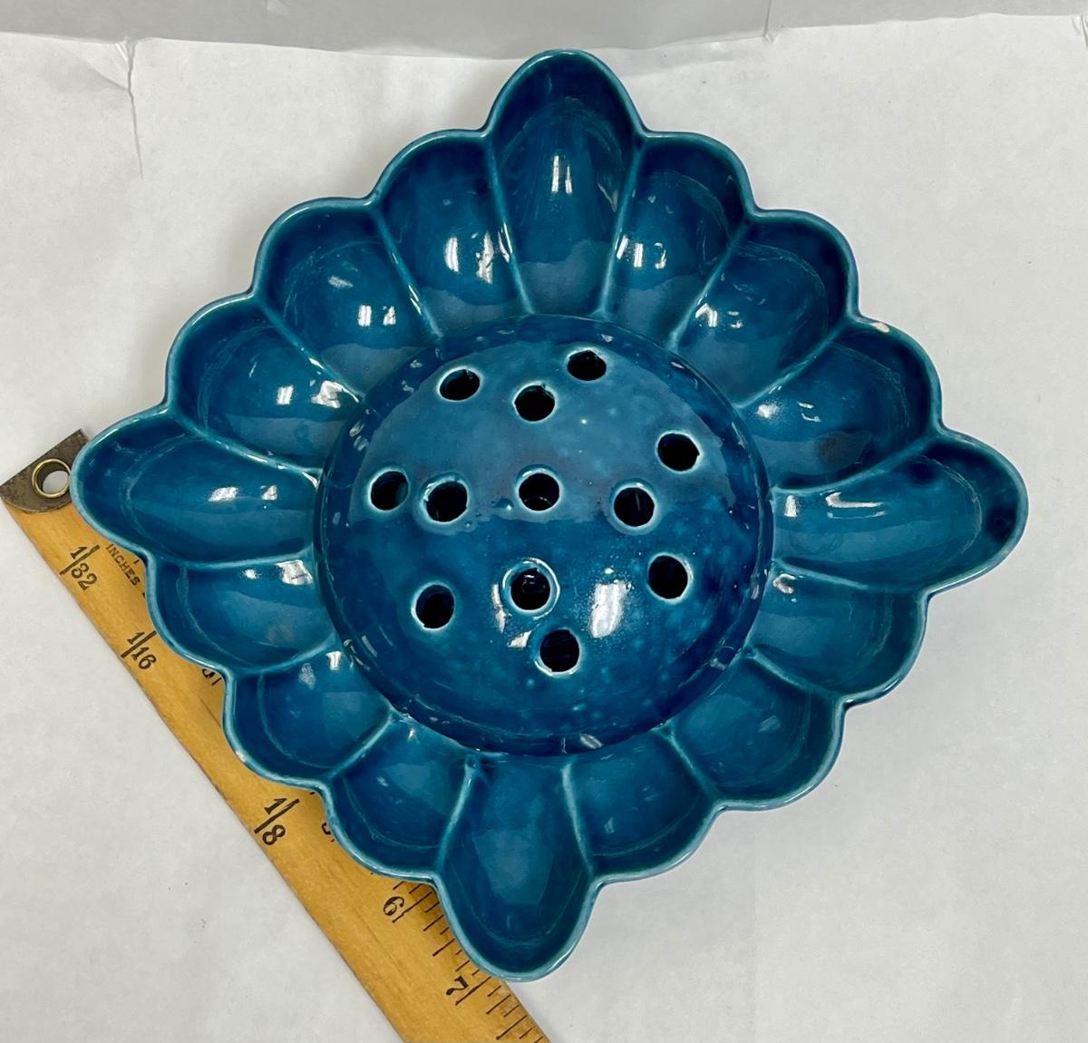 Vintage Ceramic Pottery Floral Frog Dish MCM Dark Turquoise Blue