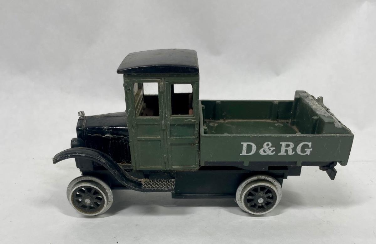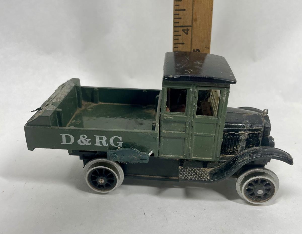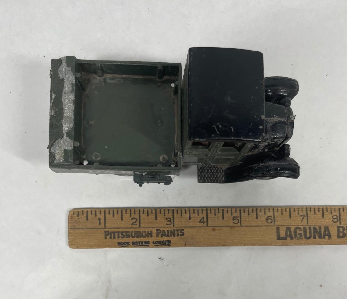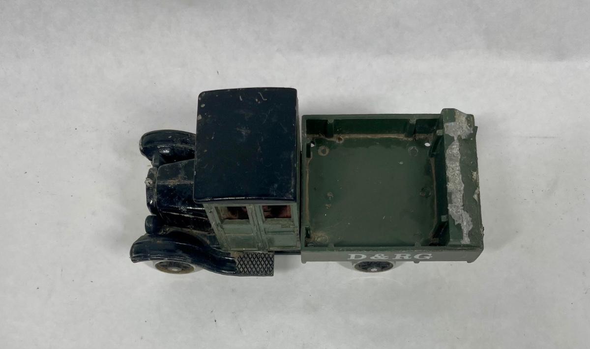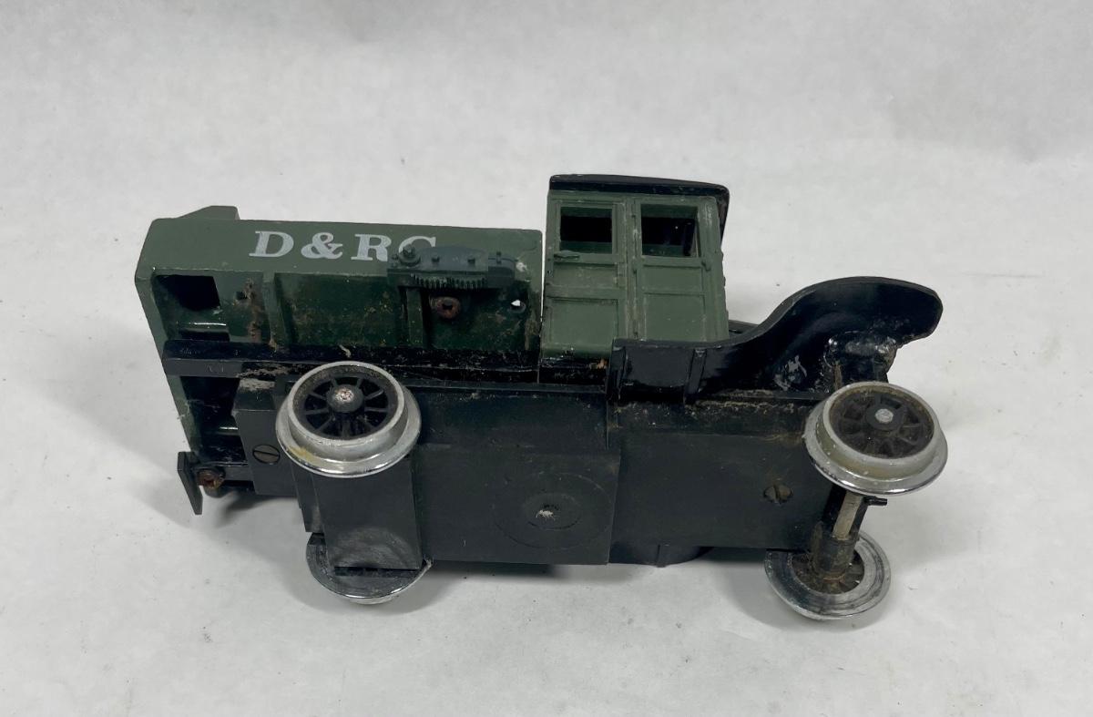 Die cast construction. Has train wheels instead of regular tires, was used by track maintenance crews. Some paint flaking but otherwise in good condition.